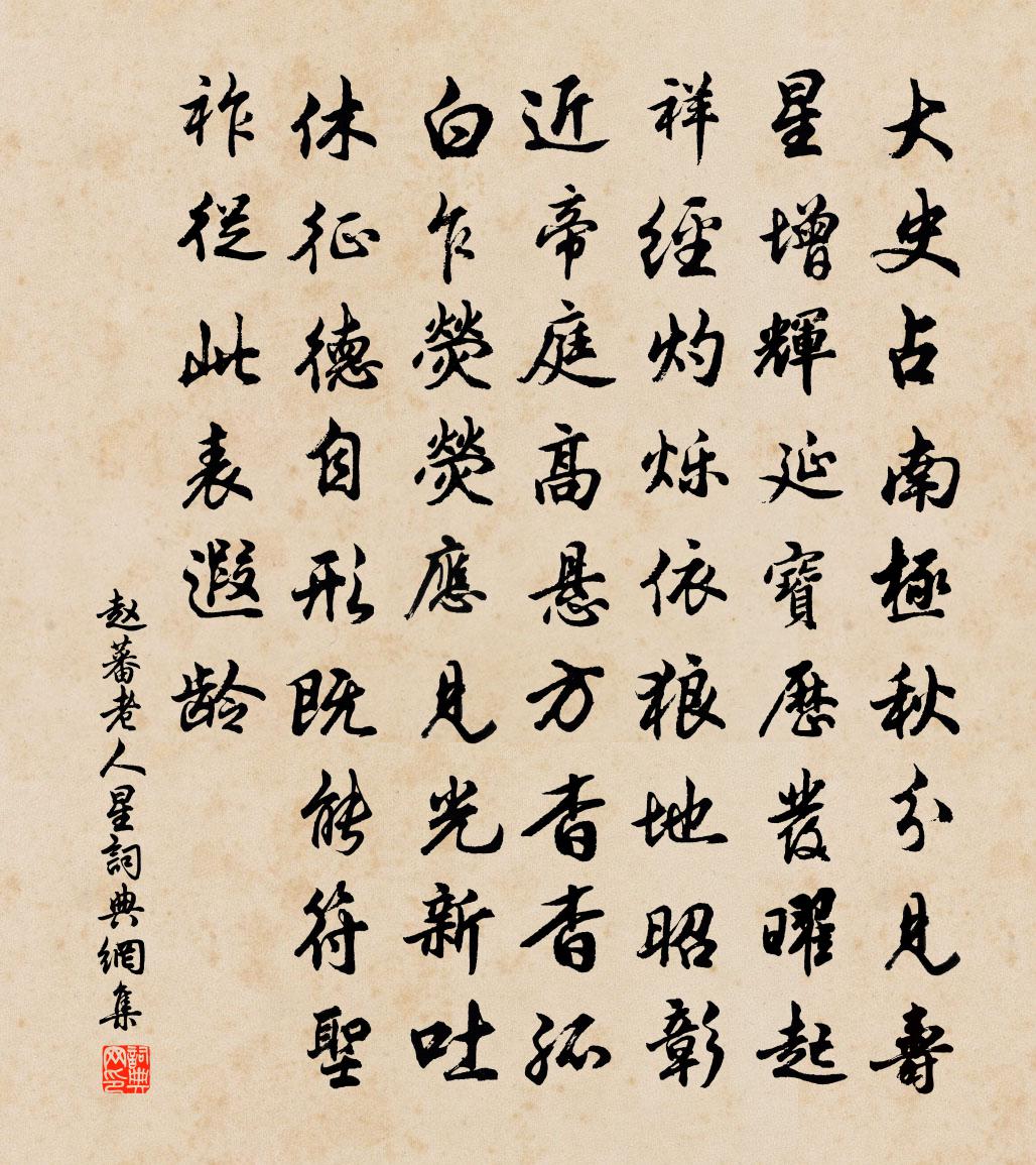 詩詞名句歷史字典書法欣賞書法字典國語詞典說文解字康熙字典古漢語字典標 題 作 者 詩 句 老人星作者:趙蕃 朝代:宋代老人星原文大史占南極,秋分見壽星。增輝延寶曆,發曜起祥經。灼爍依狼地,昭彰近帝庭。高懸方杳杳,孤白乍熒熒。應見光新吐,休徵德自形。既能符聖祚,從此表遐齡。詩詞問答問:老人星的作者是誰?答:趙蕃問:老人星寫於哪個朝代?答:宋代問:老人星是什麼體裁?答:五排趙蕃老人星書法欣賞老人星書法作品注釋全唐詩:卷484-16詩詞推薦令人王氏輓詞樓鑰〔宋代〕宦達方資助,家肥忽悼亡。一區終異室,千載尚高岡。奉倩神猶慘,安仁鬢欲蒼。黃昏愁絕處,誰伴紫微郎。初到杭州寄子由二絕蘇軾〔宋代〕聖明寬大許全身,衰病摧頹自畏人。莫上岡頭苦相望,吾方祭灶請比鄰。贈張珽鄭適〔唐代〕昔為吟風嘯月人,今為吟風嘯月身。冢壞路邊吟嘯罷,安知今日又勞神。步桐台詩江淹〔南北朝〕客子畏霜雪。憂至竟悠哉。綺帷生網羅。寶刀積塵埃。思君出漢北。鞍馬登楚台。歲彩合雲光。平原秋色來。寂聽村舍小酌陸游〔宋代〕野性安衡茅,傑屋愁耽耽。上不補縣官,下有肉食慚。雖非策雲驥,實鄙作繭蠶。失計不容悔,漁蓑換朱藍。少壯荔枝香近·送人游南徐吳文英〔宋代〕錦帶吳鉤,征思橫雁水。夜吟敲落霜紅,船傍楓橋系。相思不管年華,喚酒吳娃市。因話、駐馬新堤步秋綺。 淮滿庭芳 贊重陽真人顯異馬鈺〔元代〕憫化真人,重陽師父,頭頭物物皆通。歸期預指,語話似心風。果應南京行上,升霞後、教訓臧公。岐陽鎮,頂冠再用前韻贈高司理共八首陳造〔宋代〕蘇李宗風我雀揚,少陵公按子開堂。官曹此地文書省,詩社從今日月長。山滴曉煙收後翠,蓮漂天女戲時香。可孤送鄭務拜伯父綦毋潛〔唐代〕名公作逐臣,驅馬拂行塵。舊國問鄖子,勞歌過郢人。一川花送客,二月柳宜春。奉料竹林興,寬懷此別晨。小雪(一作可止詩)清江〔唐代〕落雪臨風不厭看,更多還恐蔽林巒。愁人正在書窗下,一片飛來一片寒。寄名山李著作范祖禹〔宋代〕劍外雖雲遠,外山信日聞。漏天常泄雨,蒙頂半藏雲。萬里飛鳧舄,三年隱豹文。茗芽春後好,應許故人分。閒詠園中草木陸游〔宋代〕一樹山櫻鳥啄殘,懸釣半舍亦甘酸。兒童採得爭來餉,應念衰翁舌本乾。自紫陽觀至華陽洞,宿侯尊師草堂,簡同游李延年劉長卿〔唐代〕石門媚煙景,句曲盤江甸。南向佳氣濃,數峰遙隱見。漸臨華陽口,雲路入蔥蒨。七曜懸洞宮,五雲抱仙殿。銀函石佛谷皇甫湜〔唐代〕澶漫花太行北,花千里一塊花石。平腹有壑谷,深廣數百尺。土僧何為者,老草花發白。寢處容身龕,足膝隱成跡頌古二十四首釋宗演〔宋代〕善財童子採來親,大智文殊用得靈。今日青山端午節,不勞拈出再施呈。題上饒半月岩四絕胡寅〔宋代〕瓊樓玉宇匝天開,織女天孫靜往來。月姊故應羞老退,譴除私館墮岩隈。慶江檢詳太夫人潛放〔宋代〕君王宣室正興思,尺一催歸四輩馳。壽宴明年當此日,蟠桃宣勸在瑤池。所思(得台州鄭司戶虔訊息)杜甫〔唐代〕鄭老身仍竄,台州信所傳。為農山澗曲,臥病海雲邊。世已疏儒素,人猶乞酒錢。徒勞望牛斗,無計劚龍泉。除夜戴復古〔宋代〕掃除茅舍滌塵囂,一炷清香拜九霄。萬物迎春送殘臘,一年結局在今宵。生盆火烈轟鳴竹,守歲筵開聽頌椒。野客粉蝶兒曹冠〔宋代〕繞舍清陰,還是暮春天氣。遍蒼苔、亂紅堆砌。問留春不住,春怎知人意。最關情,雲杪杜鵑聲碎。休怨春歸,四名句推薦欲吊沉累無所,但有漁兒樵子,哀此寫離憂。張孝祥《水調歌頭·過岳陽樓作》 綠葉紫裹,丹莖白蒂。宋玉《高唐賦》 渭北春天樹,江東日暮雲。杜甫《春日憶李白》 歸師勿掩,窮寇莫追。羅貫中《三國演義·第九十五回》 少年辛苦終身事,莫向光陰惰寸功。杜荀鶴《題弟侄書堂》 事莫貴乎有驗,言莫棄乎無徴。徐幹《中論·上卷·貴驗》 水天清話,院靜人銷夏。項鴻祚《清平樂·池上納涼》 那裡是清江江上村,香閨里冷落誰瞅問?好一個憔悴的憑欄人。關漢卿《大德歌·冬》 嫦娥應悔偷靈藥,碧海青天夜夜心。李商隱《嫦娥》 四海無閒田,農夫猶餓死。李紳《古風二首 / 憫農二首》