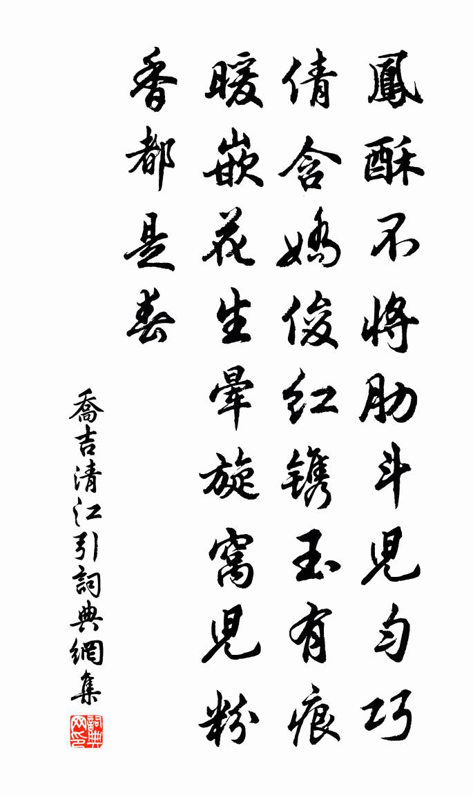 詩詞名句歷史字典書法欣賞書法字典國語詞典說文解字康熙字典古漢語字典標 題 作 者 詩 句 清江引作者:喬吉 朝代:元代清江引原文鳳酥不將肋斗兒勻,巧倩含嬌俊。紅鐫玉有痕,暖嵌花生暈。旋窩兒粉香都是春。詩詞問答問:清江引的作者是誰?答:喬吉問:清江引寫於哪個朝代?答:元代問:清江引是什麼體裁?答:散曲問:喬吉的名句有哪些?答:喬吉名句大全喬吉清江引書法欣賞清江引書法作品詩詞推薦夏中即事俞桂〔宋代〕重梅過了猶慳雨,幸有南薰在以槐。燕子亦於貧者薄,今年全不見飛來。依韻和長安龍圖陳學士登煕煕台之什二首魏野〔宋代〕鶉野龍圖陳學士,迎秋登眺稱英奇。一聲玉管風流處,百尺金台雨霽時。雲近上清爭縹緲,山連太白斗參差。碧紗絕句張嵲〔宋代〕犖确南山路,叢筠冒水生。寒梅銷落盡,猶有數花明。黃花王安石〔宋代〕四月揚州芍藥多,先時為別苦風波。還家忽忽驚秋色,獨見黃花出短莎。讀郭文舉傳釋文珦〔宋代〕眾人務苟合,達士羞雷同。不可相為謀,真成馬牛風。我愛郭文舉,乾坤一冥鴻。和澗上丈人石淙作依元韻晁說之〔宋代〕岷江將入海,金山中斥攫。近樵得雁盪,平地風落落。獰兒一稱絕,如夔理舜樂。那知嵩石淙,視彼削則削。兩處挽蔡晉如晃沖之〔宋代〕南部清笳咽,東門素旐飛。如何一老沒,不及二疏歸。宇宙那復見,死生從此遠。吾年未四十,已嘆故人稀。茶花二首蘇轍〔宋代〕細嚼花須味亦長,新芽一粟葉間藏。稍經臘雪侵肌瘦,旋得春雷發地狂。開落空山誰比數,烝烹來歲最先嘗。枝枯和使君王子堅游鄧氏天開圖畫韻程公許〔宋代〕春風滿城關笑顏,使君明當出遊山。東州山川北佳麗,凌雲耀日季孟間。紫絲步障元不要,飛檻層欄一憑眺。歲豐過蘇祿東王墓顧炎武〔清代〕豐碑遙見炳奎題,尚憶先朝寵日殫。世有國人供灑掃,每勤詞客駐輪蹄。九河水壯龍狐出,十二城荒向鶴棲。下馬如吳興舟中讀白樂天詩有作張嵲〔宋代〕離離雲樹泛朝艤,十月江南未變衰。縱櫂千尋霅溪水,散懷一卷樂天詩。平生名宦休回顧,隨分追游且自欺。不敢答尉遲少尹問所須白居易〔唐代〕乍到頻勞問所須,所須非玉亦非珠。愛君水閣宜閒詠,每有詩成許去無?中都之嘉會門陳亦顏為堂日城南書院取韓文公曾豐〔宋代〕買宅猶難況買隣,一區判與九衢親。那知萬壑千岩性,不受高車駟馬塵。乙巳邵武建寧夜坐書呈諸公陳普〔宋代〕盱豫悔成緣悔遲,往蹇來反又何疑。雞鳴一念清如水,正是籧篨可俯時。和游歸來園韻廖行之〔宋代〕簿書叢里厭紛埃,夙駕輶軒此地來。好是板輿將母樂,不妨樽酒為花開。難拚勝賞喔詩適,生怕嚴城打鼓催。明日宜春苑王安石〔宋代〕宜春舊台沼,日暮一登臨。解帶行蒼蘚,移身坐綠陰。樹疏啼鳥遠,水靜落花深。無復增修事,君王惜費金。寄剡縣主簿羅隱〔唐代〕金庭養真地,珠篆會稽官。境勝堪長往,時危喜暫安。洞連滄海闊,山擁赤城寒。他日拋塵土,因君擬煉丹。浣溪沙(同上)蘇軾〔宋代〕芍藥櫻花兩斗新。名園高會送芳辰。洛陽初夏廣陵春。紅玉半開菩薩面,丹砂濃點柳枝唇。尊前還有箇中人。題敬愛詩後李和風〔唐代〕高唐不是這高塘,淮畔荊南各異方。若向此中求薦枕,參差笑殺楚襄王。寄甘孝先二首王大受〔宋代〕古戌相從已許年,中間轉徒廢書傳。似聞南柵溪邊柳,準擬君來擊酒船。名句推薦不忍登高臨遠,望故鄉渺邈,歸思難收。柳永《八聲甘州·對瀟瀟暮雨灑江天》 烏鵲倦棲,魚龍驚起,星斗掛垂楊。陳亮《一叢花·溪堂玩月作》 萬種思量,多方開解,只恁寂寞厭厭地。柳永《憶帝京·薄衾小枕涼天氣》 白日地中出,黃河天外來。張蠙《登單于台》 鵲橋波里出,龍車霄外飛。任希古《和長孫秘監七夕》 吳洲如見月,千里幸相思。李白《送張舍人之江東》 逐流牽荇葉,緣岸摘蘆苗。儲光羲《江南曲四首》 此身行作稽山土,猶吊遺蹤一泫然。陸游《沈園二首》 名無細而不聞,行無隱而不彰。劉向《列女傳·節義傳·周主忠妾》 波面澄霞,蘭艇采香去。高觀國《祝英台近·荷花》