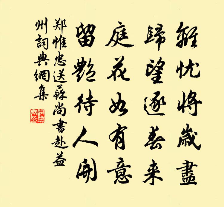 詩詞名句歷史字典書法欣賞書法字典國語詞典說文解字康熙字典古漢語字典標 題 作 者 詩 句 送蘇尚書赴益州作者:鄭惟忠 朝代:唐代送蘇尚書赴益州原文離憂將歲盡,歸望逐春來。庭花如有意,留艷待人開。詩詞問答問:送蘇尚書赴益州的作者是誰?答:鄭惟忠問:送蘇尚書赴益州寫於哪個朝代?答:唐代問:送蘇尚書赴益州是什麼體裁?答:五絕鄭惟忠送蘇尚書赴益州書法欣賞送蘇尚書赴益州書法作品注釋全唐詩:卷45_8詩詞推薦又登碧雲亭感懷三十首吳芾〔宋代〕晚上危亭眼暫明,風煙濃淡媚郊坰。箇中妙處吟難盡,分付人間作畫屏。拜年人蘇泂〔宋代〕小年躑躅隨群隊,長大悲傷怕物華。爇罷天香天影室,不行人事便歸家。贈相士李山屋方回〔宋代〕四十五萬坑長平,五十六萬敗彭城。頭小而銳重瞳子,可謂善虞能用兵。 * 何得慘如此,不知天亦還殺爾。世間念奴嬌佚名〔宋代〕乘興折取一枝,滿身蘭麝。曉晴發蕪湖吳波亭二首楊萬里〔宋代〕雨來初做養禾天,雨久還成害稼年。今日一晴無準在,金鴉飛出卯牌前。曾無逸郎中名燕居曰和三續社有詩次韻樓鑰〔宋代〕通地通天只箇中,千岐雖別大都同。兩家偶爾流傳盛,一貫臨之內外融。欲境掃開心在我,浮雲散盡月當空。感而送同年李教秩滿歸閩趙汝鐩〔宋代〕雁塔同題久,相看兩鬢皤。功名皆分定,安樂直錢多。絳帳歸來後,青山住得麽。時流推老筆,冊府欠編摩。送韓建寧赴召二首趙蕃〔宋代〕憶公典選繼昌黎,是我學人行卷時。香火奉祠雖觖望,簿書棲邑尚淹期。長年敢有飄零恨,末路欣逢陶冶私。自度偈頌二百零五首釋正覺〔宋代〕清白傳家雪月光,玉壺中有轉身方。情乾識盡功勳斷,不覺全身入帝鄉。泗上楊時〔宋代〕聞道河流閉,逢人每問津。天高雲羃羃,風細水鱗鱗。未種江陵橘,空思千里蓴。且邀明月伴,相對解綸巾。寄三城王宣徽二首邵雍〔宋代〕路上塵方坌,壺中花正開。何須頭盡白,然後賦歸來。偈頌二十四首釋智遇〔宋代〕虎憎雞嘴,聞者畏之。後人衡鑑不高,喚作二俱弄險。水調歌頭佚名〔宋代〕應三元,先五日,慶生申。贈醫官吳將使陳郁〔宋代〕不合生來愛苦吟,書淫傳達室癖到於今。江湖未遇醫治手,煩向詩脾謾一鍼。次韻答友人四首仲並〔宋代〕頗憶高人相與閒,扁舟誰與趣公還。杯行欸乃歌聲底,客坐參差帆影間。多病扶攜新几杖,平生契好舊湖山。未容贈楊著(一作著作)徐夤〔唐代〕藻麗熒煌冠士林,白華榮養有曾參。十年去里荊門改,八歲能詩相座吟。李廣不侯身漸老,子山操賦恨何深。釣魚擬韋應物殘燈梅堯臣〔宋代〕照此寒夜中,欲殘紅燼尾。空堂滅復明,獨宿擬山鬼。河間王安石〔宋代〕北行麻出河間,麻千歲想賢麻王。胡麻生蓬中,詰曲終自傷。好德尚如此,恃材宜見戕。乃知陰自修,彼不為傾商謁遺愛王詞二首岳珂〔宋代〕大帝開江左,謀臣守四方。興邦有喬木,遺愛尚甘棠。日月扶聲烈,山川詫郁蒼。中原知極目,應慨舊封疆。次韻弟茂通效行見梅范浚〔宋代〕好風催冷蕊,上番即芳葩。春色獨先得,年芳誰復別。日邊看暖艷,雪後識真花。吟玩歸來晚,江村月照沙。名句推薦壯年何事憔悴,華發改朱顏。蘇舜欽《水調歌頭·滄浪亭》 我住長江頭,君住長江尾。李之儀《卜運算元·我住長江頭》 還與去年人,共藉西湖草。蘇軾《卜運算元·感舊》 眼覷著災傷教我沒是處,只落得雪滿頭顱。張養浩《一枝花·詠喜雨》 福無雙至,禍不單行。張南莊《何典·第三回》 昨夜狂風度,吹折江頭樹李白《長干行二首》 忍淚佯低面,含羞半斂眉。韋莊《女冠子·四月十七》 門外垂楊岸側,畫橋誰系蘭舟。万俟詠《木蘭花慢·恨鶯花漸老》 冰雪襟懷,琉璃世界,夜氣清如許。黃升《酹江月·夜涼》 狡兔盡則良犬烹,敵國滅則謀臣亡。韓非及後人《韓非子·內儲說下六微》