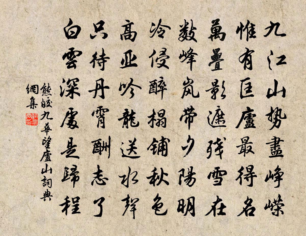 詩詞名句歷史字典書法欣賞書法字典國語詞典說文解字康熙字典古漢語字典標 題 作 者 詩 句 九華望廬山作者:熊皎 朝代:唐代九華望廬山原文九江山勢盡崢嶸,惟有匡廬最得名。萬疊影遮殘雪在,數峰嵐帶夕陽明。冷侵醉榻鋪秋色,高亞吟龍送水聲。只待丹霄酬志了,白雲深處是歸程。詩詞問答問:九華望廬山的作者是誰?答:熊皎問:九華望廬山寫於哪個朝代?答:唐代問:九華望廬山是什麼體裁?答:七律熊皎九華望廬山書法欣賞九華望廬山書法作品注釋全唐詩:卷886-16詩詞推薦送聖民出城即事張耒〔宋代〕東風堤上送行人,漸出城來漸少塵。柳色已深花又落,客來下馬獨傷春。甲申四月甲子夜夢以焦坑小團及宜春新芽送隆周必大〔宋代〕達上座,惺惺著,靈根一點便通神,敗葉千林都掃卻。送鮮于萬州遷巴州(鮮于炅乃仲通子,有父風)杜甫〔唐代〕京兆先時傑,琳琅照一門。朝廷偏注意,接近與名藩。祖帳排舟數,寒江觸石喧。看君妙為政,他日有殊恩。賀宋嗣宗除岳陽守五絕史堯弼〔宋代〕太息滕侯績未成,尚須堤土作湖扃。萬艘丹檻屯江浦,千尺長虹鎖洞庭。程待制輓詩虞儔〔宋代〕科第聯三世,聲名動九垓。激昂存壯志,盤錯見奇才。往者分邊閫,胡然避憲台。教忠知有待,餘慶接三台。和宮師陳相公宋祁〔宋代〕公辭四輔貴,才營三畝園。此地山林樂,當年廊廟尊。庭花有新複,郊禽無近翻。孰喻治窮僻,乃符蕭相言。射殿引諸班出官人拽垛子二首魏了翁〔宋代〕畫簾黃幄幕前扉,俠陛渾如後殿儀。只自起居更履後,卻陪二府立多時。賀新郎佚名〔宋代〕蘇子秋七月。向涼宵、扁舟與客,共游赤壁。清吹徐來波不動,舉酒誦詩屬客。白露與、水光相接。萬頃茫茫風浩居厚弟示和詩複課十首劉克莊〔宋代〕古書時務了無關,卻悔胸中萬卷蟠。尚可追陪鷗鳥社,安能生死蠹魚間。毀言自嘆今銷骨,戇草誰憐昔犯顏。聖主天都峰范成大〔宋代〕維帝有下都,作鎮此南國。孤撐紫玉樓,橫絕太霄碧。晶熒砂竇紅,夭矯泉紳白。晴雲無盡藏,竟日裊幽石。諸峰觀化十五首黃庭堅〔宋代〕一原風俗異衣裘,流落來從綿上州。未到清明先禁火,還依桑下系千秋。長木晚興陸游〔宋代〕沮水嶓山名古今,聊將行役當登臨。斷橋煙雨梅花瘦,絕澗風霜槲葉深。末路清愁常袞袞,殘冬急景易駸駸。故巢逆境風返順和東翔侄韻陽枋〔宋代〕觀國丹心切,橫舟綠水遲。東君如有意,風返曉江吹。雜曲歌辭。伊川歌第二佚名〔唐代〕彤闈曉辟萬鞍回,玉輅春遊薄晚開。渭北清光搖草樹,州南嘉景入樓台。段元衡出示與晦翁九日登紫霄峰詩及手帖並及趙蕃〔宋代〕文章定價如金玉,入手可知高與低。今代師儒晦庵老,許君先達並江西。正冬御殿上壽樂章八首其四皇帝第三爵酒登歌楊億〔宋代〕矯矯長離,振羽來儀。和音中律,藻翰揚輝。珍符沓至,品物修宜。至德玄感,受天之祺。寒食夜池上對月懷友雍陶〔唐代〕人間多別離,處處是相思。海內無煙夜,天涯有月時。跳魚翻荇葉,驚鵲出花枝。親友皆千里,三更獨繞池。季秋既望吾族子侄以老人會於我家名日燕老集陳著〔宋代〕颯颯西風來,吹不開眉端。團團空中月,照不見肺肝。菊花仍舊香,過雁秋年年。我懷人得知,流光逝如川。況此耿天騭惠梨次韻奉酬三首王安石〔宋代〕桐鄉山遠復川長,紫翠連城碧滿隍。今日桐鄉誰愛我,當時我自愛桐鄉。高齋小飲戲作陸游〔宋代〕梅花又發鬼門關,坐覺春風萬里寬。荔子陰中時縱酒,竹枝聲里強追歡。丁年漢使殊方老,子夜吳歌昨夢殘。白帝名句推薦舉善從諫,在上之明規; 進賢謁言,為臣之令范。姚思廉《陳書·本紀·卷五》 天地合而萬物生,陰陽接而變化起,性偽合而天下治。荀子《荀子·禮論》 人事有代謝,往來成古今。孟浩然《與諸子登峴山》 長風連日作大浪,不能廢人運酒舫。元結《石魚湖上醉歌》 東風惆悵欲清明,公子橋邊沉醉。張泌《滿宮花·花正芳》 最是人間留不住,朱顏辭鏡花辭樹。王國維《蝶戀花·閱盡天涯離別苦》 春到南樓雪盡。驚動燈期花信。万俟詠《昭君怨·春到南樓雪盡》 才大者,望自大。人所服,非言大。李毓秀《弟子規·泛愛眾》 捐軀赴國難,視死忽如歸!曹植《白馬篇》 白日來深殿,青雲滿後塵杜甫《寄李十二白二十韻》