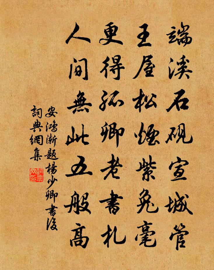 詩詞名句歷史字典書法欣賞書法字典國語詞典說文解字康熙字典古漢語字典標 題 作 者 詩 句 題楊少卿書後作者:安鴻漸 朝代:唐代題楊少卿書後原文端溪石硯宣城管,王屋松煙紫兔毫。更得孤卿老書札,人間無此五般高。詩詞問答問:題楊少卿書後的作者是誰?答:安鴻漸問:題楊少卿書後寫於哪個朝代?答:唐代問:題楊少卿書後是什麼體裁?答:七絕安鴻漸題楊少卿書後書法欣賞題楊少卿書後書法作品注釋全唐詩:卷770-9詩詞推薦粉蝶兒姬翼〔元代〕薄利浮名,抵死向前忙乾。更光陰、暗中催斷。傀儡棚,詳*弄,般成公案。下場時,盡盧都、不堪重看。風遞晨先兩國初忌文天祥〔宋代〕北風吹黃花,落木寒蕭颼。哀哀我慈母,玉化炎海秋。日月水東流,音容隔悠悠。小祥哭下邳,大祥哭幽州。今此上元前四日宣召賞梅曹勛〔宋代〕冉冉東風春乍回,睿思宣入禁中來。忽參鼻觀清香徹,殊喜一庭都是梅。次酬胡編校賦竹屋劉黻〔宋代〕紫氣曾臨屋有光,老僧相對說修藏。貌癯漸覺衣冠古,交淡誰知道誼常。文類錦機君獨艷,才如襪線我無長。近來呈黃建州劉克莊〔宋代〕當年虎穴挺身臨,匹馬平欺萬綠林。余欲關弓常掩涕,汝能賣劍即回心。歌廉民已嗟來暮,微管吾安得至今。欲謁句李公寅〔宋代〕嶺分東粵封疆闊,天限中原氣象雄。宿高唐州文天祥〔宋代〕早發東阿縣,暮宿高唐州。哲人達幾微,志士懷隱憂。山河已歷歷,天地空悠悠。孤館一夜宿,北風吹白頭。偈頌一百二十三首釋崇岳〔宋代〕今朝五月五,粗言及細語。會得也尋常,不會超佛祖。初夏三司直宿宋庠〔宋代〕薰序更朱簽,宵弦落翠蓂。人同散騎直,天與大夫醒。鞅掌曹留事,羈孤坐刻銘。整冠誰辨謗,隱几獨忘形。夜色句劉興祖〔宋代〕無人重高節,徒自抱貞心。訴衷情楊炎正〔宋代〕露珠點點欲團霜。分冷與紗窗。錦書不到腸斷,煙水隔茫茫。征燕盡,塞鴻翔。睇風檣。闌乾曲處,又是一番,倚和僧廣實三首王之道〔宋代〕動容俱見古人情,千里歸來得我驚。七載何曾有離別,水中明月本相親。頌古一百則釋正覺〔宋代〕凍眠雪屋歲摧頹,窈窕蘿門夜不開。寒槁園林看變態,春風吹起律筒灰。贈雷簡夫宋祁〔宋代〕豪英出名胄,偃蹇倦宦遊。大言滿千牘,高氣橫九州。京兆眉劉方平〔唐代〕新作蛾眉樣,誰將月里同。有來凡幾日,相效滿城中。溫陵吳氏瓠齋余謙一〔宋代〕試問高齋底許,瓠瓜星舍明邊。椰大能容千古,壺中別有洞天。八月初一日方回〔宋代〕吾生遽如此,六十一衰翁。功過差相掩,時幾大不同。冥冥終日雨,忽忽半秋風。食盡囊無物,今年始是窮。粉蝶兒姬翼〔元代〕嚼蠟塵情,誰知淡然無味。販何樓、一場兒戲。看成空,渾不懂,夢中身世。謾橫陳,使機關、到頭何濟。省後俱偈頌一百三十六首釋惟一〔宋代〕秋風捲地,秋水連天。千山影瘦,萬木蕭然。漁笛數聲江上月,樵歌一曲嶺頭煙。臨濟大師贊釋如珙〔宋代〕得馬祖百丈黃檗之旨,發自己胸中本有底光明。見僧入門便喝,謂之臨濟一宗。三世諸佛構不著,狸奴白牯鬼不著名句推薦飛雪過江來,船在赤欄橋側。呂渭老《好事近·飛雪過江來》 羈旅長堪醉,相留畏曉鍾。戴叔倫《客夜與故人偶集 / 江鄉故人偶集客舍》 易挑錦婦機中字。難得玉人心下事。劉克莊《玉樓春·戲林推》 謹身節用,以養父母孔子及其弟子《孝經·庶人》 臨難不顧生,身死魂飛揚阮籍《詠懷其五十三》 登山則情滿于山,觀海則意溢於海劉勰《文心雕龍·神思》 求之其本,經旬必得;求之其末,勞而無功。呂不韋《呂氏春秋·覽·孝行覽》 黃鳥翩翩楊柳垂,春風送客使人悲。高適《東平別前衛縣李寀少府 / 送前衛縣李宷少府》 乍見翻疑夢,相悲各問年。司空曙《雲陽館與韓紳宿別》 萬物迎春送殘臘,一年結局在今宵。戴復古《除夜》