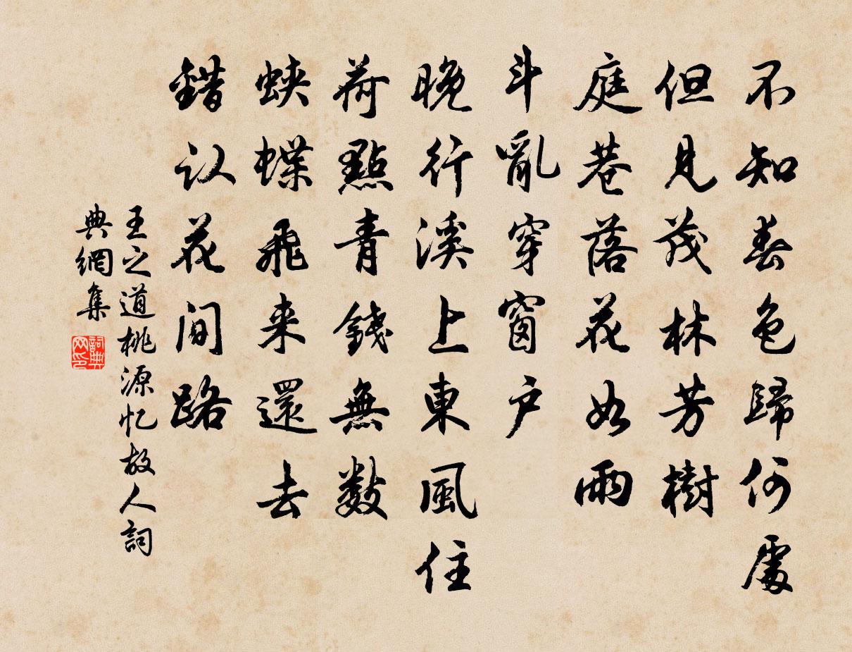 詩詞名句歷史字典書法欣賞書法字典國語詞典說文解字康熙字典古漢語字典標 題 作 者 詩 句 桃源憶故人作者:王之道 朝代:宋代桃源憶故人原文不知春色歸何處。但見茂林芳樹。庭巷落花如雨。斗亂穿窗戶。晚行溪上東風住。荷點青錢無數。蛺蝶飛來還去。錯認花間路。詩詞問答問:桃源憶故人的作者是誰?答:王之道問:桃源憶故人寫於哪個朝代?答:宋代問:桃源憶故人是什麼體裁?答:詞王之道桃源憶故人書法欣賞桃源憶故人書法作品詩詞推薦楊柳枝五首·其二牛嶠〔五代〕吳王宮裡色偏深,一簇纖條萬縷金。不憤錢塘蘇小小,引郎松下結同心。上己三首楊萬里〔宋代〕上己春陰政未開,寒窗愁坐冷於灰。凍蠅觸紙飛還落,仰面翻身起不來。赤壁歌鄭起〔宋代〕赤壁山,赤壁水。江有蛟龍,野有蛇虺。天蒼蒼,雲茫茫。周瑜於此走曹操,聲名萬古隨風長。偶成曹彥約〔宋代〕此心用處沒蹤由,擬待思量是討愁。但只事親兼事長,只如此去莫回頭。滿江紅(衡岳詞)江無□〔宋代〕使節行秋,算天也、知公風力。長嘯罷、煙雲盡卷,□□□□。重九漢峰黃泛酒,五更泰岳□觀日。問揚公、去後種菜雨下王禹偁〔宋代〕菜助三餐急,園愁五月枯。廢畦添糞壤,胼手捽荒蕪。前日種子下,今朝雨點粗。吟詩深 * ,天似憫窮途。市中狂吟段穀〔唐代〕一間茅屋,尚自修治。任狂風吹,連檐破碎。科棋斜攲,看著倒也。牆壁作散土一堆,主人翁永不來歸。宣和壬寅仲冬二十六日留別臨川陳泰穎鄭剛中〔宋代〕江南枕浙東千里枕遙,雁聚枕沙汀無定枕跡。偶然握手如平一,祗恐前身已相識。不然安得一羈旅,披露煩君出金將至金陵先寄獻劉留守陸游〔宋代〕梁益羈游道阻長,見公便覺意差強。別都王氣半空紫,大將牙旗三丈黃。江面水軍飛海鶻,帳前羽箭射天狼。歸來如夢令趙長卿〔宋代〕竹外半窺嬌面。真箇出塵體段。沒處可偷憐,空恁眼穿腸斷。休戀。休戀。只是與伊分淺。胡笳十八拍第十六拍劉商〔唐代〕去時只覺天蒼蒼,歸日始知胡地長。重陰白日落何處,秋雁所向應南方。平沙四顧自迷惑,遠近悠悠隨雁行。征途題徐浩書法華經王安石〔宋代〕一切法無差,水牛生象牙。莫將無量義,欲覓妙蓮華。從軍行楊凝〔唐代〕千里豈雲去,欲歸如路窮。人間無暇日,馬上又秋風。破月銜高岳,流星拂曉空。此時皆在夢,行色獨匆匆。贈新羅僧陳允平〔宋代〕便帆才過日東來,淺色伽梨短樣裁。野鶴怨時心共遠,海鯨降處定初回。長年守律因師戒,中土傳經為國災。幾日送友生游峽中李白〔唐代〕風靜楊柳垂,看花又別離。幾年同在此,今日各驅馳。峽里聞猿叫,山頭見月時。殷勤一杯酒,珍重歲寒姿。章獻明肅皇太后恭謝太廟佚名〔宋代〕九奏允諧,皇靈來暨。箅物芬聲,昭過精意。升降有德,群臣序位。享於克誠,萬福攸至。續巴東三峽歌曹勛〔宋代〕巴東三峽巫峽長,猿鳴三聲淚沾裳。月明夜寒寒雨霜,相望各在天一方。安得身有羽翼如鴛鴦,千里同相將。和荊公何處難忘酒詩鄭俠〔宋代〕何處難緘口,熙寧政失中。四方三面戰,十室九家空。見佞眸如水,聞忠耳似聾。君門深萬里,安得此言通。送陳南仲守象州王之道〔宋代〕熊軾朱轓照野明,知君今赴象山行。榮觀共作嘆嗟語,靜念獨傷離別情。畏景逼人才數日,修塗計此始三程。至時閩中曉晴賞牡丹白玉蟾〔宋代〕晴窗冉冉飛塵喜,寒硯微微暖氣神。喚醒東吳天外夢,化為南越海邊春。名句推薦不受苦中苦,難為人上人。吳承恩《西遊記·第三十二回》 艱難苦恨繁霜鬢,潦倒新停濁酒杯。杜甫《登高》 日月盈昃,辰宿列張。周興嗣《千字文·全文》 離愁正引千絲亂,更東陌、飛絮蒙蒙張先《一叢花令·傷高懷遠幾時窮》 神龜雖壽,猶有竟時。曹操《龜雖壽》 戎衣不脫隨霜雪,汗馬驂單長被鐵。李昂《從軍行》 唯仁者能好人,能惡人。孔子弟子《論語·雍也篇》 汀洲無浪復無煙,楚客相思益渺然。劉長卿《自夏口至鸚鵡洲夕望岳陽寄源中丞》 行善濟人,人遂得以安全,即在我亦為快意王永彬《圍爐夜話·第五一則》 古戍三秋雁,高台萬木風。屈大均《魯連台》