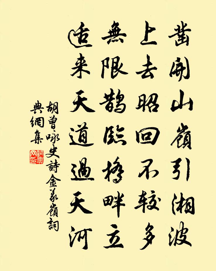 詩詞名句歷史字典書法欣賞書法字典國語詞典說文解字康熙字典古漢語字典標 題 作 者 詩 句 詠史詩金義嶺作者:胡曾 朝代:唐代詠史詩金義嶺原文鑿開山嶺引湘波,上去昭回不較多。無限鵲臨橋畔立,適來天道過天河。詩詞問答問:詠史詩金義嶺的作者是誰?答:胡曾問:詠史詩金義嶺寫於哪個朝代?答:唐代問:詠史詩金義嶺是什麼體裁?答:七絕胡曾詠史詩金義嶺書法欣賞詠史詩金義嶺書法作品注釋全唐詩:卷647-133詩詞推薦雜詠一百首劉安劉克莊〔宋代〕忽棄國中去,疑為方外游。早知守都廁,何似莫仙休。觸興曾豐〔宋代〕山向南逾禿,江歸下轉清。鳥那容久立,魚不及潛行。雲外雁機動,沙頭鷺意萌。信為吾道計,切忌太分明。送朱表臣職方提舉運鹽梅堯臣〔宋代〕蜃灶花煮溟渤,花航鹹播楚花越。官榷花利言盈,盜販弊相汨。連艘以轉致,攪灰或沉沒。雖使日鞭黥,未易窮奸平蕃曲三首劉長卿〔唐代〕吹角報蕃營,回軍欲洗兵。已教青海外,自築漢家城。渺渺戍煙孤,茫茫塞草枯。隴頭那用閉,萬里不防胡。絕漠輞川集二十首南垞裴迪〔唐代〕孤舟信一泊,南垞湖水岸。落日下崦嵫,清波殊淼漫。飲酒 其一陶淵明〔魏晉〕衰榮無定在,彼此更共之。邵生瓜田中,寧似東陵時!寒暑有代謝,人道每如茲。達人解其會,逝將不復疑;忽與和寄西山趙希逢〔宋代〕殘胡妄欲肆穿窬,憤激英雄起草廬。廣也數奇窮亦命,括之一敗罪非書。夢魂北闕常傾霍,餓死西山未分蔬。奮志懷翁宏王元〔唐代〕獨夜思君切,無人知此情。滄州歸未得,華發別來生。孤館木初落,高空月正明。遠書多隔歲,獨念沒前程。暮春王安石〔宋代〕無限殘紅著地飛,溪頭煙樹翠相圍。楊花獨得東風意,相逐晴空去不歸。水調歌頭(贈汪亻秀才)張元乾〔宋代〕袖手看飛雪,高臥過殘冬。飄然底事春到,先我逐孤鴻。挾取筆端風雨,快寫胸中丘壑,不肯下樊籠。大笑了今古序齋丁主簿挽章曹彥約〔宋代〕詩禮彬彬到古風,月橋人物序齋中。鄭公宅畔鄉仍在,馬氏台前帳已空。萬事可堪評夜旦,九泉終不蓋英雄。只今過津口杜甫〔唐代〕南嶽自茲近,湘流東逝深。和風引桂楫,春日漲雲岑。回首過津口,而多楓樹林。白魚困密網,黃鳥喧嘉音。物微襄陽道元稹〔唐代〕羊公名漸遠,唯有峴山碑。近日稱難繼,曹王任馬彝。椒蘭俱下世,城郭到今時。漢水清如玉,流來本為誰。祀馬將軍竹枝辭馬之純〔宋代〕麥隴桑疇溪路斜,溪南溪北自千家。當年戰守知誰力,好把寒泉薦菊花。鄂王墓陳允平〔宋代〕鄂王墓在棲霞嶺,一片忠魂萬古存。鏡里赤心懸日月,劍邊英氣塞乾坤。蒼苔雨暗龍蛇壁,老樹煙凝虎豹旛。獨倚九月六夜夢中作笑詩覺而忘之明日戲追補一首陸游〔宋代〕吾家笑疾自士龍,我才雖卑笑則同。紛紛世事何足計,盡付撫掌掀髯中。清樽可醉風月好,虛空萬象皆絕倒。問居南歌子佚名〔宋代〕玉殿分時果,金盤弄賜冰。晚來階下按歌聲。恰好一方明月、可中庭。露下天如水,風來夜又清。偏他不肯大家行六么令呂岩〔唐代〕東與西,眼與眉。偃月爐中運坎離,靈砂且上飛。最幽微,是天機,你休痴,你不知。五雜俎范成大〔宋代〕五雜俎,回文機。往復來,錦梭飛。不得已,獨畫眉。春晚方岳〔宋代〕山杏溪桃睡欲昏,表旗邀客過孤村。楊花不肯隨春去,惹住晴風自入門。名句推薦天下傷心處,勞勞送客亭。李白《勞勞亭》 春秋代序,陰陽慘舒,物色之動,心亦搖焉。劉勰《文心雕龍·物色》 得天下英才而教育之。孟子《孟子·盡心章句上·第二十節》 責人勿厲,小惠或有大得。來俊臣《羅織經·保身卷第七》 本來無一物,何處惹塵埃!惠能《菩提偈》 長安大雪天,鳥雀難相覓。張孜《雪詩》 短夢依然江表,老淚灑西州。張炎《八聲甘州·記玉關踏雪事清游》 喃喃教言語,一一刷毛衣。白居易《燕詩示劉叟》 可憐處處巢居室,何異飄飄托此身。杜甫《燕子來舟中作》 相顧無言,惟有淚千行。蘇軾《江城子·乙卯正月二十日夜記夢》