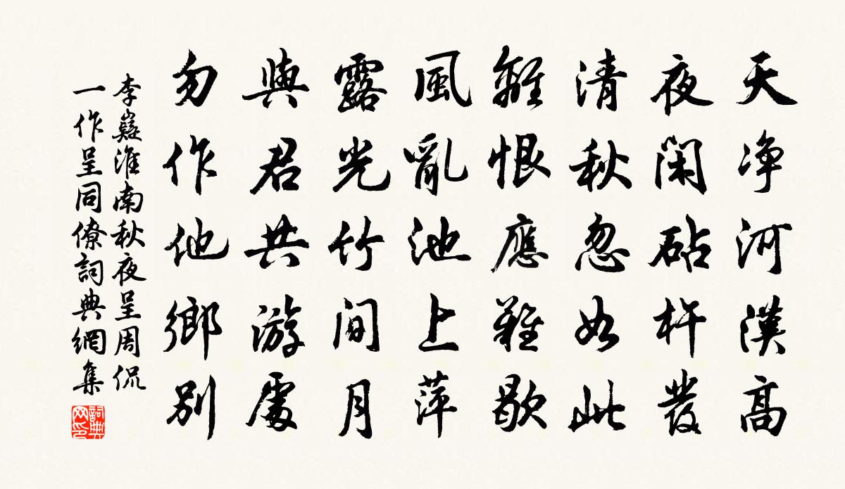 詩詞名句歷史字典書法欣賞書法字典國語詞典說文解字康熙字典古漢語字典標 題 作 者 詩 句 淮南秋夜呈周侃(一作呈同僚)作者:李嶷 朝代:唐代原文天淨河漢高,夜閒砧杵發。清秋忽如此,離恨應難歇。風亂池上萍,露光竹間月。與君共游處,勿作他鄉別。詩詞問答問:《淮南秋夜呈周侃(一作呈同僚)》的作者是誰?答:李嶷問:該詩寫於哪個朝代?答:唐代書法欣賞淮南秋夜呈周侃(一作呈同僚)書法作品注釋全唐詩:卷145_4詩詞推薦鹹平親郊八首諸臣撰〔宋代〕大報於帝,盛熏升聞。視齊良潔,粢盛苾芬。和李公擇赴歷下道中雜詠十二首其十一梁山洎蘇轍〔宋代〕花開南北一般紅,路過江淮萬里通。飛蓋靚妝迎客笑,鮮魚白酒醉船中。偈頌二百零五首釋正覺〔宋代〕老大叢林快說禪,不將禪拄口皮邊。谷深山遠空無像,何處人呼應不圓。武夷九曲葉夢鼎〔宋代〕興窮九折更悠然,棹轉船頭障去川。留取洞中無盡意,桃花水暖鱖魚天。和并州劉密學見寄魏野〔宋代〕還如裴度鎮河東。百萬軍民畏愛中。鐘鼓久喧刁斗靜,旌幢一指鴈門空。瀟湘故友參時務,燕趙佳人接士風。密地浣溪沙(賞梅)葛勝仲〔宋代〕東閣郎官巧寫真。西湖處士妙傳神。嫣然一笑臘前春。斗好雖無冰骨女,相宜幸是雪髯人。且煩疏影入清尊。除夜侍酒呈諸兄示舍弟歐陽詹〔唐代〕莫嘆明朝又一春,相看堪共貴茲身。悠悠寰宇同今夜,膝下傳杯有幾人。送青神宰樊允南解官次杜應求韻史堯弼〔宋代〕簿領侵尋地,淹留寄此鄉。相逢譚笑共,不覺歲年長。物色重陽近,秋高萬象藏。賦歸三徑里,籬菊有餘香。月上海棠陳允平〔宋代〕遊絲弄晚,捲簾看處,燕重來時候。正鞦韆亭榭,錦窠春透。夢回褪浴華清,凝溫泉、絳綃微皺。芳陰底,人立東經和寧門外賣花市見菊楊萬里〔宋代〕病眼仇冤一束書,客舍葭莩菊一株。看來看去兩相厭,花意索寞恰似無。清曉肩輿過花市,陶家全圃移在此。千株次韻鄭總乾方岳〔宋代〕我亦思兮天一涯,樊川詩老此曾家。九夫容隔秋風浦,一獨速眠春雨蛙。竹屋有燈誰與共,秫田可釀不須賒。何年虞美人向子諲〔宋代〕去年不到瓊花底。蝶夢空相倚。今年特地趁花來。卻甚不教同醉、過花開。花知此恨年年有。也伴人春瘦。一枝和青玉案佚名〔宋代〕更憔悴、羞人見。贈南山寄傲軒方逢辰〔宋代〕著心尋處元無物,開眼見時都是天。楚市少年霸陵尉,紛紛蠛蠓過吾前。嚴月澗同飲湖邊顧逢〔宋代〕斗酒復斗酒,高歌山水邊。世間無此樂,我輩即神仙。狂發花前笑,醉來松下眠。行人相偶語,堪作畫圖傅。別留少策兼呈玉黨先生陳元晉〔宋代〕君家伯仲盡英妙,筆勢夭矯人中龍。池中我亦自雲雨,四方上下長相從。句李伯先〔宋代〕一門萃忠孝,竹錦寫家聲。偈頌四十一首釋普寧〔宋代〕冬至寒食一百五,中有一轉平實語。缺齒老胡舉不全,賺他立需人莽鹵。貓兒偏解捉老鼠。六十六歲吟丘葵〔宋代〕維天於穆命無殊,人性皆由氣與虛。貴賤何須為物役,芳菲祗合返吾初。讀書自覺年年誤,學道惟應念念除。輔世同年梅鼎臣赴鳳翔幕兼省覲宋祁〔宋代〕酪和盤櫻舊宴空,鳳岐新辟逐旌弓。坐陪府幄談成藪,趨問家庭史有公。春斝促浮萍葉紫,夜章催刻密枝紅。青袍名句推薦山從人面起,雲傍馬頭生。李白《送友人入蜀》 圖未就之功,不如保已成之業洪應明《菜根譚·概論》 風嗥雨嘯,昏見晨趨。鮑照《蕪城賦》 世事漫隨流水,算來一夢浮生。李煜《烏夜啼·昨夜風兼雨》 揮手自茲去,蕭蕭班馬鳴。李白《送友人》 教民禮順,莫善於悌。孔子及其弟子《孝經·廣要道》 河水傾潑丈余,雞鳴犬吠滿城中。蒲松齡《地震》 塞上秋風鼓角,城頭落日旌旗。元好問《江月晃重山·初到嵩山時作》 羅袂從風輕舉,愁殺採蓮女!毛文錫《應天長·平江波暖鴛鴦語》 憑空怒浪兼天涌,不盡六朝聲。歸莊《錦堂春·半壁橫江矗起》