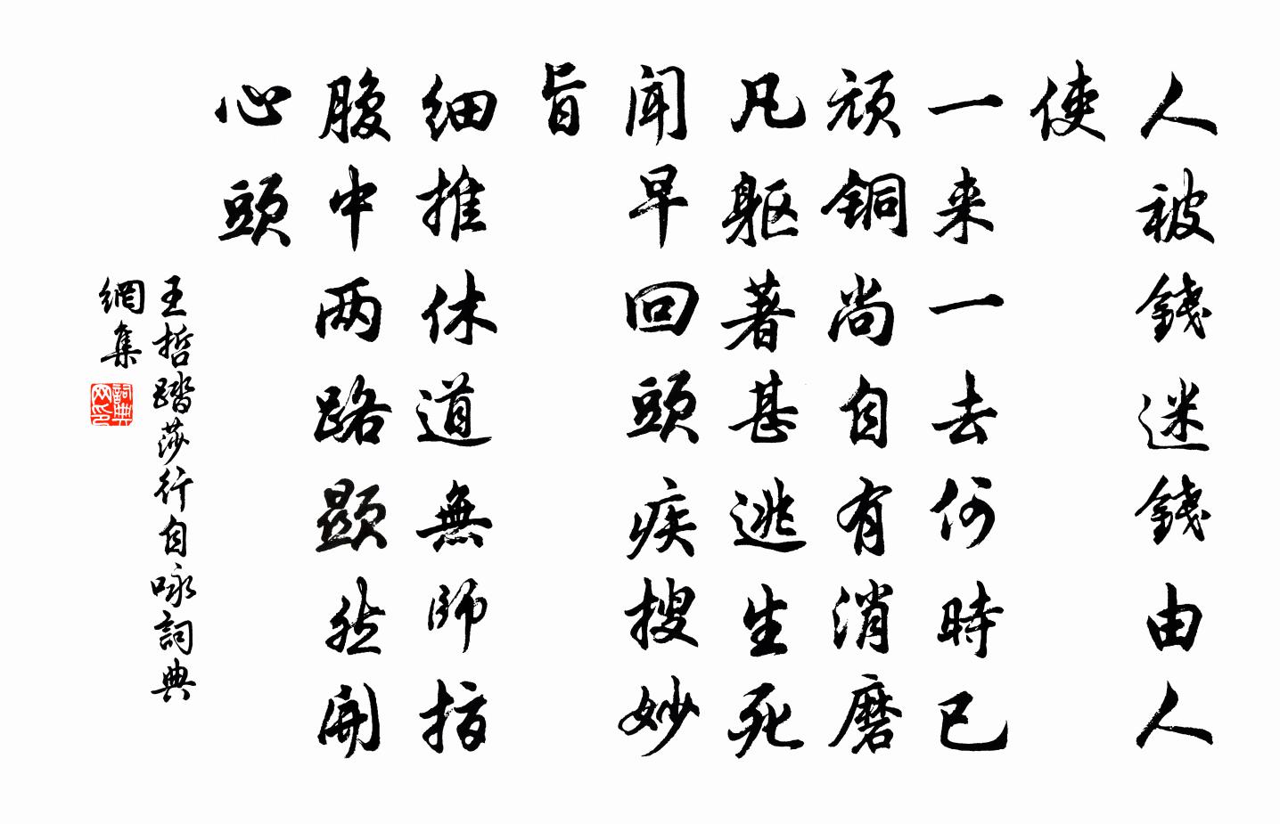 詩詞名句歷史字典書法欣賞書法字典國語詞典說文解字康熙字典古漢語字典標 題 作 者 詩 句 踏莎行 自詠作者:王哲 朝代:元代踏莎行 自詠原文人被錢迷,錢由人使。一來一去何時已。頑銅尚自有消磨,凡軀著甚逃生死。聞早回頭,疾搜妙旨。細推休道無師指。腹中兩路顯然開,心頭詩詞問答問:踏莎行 自詠的作者是誰?答:王哲問:踏莎行 自詠寫於哪個朝代?答:元代問:踏莎行 自詠是什麼體裁?答:詞王哲踏莎行 自詠書法欣賞踏莎行 自詠書法作品詩詞推薦小車吟邵雍〔宋代〕春暖未若熱,秋涼未甚寒。小車隨意出,所到即成歡。相思怨李冶〔唐代〕人道海水深,不抵相思半。海水尚有涯,相思渺無畔。攜琴上高樓,樓虛月華滿。彈著相思曲,弦腸一時斷。水調歌頭佚名〔宋代〕帆落松陵浦,枯柳纜瓊艘。杖策無人獨步,浪厭百花橋。我掛風裳水佩,一笑波寒月白,餘韻觸驚濤。絕景有誰賞見黃仲達感秋意張耒〔宋代〕秋風吹衡茅,寂歷如荒村。獨立無與語,悲蟲鳴草根。老木經疾風,枝葉僅得存。疏蔭不滿地,白日耿當軒。北城仆自以四十四日自延平歸所寓之南軒積雨陰濕朱槔〔宋代〕蘧蘧飛夢過雲鄉,物色清輝眼界長。閶闔未招金馬士,蓬萊先立玉瀾堂。千尋濯足衣裘冷,六字喔詩筆硯香。當與依韻奉和司徒侍中元城埽行河強至〔宋代〕一鼓千夫下揵聲,缺堤漏穴幾時平。盤渦倒吸湍流住,巨浸疑浮厚地行。舉鍤每年勞眾力,治河無策貢愚誠。賴公鷓鴣天元好問〔金代〕八月蘆溝風路清。短衣孤劍此飄零。蒼龍雙關平生恨,只有西山滿意青。塵擾擾,雁冥冥。因君南望涌金亭。還家登辨覺寺王維〔唐代〕竹徑從初地,蓮峰出化城。窗中三楚盡,林上九江平。軟草承趺坐,長松響梵聲。空居法雲外,觀世得無生。春暮過石龜谷題溫處士林園(一作送溫逸人)錢起〔唐代〕隱几無名老,何年此陸沈。丘園自得性,婚嫁不嬰心。歲計因山薄,霞棲在谷深。設罝連草色,曬藥背松陰。觸興百年舒岳祥〔宋代〕流水故人盡,荒村落葉多。空餘老矍鑠,全是病維摩。齒落不知味,眼花應有魔。百年聊爾爾,千載欲如何。小子只自夜來風氣又作腫連頤頷熱發心脾無以李至〔宋代〕自憐可幸少人如,不幸如人亦有餘。賤日身安長欠學,榮時眼病卻多書。含毫終是冥搜拙,展卷仍慚博覽疏。最抱東嘉倦雨遣興有懷浙右兄弟二十韻李洪〔宋代〕南國地卑濕,兼旬雨不停。氣昏江練白,雲蔽石崖青。倦聽涔涔霤,全遮渺渺汀。柳低齊戶牖,竹密亞窗欞。壞壁夏日暉上人房別李參軍崇嗣陳子昂〔唐代〕四十九變化。一十三死生。翕忽玄黃里。驅馳風雨情。是非紛妄作。寵辱坐相驚。至人獨幽鑒。窈窕隨昏明。咫尺任仲微閱世亭張耒〔宋代〕志士抱奇策,常苦不得伸。及其利害出,倏已亡其人。今古同此恨,愚智竟誰分。哀哉老任公,英魄久已淪。惟余贈閭近道人孫應時〔宋代〕子下幾人能具眼,世間萬事可忘言。猶將筆墨瀾翻說,多笑先生不憚煩。次韻蒲大受書懷十首郭印〔宋代〕事業乖初願,聰明異昔時。病多難止酒,愁極漫喔詩。適俗非予好,從人莫己知。經營三徑就,安用印累累。偈六十九首釋道寧〔宋代〕丈夫兒,自家斷,日用無私休計算。被他指點謾商量,到底死生打不辨。長生路上少人行,輪轉修途空懊嘆。萬境齊天樂(螢)王沂孫〔宋代〕碧痕初化池塘草,熒熒野光相趁。扇薄星流,盤明露滴,零落秋原飛磷。練裳暗近。記穿柳生涼,度荷分暝。誤我論鄰人陸游〔宋代〕世通婚姻對門扉,禍福饑飽常相依。忿爭得直義愈非,不如一醉懹牒歸。頌證道歌證道歌釋印肅〔宋代〕雪山肥膩更無雜,沌一摩尼相間夾。珍珠寶網影重重,頂禮歸依無縫塔。名句推薦一片閒愁,想丹青難貌柳永《尾犯·夜雨滴空階》 一水護田將綠繞,兩山排闥送青來王安石《書湖陰先生壁》 八陣圖名成臥龍,六韜書功在飛熊。查德卿《蟾宮曲·懷古》 更吹羌笛關山月,無那金閨萬里愁王昌齡《從軍行七首》 輦轂繁華事可傷,師師垂老過湖湘劉子翬《汴京紀事》 莫信直中直,須防仁不仁。佚名《增廣賢文·上集》 瀑布風前千尺影,疑瀉銀河一派。朱栴《念奴嬌·雪霽夜月中登樓望賀蘭山作》 何時一樽酒,重與細論文。杜甫《春日憶李白》 弗知而言為不智,知而不言為不忠。劉向《戰國策·秦一·張儀說秦王》 綠桑高下映平川,賽罷田神笑語喧。歐陽修《田家》