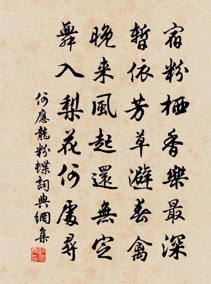 詩詞名句歷史字典書法欣賞書法字典國語詞典說文解字康熙字典古漢語字典標 題 作 者 詩 句 粉蝶作者:何應龍 朝代:宋代粉蝶原文宿粉棲香樂最深,暫依芳草避春禽。晚來風起還無定,舞入梨花何處尋。詩詞問答問:粉蝶的作者是誰?答:何應龍問:粉蝶寫於哪個朝代?答:宋代何應龍粉蝶書法欣賞粉蝶書法作品詩詞推薦春寒六首陳造〔宋代〕平明欲斂雲復厚,薄晚未休風更顛。老 * 不宜出,下帷添火擁書眠。新灘蘇軾〔宋代〕扁舟酒轉山曲,酒未至已先酒驚。白浪酒橫江起,槎牙似雪城。番番從高來,一一投澗坑。大魚不能上,暴鬣(一新作春野亭蔡襄〔宋代〕太守職民治,詔書劭吾農。載酒事緬邈,作室當廨中。況憑軒牖高,中視田野功。澹沲沐新澤,依微生柔風。江潮宮詞張公庠〔宋代〕鸞帳薰衣賜御香,花陰未動日初長。人閒相約尋芳去,春困不禁千步廊。蜆子和尚贊釋法薰〔宋代〕把個裡撈波,做盡窮伎倆。推出酒台盤,至今收不上。孤山閒居次韻酬辯才大師釋智圓〔宋代〕地僻人稀到,病來無話端。遠山游未得,終日臥中看。藥篋經梅潤,松窗過雨寒。唯師知我趣,塵事絕相干。讀書陸游〔宋代〕少從師友講唐虞,白首襟懷不少舒。舊謂皆當付之酒,今知莫若信吾書。朱黃參錯雞鳴後,簽帙從橫月墮初。撫幾寄輦下傳神法相大師林逋〔宋代〕禁寺諸供奉,如師藝學稀。粉輕昏古本,罷重拆秋衣。淨{左鹵右兼}生瓶暈,連陰長竹圍。算應支遁馬,毛骨苦句姚辟〔宋代〕潮卷亂峰橫幾席,沙填重險變桑麻。蔡郎中請贊釋宗杲〔宋代〕賦性暴,舉止傲,說甚道。有個沒意智獃郎,隨例妄想顛倒。蔡郎中還見麽,若也當面諱卻,便是監主自盜。送新羅法師還國孫逖〔唐代〕異域今無外,高僧代所稀。苦心歸寂滅,宴坐得精微。持缽何年至,傳燈是日歸。上卿揮別藻,中禁下禪衣。海闊和任漕開宴值雨吳芾〔宋代〕正是千花萬卉開,一時景物亦佳哉。良辰已幸陪龍節,盛宴仍容飫豹胎。雖喜風光環幾席,其如煙雨暗池台。明朝陳平徐鈞〔宋代〕生平多智足興劉,奇秘終貽正大羞。若使託孤權獨任,未知誅呂若為謀。攤破訴衷情(和)蔡楠〔宋代〕欄乾十二繞層樓。珠簾卷素秋。當年尊酒屢遲留。識公惟白鷗。才得趣,又成愁。情鍾我輩流。買山同隱肯來不。夏日題遠公北閣羅鄴〔唐代〕危閣壓山岡,晴空疑鳥行。勝搜花界盡,響益梵音長。有月堪先到,無風亦自涼。人煙紛繞繞,諸樹共蒼蒼。榻戀題玉泉溪湘驛女子〔唐代〕紅葉醉秋色,碧溪彈夜弦。佳期不可再,風雨杳如年。春日即事郭印〔宋代〕鳥詠短長句,花呈赤白章。化工非不巧,閒客笑春忙。後溪文同〔宋代〕新晴揉藍染溪色,我愛常來坐溪側。一林奇石宛如畫,兩岸野花殊不識。蟬鳴盡日競何事,鷺下多時猶未食。細觀喜雨呈二兄李洪〔宋代〕凍雨排銀竹,垂檐一萬條。新涼生枕簟,餘潤到枯焦。靜聽欣傾注,應心快洗澆。長河從此足,不用借鹹潮。和晏相公乘輿宿殿致齋日巡仗遇雪宋祁〔宋代〕天京飛雪灑車裝,九九清塵御路長。斜影不迷宣曲騎,薄花才點羽林槍。觀邊麗色含鳷鵲,蓋外輕陰亞鳳凰。誰識名句推薦扣舷獨嘯,不知今夕何夕。張孝祥《念奴嬌·過洞庭》 芄蘭之葉,童子佩韘。佚名《芄蘭》 野店垂楊步,荒祠苦竹叢。范成大《寒食郊行書事》 學不可以已。荀子《荀子·勸學》 鷺窺蘆箔水,鳥啄紙錢風。范成大《寒食郊行書事》 一往情深深幾許?深山夕照深秋雨。納蘭性德《蝶戀花·出塞》 不在其位,不謀其政。孔子弟子《論語·泰伯篇》 名豈文章著,官應老病休。杜甫《旅夜書懷》 望中酒旆閃閃,一簇煙村,數行霜樹。柳永《夜半樂·凍雲黯淡天氣》 一寸光陰一寸金,寸金難買寸光陰。佚名《增廣賢文·上集》