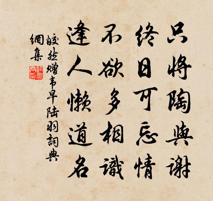詩詞名句歷史字典書法欣賞書法字典國語詞典說文解字康熙字典古漢語字典標 題 作 者 詩 句 贈韋早陸羽作者:皎然 朝代:唐代贈韋早陸羽原文只將陶與謝,終日可忘情。不欲多相識,逢人懶道名。詩詞問答問:贈韋早陸羽的作者是誰?答:皎然問:贈韋早陸羽寫於哪個朝代?答:唐代問:贈韋早陸羽是什麼體裁?答:五絕皎然贈韋早陸羽書法欣賞贈韋早陸羽書法作品注釋全唐詩:卷816-41詩詞推薦眼兒媚仇遠〔宋代〕謝家池館占花中。微雨濕春風。艷紅修碧,濃香疏影,浮動簾櫳。嬌蛾聚翠尋春夢,衣上淚痕重。閒窗愁對,金籠三昧諸頌釋印肅〔宋代〕無底瑠璃井,忽爾墮其中。勝修萬劫功,跳出跳不出,瘖瘂又盲聾。南鄉子(送筠州趙司戶,茂中之子。茂中嘗為筠州幕官,題詩甚多)辛棄疾〔宋代〕日日老萊衣。更解風流蠟鳳嬉。膝上放教文度去,須知。要使人看玉樹枝。剩記乃翁詩。綠水紅蓮覓舊題。歸騎春宿岐州北郭嚴給事別業岑參〔唐代〕郭外山色暝,主人林館秋。疏鍾入臥內,片月到床頭。遙夜惜已半,清言殊未休。君雖在青瑣,心不忘滄洲。海棠塢趙蕃〔宋代〕嘗喔坡老詩,未識柯山塢。想像亦好園,規摹自渠取。暮次秭歸陸游〔宋代〕朝披南陵雲,夕揖建平樹。啼鴉隨客檣,落日滿孤戍。惡灘不可說,石芒森如鋸。浪花一丈白,吹沬入窗戶。是身飲酒二十首同蘇翰林先生次韻追和陶淵明二晁補之〔宋代〕沉飲非荒宴,凜然忽頹山。或人慾問事,已醉不能言。古來亦如此,名字垂千年。但問酒中適,豈計飲者傳。中秋朋和桃源夫人陳純〔宋代〕仙源嘗誤到,羈思正蕭然。秋靜夜方靜,月圓人更圓。清尊歌越調,仙棹泛晴川。幽意知多少,重重類楚綿。石洞唐仲友〔宋代〕流泉在石上,細路在石下。石宇閉復開,竹樹邃而雅。我來不值桂壑風,月寒病骨艱迎逢。野田午後愛日烘,杖藜次韻范參政書懷陸游〔宋代〕祠祿恩寬亦例沾,屏居懷抱苦厭厭。戍邊事往功名忤,迎客兒扶老病兼。遇興榜舟無遠近,破愁沽酒任酸甜。殘年待漏入閣書事奉贈元九學士閣老白居易〔唐代〕衙排宣政仗,門啟紫宸關。彩筆停書命,花磚趁立班。稀星點銀礫,殘月墮金環。暗漏猶傳水,明河漸下山。從東雪中訝諸公不相訪裴度〔唐代〕憶昨雨多泥又深,猶能攜妓遠過尋。滿空亂雪花相似,何事居然無賞心。衡門獨立陸游〔宋代〕春歸堪笑又匆匆,水白秧青細雨蒙。溪鳥低飛畫橋外,路人相值綠陰中。宋清藥券貧來積,李賀詩囊病後空。惟有送琮監寺住院釋法薰〔宋代〕桐江江上一絲風,不釣盲龜只釣龍。浮定有無誰識意,夜涼如水月如弓。謁秋崖先生方吏部墓借斗韻楊公遠〔宋代〕崖翁底事姓名香,照世文章日月光。葭塢留荷啼曉露,趼窩埋玉黯斜陽。碑刊地記生前撰,甃蝕苔痕去後荒。一炷足虞叟兄句蘇泂〔宋代〕雲里仙人不解愁,人間肺渴望涼瘳。更深倚杖前除立,一見銀河認得秋。臙脂井范成大〔宋代〕午醉醒來一夢非,忽忽玉樹逐春歸。臙脂卻作千年計,不似愁魂四散飛。白鹿原晚望馬戴〔唐代〕滻曲雁飛下,秦原人葬回。丘墳與城闕,草樹共塵埃。漁村雜句十首薛嵎〔宋代〕猿鶴何曾肯受羈,仙來亭畔立多時。物情未到忘機地,步步行行只自疑。壽范潔齋吳泳〔宋代〕憶昨薰風會面時,猶龍老子亶沖夷。忠文晚節三年過,上相生辰十日遲。內景兩篇時點檢,中庸一卷曉行持。朝來名句推薦清江一曲抱村流,長夏江村事事幽。杜甫《江村》 欲知悵別心易苦,向暮春風楊柳絲。李白《下途歸石門舊居》 幾多情,無處說,落花飛絮清明節。魏承班《漁歌子·柳如眉》 寒笛對京口,故人在襄陽。劉昚虛《暮秋揚子江寄孟浩然》 悲歌可以當泣,遠望可以當歸。佚名《悲歌》 已駕七香車,心心待曉霞。李商隱《壬申七夕》 六朝文物草連空,天淡雲閒今古同。杜牧《題宣州開元寺水閣閣下宛溪夾溪居人》 誰言寸草心,報得三春暉。孟郊《遊子吟 / 迎母漂上作》 已是懸崖百丈冰,猶有花枝俏。 * 《卜運算元·詠梅》 公乎躍馬揚玉鞭,滅沒高蹄日千里。溫庭筠《拂舞詞 / 公無渡河》
