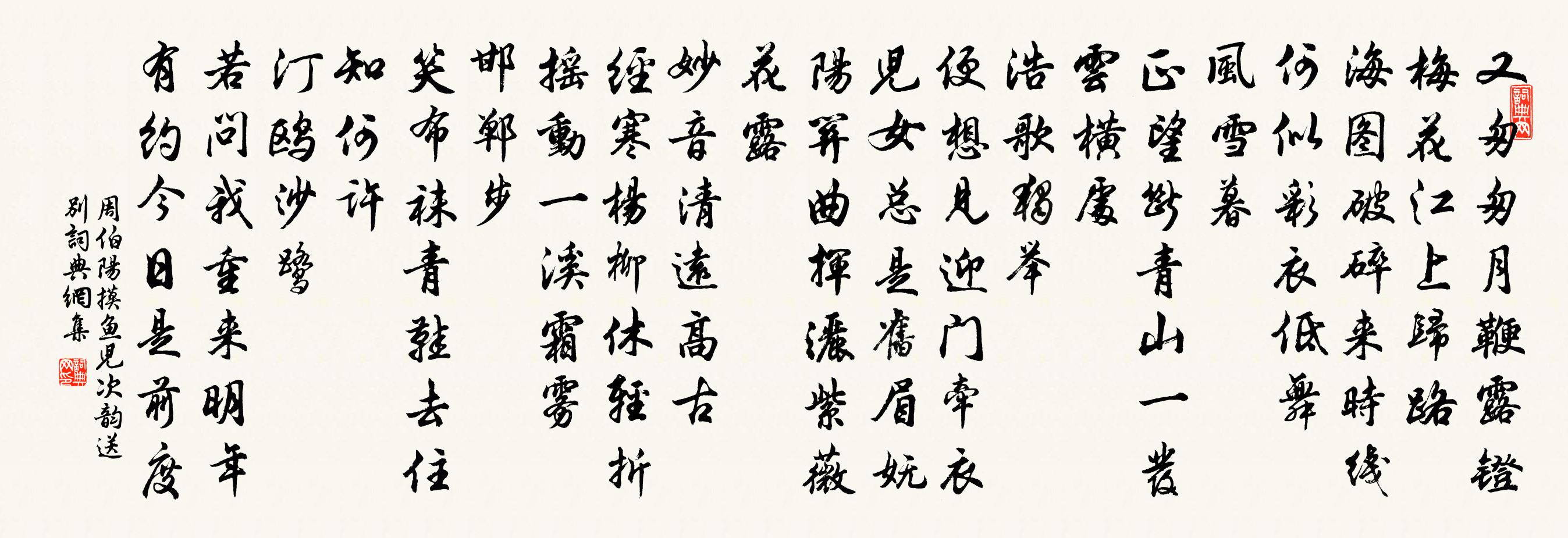 詩詞名句歷史字典書法欣賞書法字典國語詞典說文解字康熙字典古漢語字典標 題 作 者 詩 句 摸魚兒(次韻送別)作者:周伯陽 朝代:宋代摸魚兒(次韻送別)原文又匆匆、月鞭露鐙,梅花江上歸路。海圖破碎來時線,何似彩衣低舞。風雪暮。正望斷青山,一發雲橫處。浩歌獨舉。便想見迎門,牽衣兒女,總是舊眉嫵。陽關曲,揮灑紫薇花露。妙音清遠高古。經寒楊柳休輕折,搖動一溪霜霧。邯鄲步。笑布襪青鞋,去住知何許。汀鷗沙鷺。若問我重來,明年有約,今日是前度。詩詞問答問:摸魚兒(次韻送別)的作者是誰?答:周伯陽問:摸魚兒(次韻送別)寫於哪個朝代?答:宋代問:摸魚兒(次韻送別)是什麼體裁?答:詞周伯陽摸魚兒(次韻送別)書法欣賞摸魚兒(次韻送別)書法作品詩詞推薦送子坦赴鹽官縣市征陸游〔宋代〕父子團欒笑語嘩,豈知雲散各天涯。長亭結束秋將晚,別酒淒涼日易斜。我坐耄年艱就養,汝非仰祿肯離家?游山詠嚬(一作齊梁體)溫庭筠〔唐代〕毛羽斂愁翠,黛嬌攢艷春。恨容偏落淚,低態定思人。枕上夢隨月,扇邊歌繞塵。玉鉤鸞不住,波淺石磷磷。次韻儲檢法送行項安世〔宋代〕別去動經年,相過但旬日。會心能幾何,歡意忽已失。何年峴山頭,此主復此客。官回便重到,我齒已半百。侍立無夢令王哲〔元代〕今則與公照燭。無夢令中詳錄。古聖富春詩,六白瑩光如玉。丁屬。丁屬。三塊各人知足。頌古四十五首釋如珙〔宋代〕覓心不得疑情息,與汝安心萬事休。十萬里沙來又去,杖挑只履在肩頭。竹溪直院盛稱起予草堂詩之善暇日覽之多有可劉克莊〔宋代〕月里誰橫笛,秋深戰壘閒。別吹新曲調,偏照舊關山。響激商飆起,聲隨隴水潺,遠傳邊塞外,高入廣寒間。解白送陳衡牟融〔唐代〕秋江煙景晚蒼蒼,江上離人促去航。千里一官嗟獨往,十年雙鬢付三霜。雲迷樓曲親庭遠,夢繞通山客路長。不必二賢孔武仲〔宋代〕羲之書之墨池,淵明子醉石。人生嗜好亦天然,豈顧書淫與書癖。一時聲價動宇宙,千古林泉記蹤跡。書固吾不能己己歲夏旱大熱睡起偶成曾幾〔宋代〕青天無雲日亭午,群巫禱祈且呼舞。老夫饒睡昏昏然,鼻息如雷汗如雨。四時田園雜興范成大〔宋代〕吉日初開種稻包,南山雷動雨連宵。今年不欠秧田水,新漲看看拍小橋。雜歌李端〔唐代〕漢水至清泥則濁,松枝至堅蘿則弱。十三女兒事他家,顏色如花終索寞。蘭生當門燕巢幕,蘭芽未吐燕泥落。為姑旅懷文天祥〔宋代〕昨夜分明夢到家,飄颻依舊客天涯。故園門掩東風老,無限杜鵑啼落花。偈頌一百零四首釋紹曇〔宋代〕百二十日夏,今朝始發頭。飯抄雲子白,羹煮菜香浮。未問寒山子,先看水牯牛。山前千頃地,信腳踏翻休。遣懷陸游〔宋代〕風月資吟嘯,漁樵約往還。貧猶能釀酒,病不廢游山。亂石臥牛馬,流泉鳴佩環。豁除羈旅日,猶有半生閒。和陳器之詩四首過韓城張耒〔宋代〕周京無人吊禾黍,七雄按劍分周土。秦人匹馬出函關,六王割地愁為虜。宜陽古堞故韓都,地接強秦爭戰苦。謀窮哭李端周朴〔唐代〕三年翦拂感知音,哭向青山永夜心。竹在曉煙孤鳳去,劍荒秋水一龍沉。新墳日落松聲小,舊色春殘草色深。不及鷓鴣天趙長卿〔宋代〕寶篆煙消香已殘。蟬娟月色浸欄乾。歌喉不作尋常唱,酒令從他各自還。傳杯手,莫教閒。醉紅潮臉媚酡顏。相攜偈頌一百零二首釋慧遠〔宋代〕蝦蟆跳上梵天,蚯蚓驀過東海。洞庭湖頂門著地,龍蟠山腦後見腮。中和樂九章歌南郊第四盧照鄰〔唐代〕虔郊上帝,肅事圓丘。龍駕四牡,鸞旗九斿。鍾歌晚引,紫煬高浮。日麗蒼璧,雲飛鳴球。皇之慶矣,萬壽千秋。子產告范宣子輕幣左丘明〔先秦〕范宣子為政,諸侯之幣重,鄭人病之。 二月,鄭伯如晉。子產寓書於子西,以告宣子,曰:“子為晉國,四鄰名句推薦觀其交遊,則其賢不肖可察也管仲《管子·權修》 絲長魚誤恐,枝弱禽驚踐。崔護《五月水邊柳》 好名羈行,重利無虧。來俊臣《羅織經·保身卷第七》 陽春布德澤,萬物生光輝。佚名《長歌行》 一道鵲橋橫渺渺,千聲玉佩過玲玲。徐凝《七夕》 藥醫不死病,佛度有緣人。馮夢龍《醒世恆言·卷十》 遠信入門先有淚,妻驚女哭問何如。元稹《得樂天書》 君子之言寡而實,小人之言多而虛。劉向《說苑·談叢》 角聲吹徹小梅花。夜長人憶家。趙長卿《阮郎歸·客中見梅》 橫笛聞聲不見人,紅旗直上天山雪。陳羽《從軍行》