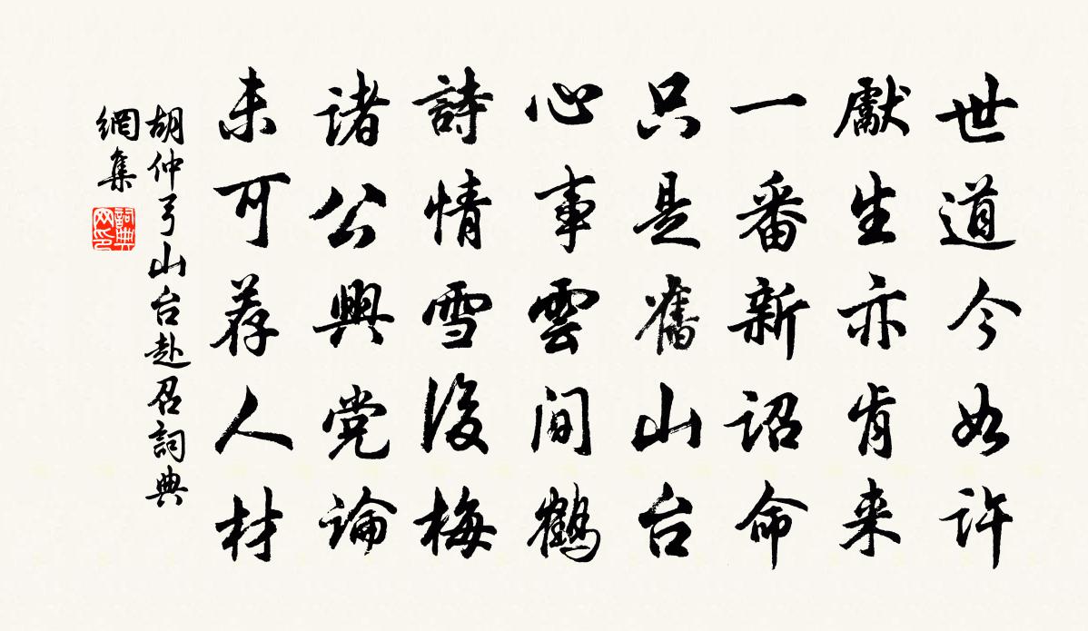詩詞名句歷史字典書法欣賞書法字典國語詞典說文解字康熙字典古漢語字典標 題 作 者 詩 句 山台赴召作者:胡仲弓 朝代:宋代山台赴召原文世道今如許,先生亦肯來。一番新詔命,只是舊山台。心事雲間鶴,詩情雪後梅。諸公興黨論,未可薦人材。詩詞問答問:山台赴召的作者是誰?答:胡仲弓問:山台赴召寫於哪個朝代?答:宋代胡仲弓山台赴召書法欣賞山台赴召書法作品詩詞推薦晨起陸游〔宋代〕海燕翩將乳,戎葵粲己繁。魚船初入市,蒪擔未過門。年耄停朝課,家貧省小餐。所欣行藥處,秧稻遍村村。挽陳東湖先生張衡〔兩漢〕四大假合相,六根清淨緣。祗知心是佛,不惜藥成仙。魚泣銜沙立,鷗疑側腦眠。淒其野人奠,秋菊薦寒泉。奉和魯望漁具十五詠釣筒皮日休〔唐代〕籠籦截數尺,標置能幽絕。從浮笠澤煙,任臥桐江月。絲隨碧波漫,餌逐清灘發。好是趁筒時,秋聲正清越。送鶴與裴相臨別贈詩白居易〔唐代〕司空愛爾爾須知,不信聽吟送鶴詩。羽翮勢高寧惜別,稻粱恩厚莫愁飢。夜棲少共雞爭樹,曉浴先饒鳳占池。穩上沁園春(餞鄭金部去國)黃師參〔宋代〕谷口高人,偶溯明河,近尺五天。見紫霄宮闕,空中突兀,玉皇姬侍,雲里蹁躚。滴露研朱,披肝作紙,細寫靈均南浦(春水)王沂孫〔宋代〕柳下碧粼粼,認麴塵乍生,色嫩如染。清溜滿銀塘,東風細、參差谷紋初遍。別君南浦,翠眉曾照波痕淺。再來漲出遊歸臥得雜詩陸游〔宋代〕薺花如雪滿中庭,乍出巴蕉一寸青。老子掩關常謝客,短蓑鋤菜伴園丁。新植海石榴柳宗元〔唐代〕弱植不盈尺,遠意駐蓬瀛。月寒空階曙,幽夢彩雲生。糞壤擢珠樹,莓苔插瓊英。芳根閟顏色,徂歲為誰榮。次韻朱光庭初夏蘇軾〔宋代〕朝罷人人識鄭崇,直聲如在履聲中。臥聞疏響梧桐雨,獨詠微涼殿閣風。諫苑君方續承業,醉鄉我欲訪無功。陶然頌古十首釋法薰〔宋代〕天地根無與我同,撥波求水漫勞功。時人見此花如夢,坐斷須彌信不通。同子華仲連二兄游湖韓維〔宋代〕濁酒非陶令,方池似習家。放舡風動柳,著岸水涵花。對景情無極,高歌興轉賒。群鳥思共濟,何心問仙槎。病起偶到復庵陸游〔宋代〕經旬羸臥怯登臨,偶憶東庵試一尋。新竹初成迷棧路,斷雲不散抱城陰。陂池綠靜龜魚樂,亭館蒼涼草樹深。欲把和張寺丞功父八絕句楊萬里〔宋代〕與子相望天一方,有書無使倩誰將。歸鴻欲下還飛去,不作書郵有底忙。句徐似道〔宋代〕自作先生傳,誰為故吏碑。贈鍾春谷星學劉黻〔宋代〕五星聚東井,老人現端門。總是太平象,渾儀妙用存。岩傅本騎箕,執築付無言。一旦寄霖雨,夜夢形至尊。試問瑞鷓鴣(寓意)趙長卿〔宋代〕結絲千緒不勝愁。莫怪安仁鬢早秋。檀口未歌先慍淚,柳眉將斂半凝羞。杯傾瀲灩送行酒,岸艤飄飄欲去舟。待得錄自《河嶽英靈集》王昌齡〔唐代〕蒼荻寒滄江,石頭岸邊飲。天仗森森練雪凝,身騎鐵驄自臂鷹。歲除即事十首劉克莊〔宋代〕門外呵寒客,鶉衣百結懸。藏瓶猶可撲,莫費水衡錢。堅頑陸游〔宋代〕小市朝行藥,明燈夜讀書。雖殊帶箭鶴,要是脫鉤魚。有飯已多矣,無衣亦晏如。堅頑君勿怪,豈失遂吾初。贈苦行僧雍裕之〔唐代〕幽深紅葉寺,清淨白毫僧。古殿長鳴磬,低頭禮晝燈。名句推薦清鏡無雙影,窮泉有幾重。顧況《酅公合祔輓歌》 曉月墜,宿雲微,無語枕頻欹。李煜《喜遷鶯·曉月墜》 波面澄霞,蘭艇采香去。高觀國《祝英台近·荷花》 憐夜冷孀娥,相伴孤照。吳文英《花犯·謝黃復庵除夜寄古梅枝》 離離原上草,一歲一枯榮。白居易《草 / 賦得古原草送別》 成大功者不小苛。劉向《說苑·政理》 回首暮雲遠,飛絮攪青冥。蘇軾《水調歌頭·昵昵兒女語》 天下有道,卻走馬以糞。天下無道,戎馬生於郊。老子《老子·德經·第四十六章》 行行無別語,只道早還鄉。袁凱《京師得家書》 人品之不高,總為一利字看不破;學業之不進,總為一懶字丟不開。王永彬《圍爐夜話·第十六則》