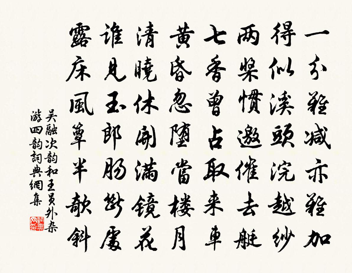 詩詞名句歷史字典書法欣賞書法字典國語詞典說文解字康熙字典古漢語字典標 題 作 者 詩 句 次韻和王員外雜游四韻作者:吳融 朝代:唐代次韻和王員外雜游四韻原文一分難減亦難加,得似溪頭浣越紗。兩槳慣邀催去艇,七香曾占取來車。黃昏忽墮當樓月,清曉休開滿鏡花。誰見玉郎腸斷處,露床風簟半欹斜。詩詞問答問:次韻和王員外雜游四韻的作者是誰?答:吳融問:次韻和王員外雜游四韻寫於哪個朝代?答:唐代吳融次韻和王員外雜游四韻書法欣賞次韻和王員外雜游四韻書法作品注釋全唐詩:卷684-20詩詞推薦安州般若寺水閣納涼,喜遇薛員外乂李白〔唐代〕翛然金園賞,遠近含晴光。樓台成海氣,草木皆天香。忽逢青雲士,共解丹霞裳。水退池上熱,風生松下涼。吞討登鳳凰樓再依李白鳳凰台韻乾隆〔清代〕謫仙當日事狂游,槌碎黃鶴夸風流。有無較版則且置,格高興逸吞山邱。故宮登樓名偶似,遠眺欲見蓬瀛洲。陡思買硯徐似道〔宋代〕俸余宜辦買山錢,卻買端州一硯磚。依舊被渠驅使出,買山之事定何年。鵲橋仙(旬會作)郭應祥〔宋代〕六丁文焰,六韜武略,那更六經心醉。六人相對座生風,繼六逸、當年舊事。六州清唱,六么妙舞,執樂仍呼六妓奉使崔都水翁下峽杜甫〔唐代〕無數涪江筏,鳴橈總發時。別離終不久,宗族忍相遺。白狗黃牛峽,朝雲暮雨祠。所過頻問訊,到日自題詩。滿庭芳佚名〔宋代〕清淨家風,如常合道,本來面目休迷。行住坐臥,何處不相隨。達理頭頭解脫,明心無作無為。君還悟,絲毫放過送曹黔南口號黃庭堅〔宋代〕摩圍山色醉今朝,試問歸程指斗杓。荔子陰成棠棣愛,竹枝歌是去思謠。陽關一曲悲紅袖,巫峽千波怨畫橈。歸去頌證道歌證道歌釋印肅〔宋代〕師子吼,無畏說,巍巍不動威光攝。十方法界現全身,且無伴侶相交涉。正樂府十篇農父謠皮日休〔唐代〕農父冤辛苦,向我述其情。難將一人農,可備十人征。如何江淮粟,挽漕輸鹹京。黃河水如電,一半沈與傾。均輸雜詠一百首姜詩劉克莊〔宋代〕晨興風色惡,日晏汲歸遲。寧與閨中訣,莫令堂上飢。秋日即事三首王之道〔宋代〕晚來何所喜,急雨洗新秋。幸遂登高賦,應容遇勝留。藕花明遠近,鷗鳥任沉浮。不用揮紈扇,何妨醉玉舟。紅林擒近陳允平〔宋代〕飛絮迷芳意,落梅銷暗香。皓鶴淚空碧,白鷗避寒塘。妨它踏青鬥草,便放曉日東窗。先自懶弄晨妝。誰奈靚笙簧棋盤仙跡韓信同〔宋代〕唐山絕頂棋盤石,戲局流傅名自昔。仇勒細間白髮翁,雲是仙人曾對奕。苔封石燈不敢多,竹引清風時拂試。箇中梅花陳與義〔宋代〕高花玉質照窮臘,破雪數枝春已多。一時傾倒東風意,桃李爭春奈晚何。和韻歸張通父詩卷陳杰〔宋代〕當年握手談何事,此日相觀一卷詩。湘竹恨深聽雨夜,洛英夢繼看花時。杜陵春好工添淚,宋玉秋清只益悲。猶有次韻周少隱梅花三絕葛立方〔宋代〕蠅館先生心若灰,猶憐梅蘤傍牆栽。瀛洲快睹春風面,卻笑江南苦未開。贈劉仲固胡寅〔宋代〕恭惟事契逾三紀,一醉昇州十八年。回念壯遊多契闊,欣逢情話重留連。珠庭骨相封侯在,金奏詩章落筆傳。預恐山園小梅·其一林逋〔宋代〕眾芳搖落獨暄妍,占盡風情向小園。疏影橫斜水清淺,暗香浮動月黃昏。霜禽欲下先偷眼,粉蝶如知合斷魂。幸有朝中措丘崈〔宋代〕尊前賓主角多才。亦許我同來。詩思競翻三峽,酒狂欲拗連台。身閒有限,莫辭光景,刻燭相催。沙路即看聯轡,與月船周君話別王同祖〔宋代〕鴨爐雨冷夜窗寒,著盡冬衣尚怯憚。忽憶故人千里別,雁齎芳恨度扶欄。名句推薦國有賢相良將,民之師表也。司馬遷《史記·七十列傳·太史公自序》 夢入藍橋,幾點疏星映朱戶。吳文英《荔枝香近·七夕》 倚篷窗無寐,引杯孤酌。張元乾《滿江紅·自豫章阻風吳城山作》 朗月清風,濃煙暗雨,天教憔悴度芳姿。李清照《多麗·詠白菊》 柔條紛冉冉,葉落何翩翩。曹植《美女篇》 涼風起天末,君子意如何。杜甫《天末懷李白》 襄陽古道灞陵橋,詩興與秋高。完顏璹《朝中措·襄陽古道灞陵橋》 即從巴峽穿巫峽,便下襄陽向洛陽。杜甫《聞官軍收河南河北》 故園便是無兵馬,猶有歸時一段愁陳與義《送人歸京師》 朝聞遊子唱離歌,昨夜微霜初渡河。李頎《送魏萬之京》