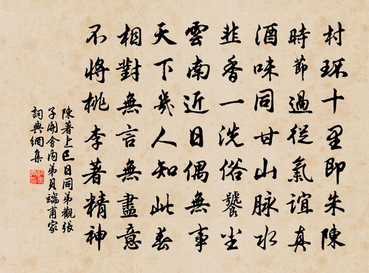 詩詞名句歷史字典書法欣賞書法字典國語詞典說文解字康熙字典古漢語字典標 題 作 者 詩 句 上巳日同弟觀張子開會內弟貝端甫家作者:陳著 朝代:宋代原文村環十里即朱陳,時節過從氣誼真。酒味同甘山脈水,韭香一洗俗饕塵。雲南近日偶無事,天下幾人知此春。相對無言無盡意,不將桃李著精神。詩詞問答問:《上巳日同弟觀張子開會內弟貝端甫家》的作者是誰?答:陳著問:該詩寫於哪個朝代?答:宋代書法欣賞上巳日同弟觀張子開會內弟貝端甫家書法作品詩詞推薦讀史陸游〔宋代〕民間斗米兩三錢,萬里耕桑罷戍邊。常使屏風寫無逸,應無烽火照甘泉。臥病孟郊〔唐代〕貧病誠可羞,故床無新裘。春色燒肌膚,時餐苦咽喉。倦寢意蒙昧,強言聲幽柔。承顏自俯仰,有淚不敢流。默默翰林作劉鄴〔唐代〕曾是江波垂釣人,自憐深厭九衢塵。浮生漸老年隨水,往事曾聞淚滿巾。已覺遠天秋色動,不堪閒夜雨聲頻。多慚悼亡秘書方逢振〔宋代〕翠華東南來,奎聚屬吳域。分王百餘年,靈光赫天德。龍文發南源,圖書粲東壁。誰折天罅開,猝忽正氣泄。剖藏催妝盧儲〔唐代〕昔年將去玉京游,第一仙人許狀頭。今日幸為秦晉會,早教鸞鳳下妝樓。送李道士(一本題下有歸桃花崦四字)顧況〔唐代〕人境年虛擲,仙源日未斜。羨君乘竹杖,辭我隱桃花。鳥去寧知路,雲飛似憶家。莫愁客鬢改,自有紫河車。五月一日寄正仲舒岳祥〔宋代〕信處村非遠,別時山更多。花風起晴浪,草露落明河。世事老休問,故人今幾時。朝來新酒禁,煮餅臥岩阿。古梅熊瑞〔宋代〕風度飄飄一世豪,偃然猶自外離騷。諸公慣作交婆熊,動說山人索價高。挈榼晁公溯〔宋代〕挈榼吾何往,閒臨積水邊。晚紅看落日,春碧愛晴川。蜂蝶低窺酒,鳧鷖狎近船。平生五湖興,見此一欣然。百丈和尚贊釋師觀〔宋代〕獨坐大雄峰,宗通說亦通。咄者老漆桶,不落有無中。曲肱詩二十首白玉蟾〔宋代〕不把雙眸看俗人,五湖四海一空身。洞天深處無人到,溪上桃花幾度春。木蘭花慢 送陳國材都目朱唏顏〔元代〕拂溪藤香潤,緘翠墨,寄深情。憶月滿簫台,春回炎海,驛騎宵征。相思頓成春夢,恰方州、接武敘前盟。愧我弓高竹八首邵雍〔宋代〕高竹臨清溝,軒小亦且幽。光陰雖屬夏,風露已驚秋。月色林間生,泉聲砌下流。誰知此夜情,邈矣不能收。次韻和十六兄先輩見寄楊億〔宋代〕秋風苦憶鱠霜鱗,暫剖銅符出紫宸。一路雪寒多挾纊,幾程山險欲摧輪。清香撲鼻梅林近,秀色凝眸麥壠新。閉閣用元韻答麟老王炎〔宋代〕七閩名家子,祝髮隱梵宮。碧海掉尾鯨,不墮世網中。熏爐起香霧,棕拂生清風。寂寂枯木岩,中有春意融。杖屨自邊江赴守鄱陽黃原道中作李彌遜〔宋代〕海南三年一夢成,北來重聽偃溪聲。凝雲帶雨留愁住,茂樹隨山送客行。秔稻沿崖畦上下,茅茨枕谷路縱橫。莫從倦尋芳慢·露晞向晚王雱〔宋代〕露晞向晚,簾幕風輕,小院閒晝。翠逕鶯來,驚下亂紅鋪繡。倚危牆,登高榭,海棠經雨胭脂透。算韶華,又因循過虎溪范成大〔宋代〕過溪無限翠屏開,大笑從教虎子猜。不獨山中添故事,仍教題作小飛來。木蘭花/玉樓春張先〔宋代〕去年春入芳菲國。青蕊如梅終忍摘。闌邊徒欲說相思,綠蠟密緘朱粉飾。歸來故苑重尋覓。花滿舊枝心更惜。鴛鴦酬堯夫招持牡丹司馬光〔宋代〕君家牡丹今盛開,二十四枝為一栽。主人果然青眼待,正忙亦須偷暇來。名句推薦今日清明節,園林勝事偏。賈島《清明日園林寄友人》 善謀生者,但令長幼內外,勤修恆業,而不必富其家王永彬《圍爐夜話·第九則》 水流花謝兩無情,送盡東風過楚城。崔塗《春夕》 眾中聞謦欬,未語知鄉里。蘇軾《送金山鄉僧歸蜀開堂》 如今但暮雨,蜂愁蝶恨,小窗閒對芭蕉展。呂渭老《薄倖·青樓春晚》 青海長雲暗雪山,孤城遙望玉門關。王昌齡《從軍行七首·其四》 江晚正愁予,山深聞鷓鴣。辛棄疾《菩薩蠻·書江西造口壁》 謫仙何處,無人伴我白螺杯。黃庭堅《水調歌頭·遊覽》 誓將掛冠去,覺道資無窮。岑參《與高適薛據同登慈恩寺浮圖》 崑崙之高有積雪,蓬萊之遠常遺寒。王令《暑旱苦熱》