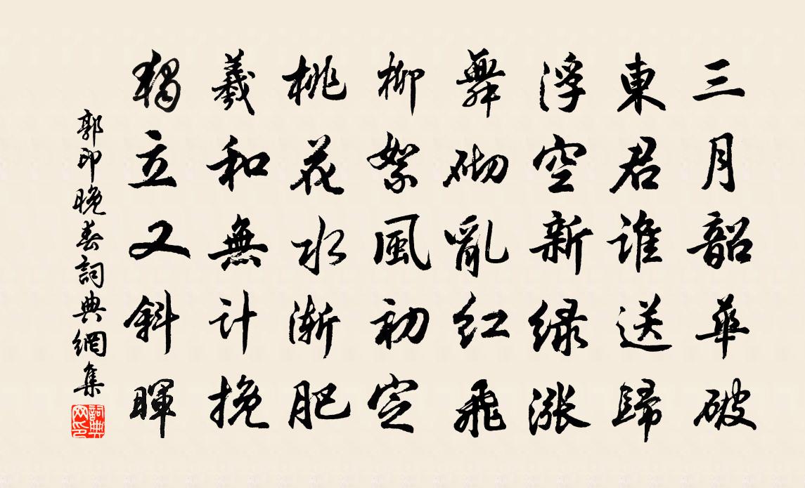詩詞名句歷史字典書法欣賞書法字典國語詞典說文解字康熙字典古漢語字典標 題 作 者 詩 句 晚春作者:郭印 朝代:宋代晚春原文三月韶華破,東君誰送歸。浮空新綠漲,舞砌亂紅飛。柳絮風初定,桃花水漸肥。羲和無計挽,獨立又斜暉。詩詞問答問:晚春的作者是誰?答:郭印問:晚春寫於哪個朝代?答:宋代郭印晚春書法欣賞晚春書法作品詩詞推薦送吳都曹還蕪湖張舜民〔宋代〕柳嶺相從歲屢遷,南湖同泛又經年。齋前怪石曾為枕,門外長楊憶繫船。白酒一壺賢聖樂,古書千卷弟兄傳。九衢張都統懷古四首郭印〔宋代〕殷勤圯上一編書,漢四百年歸卷舒。晚節莫教閒辟穀,皇王事業豈難如。奉和張使君宴加朝散盧象〔唐代〕佐理星辰貴,分榮渙汗深。言從大夫後,用答聖人心。騎擁軒裳客,鸞驚翰墨林。停杯歌麥秀,秉燭醉棠陰。爽氣醉蓬萊(代上陳帥生日)洪适〔宋代〕正中秋初過,重陽相近,金莖多露。玉燕開祥,喜氣浮庭戶。覽鳳千峰,驂鸞八桂,未展青雲步。碧玉篸邊,紅蓮巫山高李賀〔唐代〕碧叢叢,高插天,大江翻瀾神曳煙。楚魂尋夢風颯然,曉風飛雨生苔錢。瑤姬一去一千年,丁香筇竹啼老猿。古祠趙季茂通判惠詩走筆奉和十篇岳珂〔宋代〕晴佳雨亦宜,雲黑又催詩。靜處景俱勝,閒中趣自知。攀條隨客嗅,卷葉看兒吹。世事只如此,吾今何所為。立夏日泛舟游青山憩楊氏庵示諸生孫應時〔宋代〕歲序忽雲夏,青春去安歸。天清風氣朗,遊子懷芳菲。碧湖泛我舟,輕雲湛晴暉。入谷山寂寂,緣溪水圍圍。悠然醉義歌寺公大師〔遼代〕曉來雨霽日蒼涼,枕幃搖曳西風香。困眠未足正展轉,兒童來報今重陽。吟兒蒼蒼渾塞色,客懷袞袞皆吾鄉。斂衾湖州覺海彌陀閣張景脩〔宋代〕仙潭覺海唐興善,像設瑰琦古至今。殿柱倒書雷部火,市橋橫渡木觀音。窗前竹影搖金翠,風外蓮香散水沉。況有郡中迎懷玉山應真請雨得之未沾足曾幾〔宋代〕憫雨連三月,為霖抵萬金。小垂開士手,足慰老農心。果欲千倉積,猶須一尺深。病夫渾不寢,危坐聽佳音。水調歌頭李處全〔宋代〕金節照南國,畫戟壯陪都。嚴譙古角霜曉,雄勝壓全吳。蔥倩采香古徑,縹緲折梅新奏,春事早關渠。誰識使君意東坡引(龍江趙去非席上)趙師俠〔宋代〕杯行情意密。今宵是何夕。行人此別真堪惜。愁腸空悶郁。明朝去也,回首相憶。要留戀、如何得。無端驟雨飄何秋夜懷紫閣峰僧鮑溶〔唐代〕滿山雨色應難見,隔澗經聲又不聞。紫閣夜深多入定,石台誰為掃秋雲。車中曾黯〔宋代〕頻歲驅馳行萬里,還家幸埃敢言疲。雨寒倦馬愁長路,日落棲禽揀穩枝。兩扉攜持高老畫,一編吟詠放翁詩。客途蝶戀花佚名〔宋代〕意。崔氏緘報之詞,粗載於此,曰:“捧覽來問,撫愛過深。兒女之情,悲喜交集。兼惠花勝一合,口脂五寸。致瑞鷓鴣徐照〔宋代〕兩多庭石上苔文。門外春光老幾分。為把舊書藏寶帶,誤翻殘酒濕綃裙。風頭花片難裝綴,愁里鶯聲怯聽聞。恰似西興泊舟陸游〔宋代〕衰發不勝白,寸心殊未降。避風留水市,岸幘倚船窗。日上金熔海,潮來雪卷江。登臨數奇觀,未易敵吾邦。覺初上人釋祖欽〔宋代〕靈覺之初,廓然太虛。巘雲平岳頂,海月照珊瑚。描不如,畫不如,詠不如,一段靈光今古無。元是兜率橋頭,三次韻胡明仲見寄朱翌〔宋代〕去年玉筍班,仰視見櫑具。論事似陸贄,任事似裴度。今年起衡山,出守非不遇。床頭看周易,象在益長裕。解琴西城有懷舊遊賀鑄〔宋代〕西郭天泉里,依依得舊遊。綺羅紅芰曉,絲管萬蟬秋。柳礙鞦韆陌,萍枕祓褉舟。華年勿復道,誰為駐東流。名句推薦今宵酒醒何處?楊柳岸,曉風殘月。柳永《雨霖鈴·寒蟬淒切》 別離滋味濃於酒。著人瘦。此情不及牆東柳。春色年年如舊。張耒《秋蕊香·簾幕疏疏風透》 黃河之水天上來,奔流到海不復回。李白《將進酒》 那堪疏雨滴黃昏。更特地、憶王孫。歐陽修《少年游·欄乾十二獨憑春》 柳絮風輕,梨花雨細。謝逸《踏莎行·柳絮風輕》 啼鶯舞燕,小橋流水飛紅。白樸《天淨沙·春》 譬猶使人負劍,而求其壽也。墨子《墨子·25章 節葬(下)》 天涯倚樓新恨,楊柳幾絲碧。晏幾道《六么令·雪殘風信》 迸籜分苦節,輕筠抱虛心。柳宗元《巽公院五詠·苦竹橋》 把君詩卷燈前讀, 詩盡燈殘天未明。白居易《舟中讀元九詩》