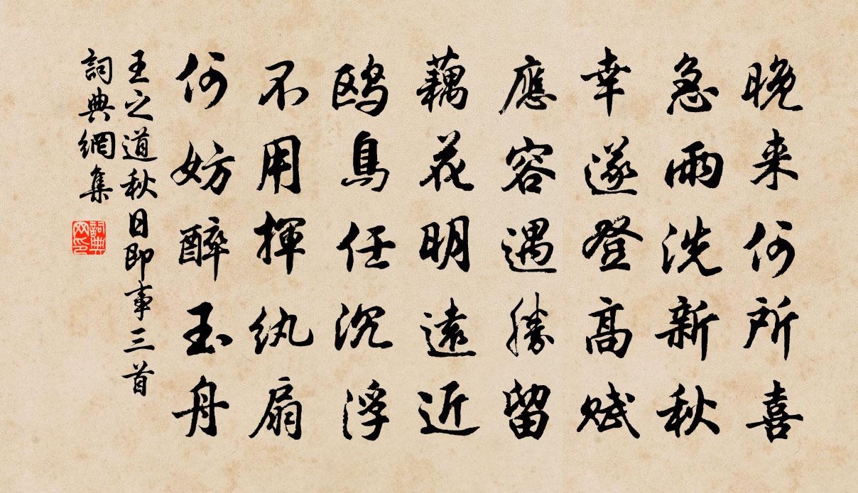 詩詞名句歷史字典書法欣賞書法字典國語詞典說文解字康熙字典古漢語字典標 題 作 者 詩 句 秋日即事三首作者:王之道 朝代:宋代秋日即事三首原文晚來何所喜,急雨洗新秋。幸遂登高賦,應容遇勝留。藕花明遠近,鷗鳥任沉浮。不用揮紈扇,何妨醉玉舟。詩詞問答問:秋日即事三首的作者是誰?答:王之道問:秋日即事三首寫於哪個朝代?答:宋代王之道秋日即事三首書法欣賞秋日即事三首書法作品詩詞推薦寄仁侄釋智圓〔宋代〕庭木西風動,閒軒落葉稠。夢回霜月曉,信斷海山秋。道性歸無念,孤吟已絕愁。況疏林下約,煙水路悠悠。華山鄭谷〔唐代〕峭仞聳巍巍,晴嵐染近畿。孤高不可狀,圖寫盡應非。絕頂神仙會,半空鸞鶴歸。雲台分遠靄,樹谷隱斜暉。墜石宮詞宋白〔宋代〕春來車駕入西都,父老千人拜路隅。潛問馬嵬端正樹,枝條猶似舊家無。句戴衢〔唐代〕坐落千門日,吟殘午夜燈。白居易有望闕雲遮眼思鄉雨滴心之句用其韻為鄭剛中〔宋代〕頃隨千官群,曉入丹鳳闕。侍立近金爐,下殿香未歇。宮槐零露清,馬穩寧憂蹶。日近長安遠,福過難辭拙。聖主題汪水雲詩卷十首胡斗南〔宋代〕老來無意謁侯門,自愛梅花水月村。更擬孤山結茅屋,杖藜聊覆信乾坤。雜興十首以貧堅志士節病長高人情為韻陸游〔宋代〕貨財不可居,祿位不可饕,我爾本一家,何至皋蘭鏖?小夫謀人國,紛紛日煎熬,或謂性本惡,或謂經無褒,誤人早朝書事司馬光〔宋代〕太白明如李,東方三丈高。晨光孤照闕,霧氣濕侵袍。槐柳經霜慘,驊騮得路豪。素飧無小補,府仰愧金鰲。辛未九日晦日周文璞〔宋代〕遺體即母身,哀哀勿重陳。一貽泉壤憂,兩見霜露晨。繁霜與重露,塗抹隨荊榛。身即未殞滅,強與松伯春。遂於頌古釋道顏〔宋代〕作家相見終不錯,兩兩同時看啐啄。喝下雖然賓主分,爭如普化搖鈴鐸。疏影吳潛〔宋代〕佳人步玉。待月來弄影,天掛參宿。冷透屏幃,清入肌膚,風敲又聽檐竹。前村不管深雪閉,猶自繞、枝南枝北。詠隔塹梅趙蕃〔宋代〕叢篁亂臨溪,叢樹深隔塹。愛之不能即,玩之寧有厭。五字遣誰喔,一杯頻爾念。幸勿折新開,留將遂幽占。出門王令〔宋代〕出門萬事非,聊復閉關坐。親識久相遠,與世絕吊賀。適時既非謀,接俗益加惰。外物等不來,何必問客過。宿雲溪觀,賦得秋燈引送客楊衡〔唐代〕雲房寄宿秋夜客,一燈熒熒照虛壁。蟲聲呼客客未眠,幾人語話清景側。不可離別愁紛多,秋燈秋燈奈別何。贈溪翁王建〔唐代〕溪田借四鄰,不省解憂身。看日和仙藥,書符救病人。伴僧齋過夏,中酒臥經旬。應得丹砂力,春來黑髮新。惜別行,送向卿進奉端午御衣之上都杜甫〔唐代〕肅宗昔在靈武城,指揮猛將收鹹京。向公泣血灑行殿,佐佑卿相乾坤平。逆胡冥寞隨煙燼,卿家兄弟功名震。麒麟豆葉黃/憶王孫呂渭老〔宋代〕晚妝新試碧衫涼。金鴨猶殘昨夜香。柳際風來月滿廊。一雙雙。人對鴛鴦浴小塘。依韻和永叔雪後見寄兼雲自尹家兄弟及幾道散梅堯臣〔宋代〕常欲登芒嶺,無由見洛橋。雪飛關戍迥,人憶剡溪遙。廣隰嘶征雁,長河起怒飈。遽言歡友散,能使去魂銷。晚日送汪以南教授方回〔宋代〕未至無氈坐客寒,興闌自欲早休官。新下澤車款段馬,舊逢掖衣章甫冠。冷看群飛終可愕,真能勇退豈為難。人生天馬歌司馬光〔宋代〕大宛汗血古共知,青海龍種骨更奇。綱絲舊畫昔嘗見,不意人間今見之。銀鞍玉鐙黃金轡,廣路長鳴增意氣。富平名句推薦歲暮鋤犁傍空室,呼兒登山收橡實。張籍《野老歌 / 山農詞》 高山仰止,景行行止。佚名《車舝》 改章難於造篇,易字艱於代句劉勰《文心雕龍·附會》 一騎紅塵妃子笑,無人知是荔枝來。杜牧《過華清宮絕句三首》 寒眼亂空闊,客意不勝秋。楊炎正《水調歌頭·登多景樓》 是親不是親,非親卻是親。佚名《增廣賢文·上集》 若農服田力穡,乃亦有秋。佚名《尚書·商書·盤庚上》 唯見鴻雁飛,令人傷懷抱。高適《登百丈峰二首》 策馬自沙漠,長驅登塞垣。高適《薊中作》 不義不富,不義不貴,不義不親,不義不近。墨子《墨子·08章 尚賢(上)》
