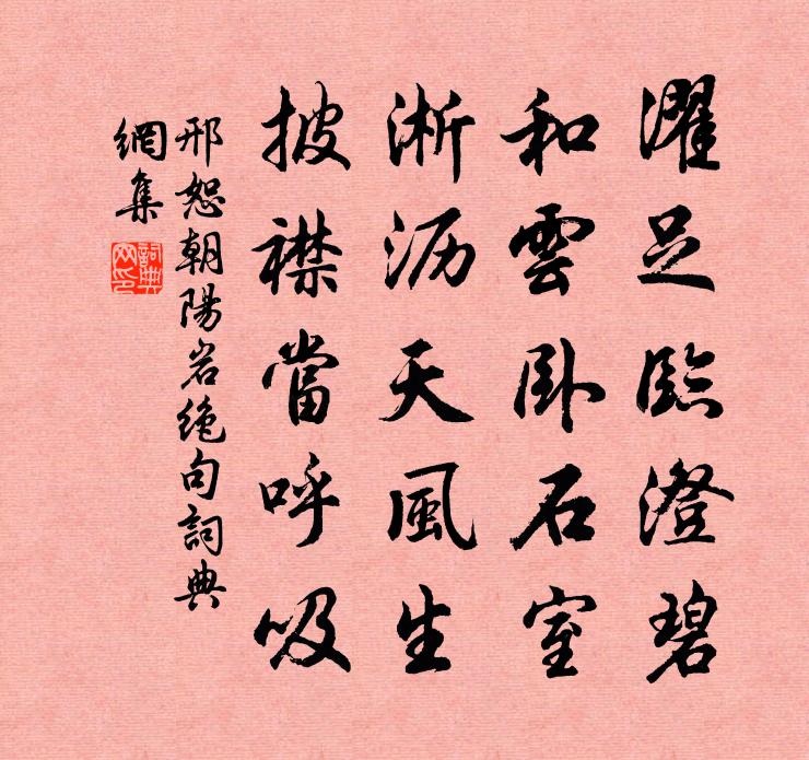 詩詞名句歷史字典書法欣賞書法字典國語詞典說文解字康熙字典古漢語字典標 題 作 者 詩 句 朝陽岩絕句作者:邢恕 朝代:宋代朝陽岩絕句原文濯足臨澄碧,和雲臥石室。淅瀝天風生,披襟當呼吸。詩詞問答問:朝陽岩絕句的作者是誰?答:邢恕問:朝陽岩絕句寫於哪個朝代?答:宋代邢恕朝陽岩絕句書法欣賞朝陽岩絕句書法作品詩詞推薦使至三姓咽面張宣明〔唐代〕昔聞班家子,筆硯忽然投。一朝撫長劍,萬里入荒陬。豈不服艱險,只思清國讎。山川去何歲,霜露幾逢秋。玉塞游山陽十首陳造〔宋代〕邗溝帆席即長淮,鬢未霜時慣往回。絳縣老人今若此,此生更復幾番來。頌證道歌證道歌釋印肅〔宋代〕深成認賊將為子,可惜祖宗田人土。如今敗缺卒難收,浪死虛生長劫苦。壬子除夕陸游〔宋代〕前村後村燎火明,東家西家爆竹聲。老逢新正幸強健,卻視徂歲何崢嶸!兒時祝身願事主,談笑可使中原清。豈知壽安雜詩十首藏珠石司馬光〔宋代〕不齧東山根,土色渥如丹。危峰忽摧脫,半崖銜石丸。陰陽昔融結,神化不可原。初疑偓佺養靈藥,魑魅觸之無故和利州鮮于轉運公劇八詠竹軒司馬光〔宋代〕茲軒最灑落,歷歷種琅玕。正書簿書稀,蕭蕭風雨寒。翠陰涼宴坐,疏韻承清歡。錦籜裁夏扇,玉筍供春盤。晴蝸台州兜率寺淳熙三年孟春作林憲〔宋代〕一榻江色近,夜氣欲空濛。柔櫓晚潮上,寒燈深樹中。四山杳煙霧,月華忽陵空。我亦眾念息,簾影空玲瓏。自悼薛令之〔唐代〕朝日上團團,照見先生盤。盤中何所有,苜蓿長闌乾。飯澀匙難綰,羹稀箸易寬。只可謀朝夕,何由保歲寒。沁園春(壽王高安,七月二十八日)姚勉〔宋代〕超逸天才,文如三松,詩如盧溪。自白蓮賦就,已高聲價,梅花句出,遠見襟期。玉塵精神,瑤林風韻,雪裡神仙乳燕飛周密〔宋代〕山、碧浪湖者,皆橫陳於前,特吾幾席中一物耳。遙望具區,渺如煙雲;洞庭、縹緲諸峰,矗矗獻狀,蓋王右丞、賦長道一絕送陸邃潛夫皇甫冉〔唐代〕高山迥欲登,遠水深難渡。杳杳復漫漫,行人別家去。正月十日夜大雷震范成大〔宋代〕阿香真是健婦,夜半鼓行疾驅。直恐南山破碎,絕憐窗紙枝梧。次韻西山洪咨夔〔宋代〕山深莫道得春遲,雲漏晴光已大奇。夾徑幽香吹艾納,隔林絕艷點燕支。一川遠近迷漁屋,兩市東西認酒旗。錦野金陵雜興二百首蘇泂〔宋代〕蓮花博士去騎鯨,鏡曲回瞻一愴情。少待詩成附河伯,願加塗乙始流行。婦女之孝二十首唐氏婦林同〔宋代〕姑今病且死,頗愧婦恩深。但願婦有子,皆如婦用心。偶書舒邦佐〔宋代〕酒盡瓶乾一再添,朔風吹葉響階前。起來水墨圖中望,正是江南欲雪工。天慶知觀蕭惟清寫予真求贊周必大〔宋代〕塵滿形容雪滿頭,分無仙骨到瀛洲。希夷更請旁人看,曾急流中勇退不。紹聖甲戌侍立集英殿臨軒試舉人作此兩絕張耒〔宋代〕春來小殿雪初殘,曉日曈曨未破寒。黃傘當軒公事退,君王緩步侍臣闌。永遇樂(蔡州移守潁昌,與客會別臨芳觀席上)葉夢得〔宋代〕天末山橫,半空簫鼓,樓觀高起。指點栽成,東風滿院,總是新桃李。綸巾羽扇,一尊飲罷,目送斷鴻千里。攬清癸未八月十四日至十六夜月色皆佳曾幾〔宋代〕年年歲歲望中秋,歲歲年年霧雨愁。涼月風光三夜好,老夫懷抱一生休。明時諒費銀河洗,缺處應須玉斧修。京洛名句推薦同惡相助,同好相留,同情相成,同欲相趨,同利相死。司馬遷《史記七十列傳·吳王濞列傳》 五月五日午,贈我一枝艾。文天祥《端午即事》 西施越溪女,出自薴蘿山。李白《西施 / 詠薴蘿山》 昨夜星辰昨夜風,畫樓西畔桂堂東。李商隱《無題·昨夜星辰昨夜風》 投我以木瓜,報之以瓊琚。佚名《木瓜》 金谷園中柳,春來似舞腰。李益《上洛橋》 深林人不知,明月來相照。王維《竹里館》 按其實而審其名,以求其情;聽其言而察其類,無使方悖。呂不韋《呂氏春秋·覽·審分覽》 南朝四百八十寺,多少樓台煙雨中。杜牧《江南春》 灞橋楊柳年年恨,鴛浦芙蓉葉葉愁。蘇庠《鷓鴣天·楓落河梁野水秋》