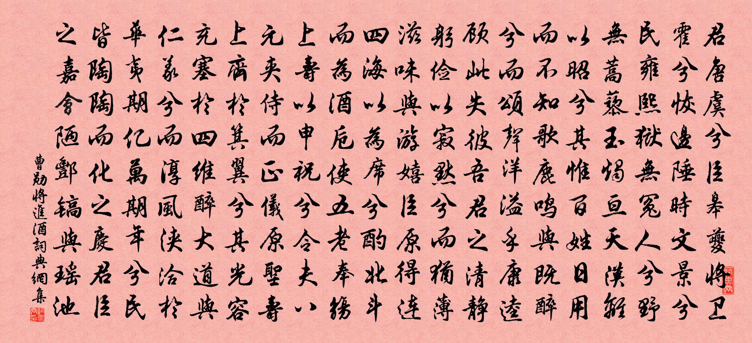 詩詞名句歷史字典書法欣賞書法字典國語詞典說文解字康熙字典古漢語字典標 題 作 者 詩 句 將進酒作者:曹勛 朝代:宋代將進酒原文君唐虞兮臣皋夔,將衛霍兮恢邊陲。時文景兮民雍熙,獄無冤人兮野無蒿藜。玉燭亘天漢離以昭兮,其惟百姓日用而不知。歌鹿鳴與既醉兮,而頌聲洋溢乎康逵。顧此失彼吾君之清靜躬儉以寂默兮,而猶薄滋味與游嬉。臣原得連四海以為席兮,酌北斗而為酒卮。使五老奉觴上壽以申祝兮,令夫八元夾侍而正儀。原聖壽上齊於箕翼兮,其光容充塞於四維。醉大道與仁義兮,而淳風浹洽於華夷。期億萬期年兮,民皆陶陶而化之。慶君臣之嘉會,陋酆鎬與瑤池。詩詞問答問:將進酒的作者是誰?答:曹勛問:將進酒寫於哪個朝代?答:宋代曹勛將進酒書法欣賞將進酒書法作品詩詞推薦遙酬袁使君高春暮行縣,過報德寺見懷皎然〔唐代〕江春行求瘼,偶與真境期。見說三陵下,前朝開佛祠。停舟仰麗剎,繡組發香墀。咫尺空界色,天人花落時。盛游【中呂】陽春曲_墨磨北海烏張弘范〔元代〕墨磨北海烏龍角,筆蘸南山紫兔毫。花箋鋪展硯台高,詩氣豪,憑換紫羅袍!石榴子露顏回齒,菡萏花含月女姿。偈頌八十五首釋妙倫〔宋代〕心心,拙婦穿穴針。智智,巫師罵土地。道道,矮子肩栲栳。佛佛,烏鴉啗腐骨。綠綺七詠曹勛〔宋代〕連滄觀下兩軍分,金勒爭馳笑語溫。綽撥未能防輩棒,飛星時聽過毬門。百字令 壽老妻八十 以上二首見麟原後集卷十王禮〔元代〕晨看婺女,正流光垂照,耆昌堂里。只為佳人延眉壽,影入玉杯迎喜。莫道春秋,八千八百,玄遠都難擬。人生稀八絕詩陽冰篆王禹偁〔宋代〕泠泠庶子泉,落落陽冰筆。雲氣勢崩垂,龍蛇互蟠屈。嶧山既劘滅,石鼓又缺失。唯茲數十字,遒勁倚雲窟。模印和士特南浦詩劉子翬〔宋代〕羽檄分兵控上流,時傳烽火過鄰州。樓船半渡旌旗曉,胡馬欲來江漢秋。淝水投鞭真流語,幄中借箸有奇謀。吾儒雜曲歌辭。壯士吟賈島〔唐代〕壯士不曾悲,悲即無回期。如何易水上,未歌先淚垂。送曹商之宿州兼簡駱偃釋宇昭〔宋代〕病起春城暮,行心暗結愁。全吳無舊業,半世祇羈游。島霧沈晴樹,汀煙入夜舟。故人應老大,佐幕久淹流。遣興七首李流謙〔宋代〕僻處便身懶,閒居喜歲豐。蟲絲轉窗日,鳥語度溪風。疎竹斬新綠,晚花隨分紅。高人莫相訪,不比臥隆中。偶作劉黻〔宋代〕四十一年身,天南作逐臣。病居僧卻到,淡飯仆猶嗔。州淺稀高木,山荒闕伏神。退藏還有味,所憾遠雙親。秋日山居好十首舒岳祥〔宋代〕秋日山居好,清涼雁過初。雞頭消暑夕,鴨腳待霜余。莫淨蜃虻遠,瓜香蚤蟻除。小園新雨過,菜甲自刪鋤。奉和幸安樂公主山莊應制韋元旦〔唐代〕銀河南渚帝城隅,帝輦平明出九衢。刻鳳蟠螭凌桂邸,穿池疊石寫蓬壺。瓊簫暫下鈞天樂,綺綴長懸明月珠。仙榜懷鄭文山陳宓〔宋代〕早遂山林志,於今一代豪。平生唯質實,四海仰孤高。久欲問奇字,先令餉濁醪。相望廿里近,可笑自塵勞。秋夜西崗聯句晁補之〔宋代〕城南遠人跡,蟲響最先秋。河漢橫疑近,星辰爛不收。露濃枝上月,風駛苑中籌。下直身田野,相忘世馬牛。市聲古戍劉基〔明代〕古戍連山火,新城殷地笳。九洲猶虎豹,四海未桑麻。天迥雲垂草,江空雪覆沙。野梅燒不盡,時見兩三花。次周益公韻樓鑰〔宋代〕六一先生葛稚川,兩孫俱並相君年。詞場鏖戰今成夢,潭府齊盟望若仙。政路三公舊同甲,洛陽四老信差肩。坊名頌古一百二十一首釋宗杲〔宋代〕身上著衣方免寒,口邊說食終不飽。大唐國里老婆禪,今日為君注破了。忽忽韓愈〔唐代〕忽忽乎余未知生之為樂也,願脫去而無因。安得長翮大翼如雲生我身,乘風振奮出七合。絕浮塵,死生哀樂兩相棄點絳唇 高照 先生,宋朝遺老也,嘗有長短邵亨貞〔元代〕每育之,自可想見屯落秋深景物。近見吳野舟誦,而涵詠不已,有當予心,故述即景,且期後約。極目平蕪,渚寒名句推薦啼號升斗抵千金,凍雀飢鴉共一音。范成大《雪中聞牆外鬻魚菜者求售之聲甚苦有感》 人生在勤,不索何獲。范曄《後漢書·列傳·張衡列傳》 女也不爽,士貳其行。士也罔極,二三其德。佚名《氓》 積善之家必有餘慶,積不善之家必有餘殃。佚名《易傳·文言傳·坤文言》 佇聽寒聲,雲深無雁影。周邦彥《關河令·秋陰時晴漸向暝》 梁園日暮亂飛鴉,極目蕭條三兩家。岑參《山房春事二首》 一疑一信相參勘,勘極而成知者,其知始真。洪應明《菜根譚·概論》 但存夫子三分禮,不犯蕭何六尺條。馮夢龍《醒世恆言·卷十三》 千萬恨,恨極在天涯。溫庭筠《夢江南·千萬恨》 春恨秋悲皆自惹,花容月貌為誰妍。曹雪芹《紅樓夢·第五回》