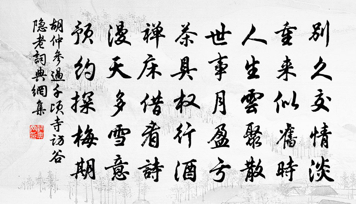 詩詞名句歷史字典書法欣賞書法字典國語詞典說文解字康熙字典古漢語字典標 題 作 者 詩 句 過千頃寺訪谷隱老作者:胡仲參 朝代:宋代過千頃寺訪谷隱老原文別久交情淡,重來似舊時。人生雲聚散,世事月盈虧。茶具權行酒,禪床借看詩。漫天多雪意,預約探梅期。詩詞問答問:過千頃寺訪谷隱老的作者是誰?答:胡仲參問:過千頃寺訪谷隱老寫於哪個朝代?答:宋代胡仲參過千頃寺訪谷隱老書法欣賞過千頃寺訪谷隱老書法作品詩詞推薦寄十扇與陳述之曾幾〔宋代〕饒陽輕箑人共知,封書寄與今其時。清風兩腋想披拂,明月千里能追隨。一朝貴重得謝傅,中道捐棄憐班姬。吾徒相和歌辭。江南曲八首劉希夷〔唐代〕暮宿南洲草,晨行北岸林。日懸滄海闊,水隔洞庭深。煙景無留意,風波有異潯。歲游難極目,春戲易為心。朝夕家僕來叢桂告米粟不繼王炎〔宋代〕來時花柳未全春,燕子將雛已夏深。破鏡望中占遠信,扊扅歌里有悲音。青衫得祿猶彈鋏,白髮欺人慾上簪。築室陽春曲/陽春史達祖〔宋代〕杏花煙,梨花月,誰與暈開春色。坊巷曉愔愔,東風斷、舊火銷處近寒食。少年蹤跡。愁暗隔、水南山北。還是寶頌古八首釋道顏〔宋代〕罵他還自罵,嗔他還自嗔。戒之慎之,出乎爾者,反乎爾者也。偶成 其二王冕〔元代〕萬里長山走薊門,嶄然天險中路分。高風吹雨作飛雪,老樹積煙成凍雲。武帳駐兵談亞父,氈城無語及昭君。夜深道士張鑄〔宋代〕乘龍控魯真吾偶,化石燒金即我曹。塵世混來名異跡,蓬山思去夢魂勞。吟依古柏天風斷。嘯近倦壇海月高。九轉官軍行汪琬〔清代〕亂飛沙禽吠村狗,官軍夜逾谷城口。大船小船爭避行,長年吞聲復搖手。錦袍繡箙月中明,牛肉粗肥挏乳清。胡琴同吳居安入開善四首出山劉子翬〔宋代〕日日冬氣昏,霜風不鐮面。回輿始見山,數點寒中現。我行得勝友,笑語生華絢。如何劍峰南,咫尺不常見。地震蒲松齡〔清代〕康熙七年六月十七日戌刻,地大震。余適客稷下,方與表兄李篤之對燭飲。忽聞有聲如雷,自東南來,向西北去。詠懷二首·其一李賀〔唐代〕長卿懷茂陵,綠草垂石井。彈琴看文君,春風吹鬢影。梁王與武帝,棄之如斷梗。惟留一簡書,金泥泰山頂。禁林宴會之什楊徽之〔唐代〕星移歲律應青陽,得奉群英集玉堂。龍鳳雙飛觀御札,雲霞五色詠天章。禁林漸覺清風暖,仙界元知白日長。詔出春暮趙希逢〔宋代〕路入清溪一帶橋,滿汀紅紫半零凋。數峰髧鬌山堆髻,百態妖嬈柳颭腰。聯轡踏花嘶寶馬,當壚換酒解金貂。堂堂五用喜雨韻三首吳潛〔宋代〕暗雲潑雨土生香,不假琮黃與璧蒼。天道從來關感應,人閒此際換炎涼。青燈可近聊憑案,緗帙堪翻謾啟箱。窗外句孫甫〔宋代〕衰病自憐無酒趣,塵容猶賴有詩情。敗簾六韻吳融〔唐代〕有客編來久,彌年斷不收。不堪風作候,豈復燕為讎?盡見三重閣,難迷百尺樓。伴燈微掩夢,兼扇劣遮羞。零落尋裴處士孟郊〔唐代〕涉水更登入,所向皆清真。寒草不藏徑,靈峰知有人。悠哉鍊金客,獨與煙霞親。曾是欲輕舉,誰言空隱淪。遠心偈頌十二首釋安永〔宋代〕枯木生花劫外春,馨香逼界古今聞。忽然樹倒歸何處,猿叫千山月滿船。觀獵行王邁〔宋代〕落日飛山上,山下人呼獵。出門縱步觀,無遑需屐屧。至則聞獵人,喧然肆牙頰。或言岐徑多,御者因追躡。或言賀行軍太傅得《白氏東林集》齊己〔唐代〕樂天歌詠有遺編,留在東林伴白蓮。百尺典墳隨喪亂,一家風雅獨完全。常聞荊渚通侯論,果遂吳都使者傳。仰賀名句推薦井放轆轤閒浸酒,籠開鸚鵡報煎茶。張蠙《夏日題老將林亭》 無求到處人情好,不飲任他酒價高。佚名《增廣賢文·上集》 借問承恩者,雙蛾幾許長?皇甫冉《婕妤怨》 八陣圖名成臥龍,六韜書功在飛熊。查德卿《蟾宮曲·懷古》 鳥宿池邊樹,僧敲月下門。賈島《題李凝幽居》 君子不動而敬,不言而信。子思《中庸·第三十三章》 黃河水繞漢宮牆,河上秋風雁幾行。李夢陽《秋望》 侵陵雪色還萱草,漏泄春光有柳條。杜甫《臘日》 簾控鉤,掩上珠樓,風雨替花愁喬吉《春閨怨·不系雕鞍門前柳》 今日俸錢過十萬,與君營奠復營齋。元稹《遣悲懷三首·其一》