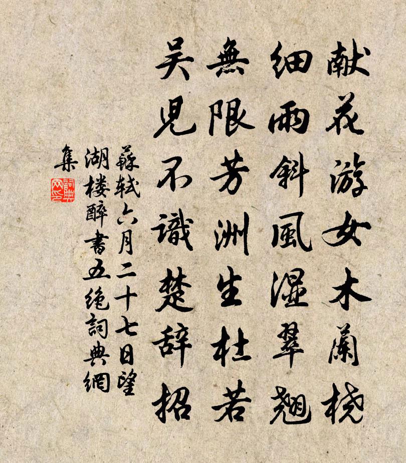 這首詩首句中的“游女”當是採蓮女。因為從這一組五首詩看,蘇軾應該始終都在望湖樓上,所以木蘭橈上的該是“游女”。旁人不可能跳到水裡給她們獻花。倒是她們近水樓台,可以采了荷花獻給別人。所以這第一句是寫“游女”們獻花給遊客。水裡採花的“游女”,應該就是採蓮女了。天上下雨了,採蓮女在湖中,首飾未免被打濕了。“無限芳洲生杜若”,屈原在《湘夫人》里有寫過“搴汀洲兮杜若”,杜若代指各種香草。而“香草美人”是楚辭中最重要的意象,倒推可知,楚辭招在這裡就是代指“香草”。“吳兒不識楚辭招”,是感慨採蓮女不認識《楚辭》中的各種香草。杜甫《歸夢》詩中有“夢歸歸未得,不用楚辭招”之句,“不用楚辭招”切合“有家難回”之意,與這裡的“楚辭招”的意思完全不同。