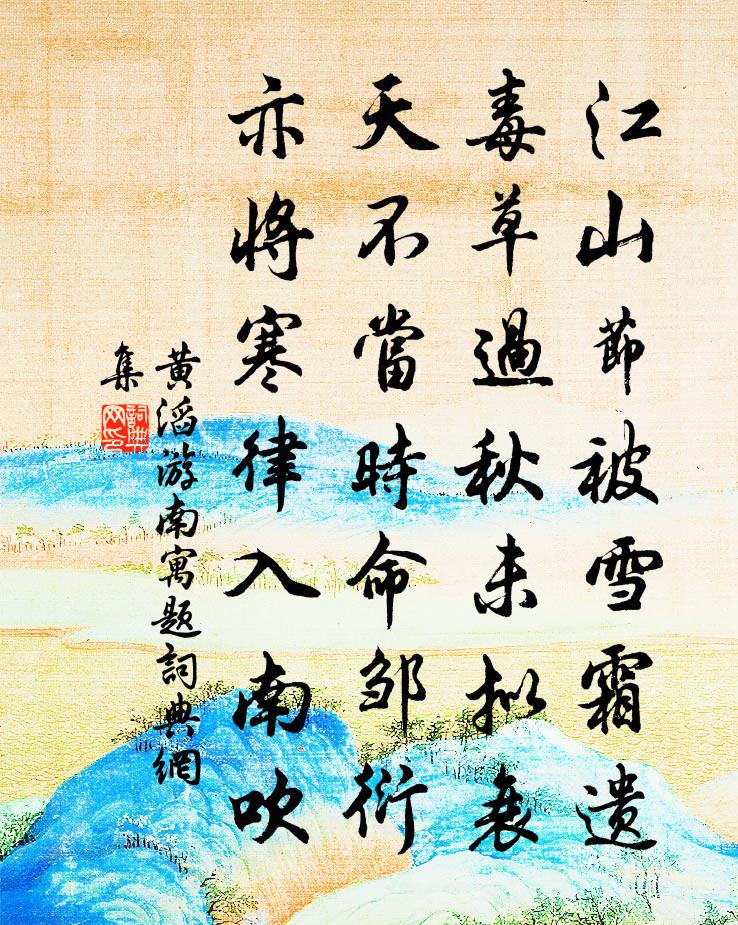 詩詞名句歷史字典書法欣賞書法字典國語詞典說文解字康熙字典古漢語字典標 題 作 者 詩 句 游南寓題作者:黃滔 朝代:唐代游南寓題原文江山節被雪霜遺,毒草過秋未擬衰。天不當時命鄒衍,亦將寒律入南吹。詩詞問答問:游南寓題的作者是誰?答:黃滔問:游南寓題寫於哪個朝代?答:唐代問:游南寓題是什麼體裁?答:七絕黃滔游南寓題書法欣賞游南寓題書法作品注釋全唐詩:卷706-32詩詞推薦顏魯公祠胡舜舉〔宋代〕立廟本來皆可紀,凜然英烈殆天啟。年垂八十官太師,平生所欠惟死爾。分甘一死鴻毛輕,舉世俗子何用嗔。誰知松齋秋吟裘萬頃〔宋代〕驕陽赫赫轉秋陰,便覺蕭然鬢影侵。世事炎涼俄忽爾,閒來物理靜推尋。燕歸梁史達祖〔宋代〕獨臥秋窗桂未香。怕雨點飄涼。玉人只在楚雲傍。也著淚、過昏黃。西風今夜梧桐冷,斷無夢、到鴛鴦。秋鉦二十楊梅蘇泂〔宋代〕每勤蕨葉護筠籠,獨自還丹表里戲。留與越人共夏祭,莫教惡雨打成空。對酒陸龜蒙〔唐代〕後代稱歡伯,前賢號聖人。且須謀日富,不要道家貧。上盧使君貫休〔唐代〕夔龍在廟堂,雖然有僉議。蒼生得父母,自是天之意。鄱陽氣候正,文物皆鮮媚。金鏡有餘光,春風少閒地。膺門靈岩寺薛令之〔唐代〕草堂棲在靈山谷,勤苦詩書向燈燭。柴門半掩寂無人,惟有白雲相伴宿。論積貯疏賈誼〔兩漢〕管子曰:“倉廩實而知禮節。”民不足而可治者,自古及今,未之嘗聞。古之人曰:“一夫不耕,或受之飢;一女謝人惠雲巾方舄二首蘇軾〔宋代〕燕尾稱呼理未便,剪裁雲葉卻天然。無心只是青山物,覆頂宜歸紫府仙。轉覺周家新樣俗,未容陶令舊名傳。鹿門答孟郊韓愈〔唐代〕規模背時利,文字覷天巧。人皆余酒肉,子獨不得飽。才春思已亂,始秋悲又攪。朝餐動及午,夜諷恆至卯。名聲燈夕劉克莊〔宋代〕千炬金梔映玉蕖,台城昨夢又年餘。斷無弦索鳴華屋,惟見炊煙起草廬。兒報瓶空因止酒,婢言油盡暫停書。蓬窗雲安玉虛觀南軒感事偶書五首杜柬之〔宋代〕對我脫粟盤,徐餐休祝鯁。嗟余何不辰,備極生人凶。偶全折脅范,屢脫南冠鍾。再醮亦何為,孫枝發枯桐。鬼猶句王晞鴻〔宋代〕峽覆琵琶彎水帶,山歌氈帽送江聲。紅塵紫陌江聲外,綠嶂青嵐書幾間。讀退之人不知古今馬牛而襟裾之句有感陸游〔宋代〕書生獨占世間痴,過計私憂無已時。知盡古今成底事?空將血淚向人垂。代同舍上郎中許應龍〔宋代〕人物依然呂洞賓,冰霜風骨玉精神。退朝花底千官散,標格如公有幾人。芙蓉五絕呈景仁韓維〔宋代〕少年嘗記作西遊,尤蕊奇葩夾道秋。今日家園開爛熳,怳疑身在蜀江頭。和人懷歸袁說友〔宋代〕宦海風波惡,窮途故舊新。匹夫猶按劍,夜璧莫投人。狎水舟沈羽,防城口累身。歸來老丘壑,一笑樂吾真。立之臨別連以佳篇見貺依韻和酬強至〔宋代〕建溪夫子惠新詩,雅道深慚未得知。曲享鶢鶋真過矣,吟成款段復何之。日斜留煮山家茗,煙重愁燃客舍萁。我系太傅相公以梅聖俞寄和建茶詩垂示俾次前韻蘇頌〔宋代〕近來不貴蜀吳茶,為有東溪早露芽。二月製成輸御府,經時猶未到人家。太官供罷頒三吏,東合開時詠九華。從此蘇幕幕(客中獨坐。)柴元彪〔宋代〕晚晴初,斜照里。遠水連天,天外帆千里。百尺高樓誰獨倚。滴落梧桐,一片相思淚。馬又嘶,風又起。斷續寒砧名句推薦崑山玉碎鳳凰叫,芙蓉泣露香蘭笑。李賀《李憑箜篌引》 荊溪白石出,天寒紅葉稀。王維《山中》 回首昭陽辭落日,傷心銅雀迎秋月文天祥《滿江紅·代王夫人作》 朔方正月雪澌澌,單于策馬至京西沈約《昭君辭》 非臣不亂,非臣不平。李大師、李延壽《南史·列傳·卷十八》 才道莫傷神,青衫濕一痕。納蘭性德《菩薩蠻·新寒中酒敲窗雨》 祖宗疆土,當以死守,不可以尺寸與人。脫脫《宋史·列傳·卷一百一十七》 得歡當作樂,斗酒聚比鄰。陶淵明《雜詩·人生無根蒂》 愁因薄暮起,興是清秋發。孟浩然《秋登蘭山寄張五》 邊蛇口中草,蠍子尾後針。馮夢龍《警世通言·卷二十五》