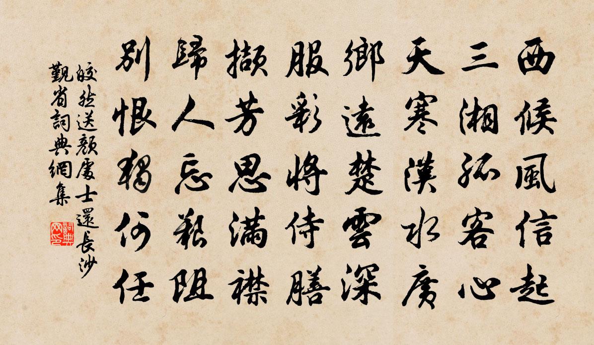 詩詞名句歷史字典書法欣賞書法字典國語詞典說文解字康熙字典古漢語字典標 題 作 者 詩 句 送顏處士還長沙覲省作者:皎然 朝代:唐代送顏處士還長沙覲省原文西候風信起,三湘孤客心。天寒漢水廣,鄉遠楚雲深。服彩將侍膳,擷芳思滿襟。歸人忘艱阻,別恨獨何任。詩詞問答問:送顏處士還長沙覲省的作者是誰?答:皎然問:送顏處士還長沙覲省寫於哪個朝代?答:唐代問:送顏處士還長沙覲省是什麼體裁?答:五律皎然送顏處士還長沙覲省書法欣賞送顏處士還長沙覲省書法作品注釋全唐詩:卷819-43詩詞推薦偈頌一百二十三首釋普度〔宋代〕當初已是錯投胎,鬼面神頭相賺來。裂破虛空無罅縫,龜毛拂子舞三台。又上疏齋慮按察楊公遠〔宋代〕自憐雙鬢已星星,書劍無成老此生。原識荊州輕萬戶,要令和璧重連城。敲推風月詩隨興,模寫江山筆代耕。聞道唐彥猷談奉得達二帖贊岳珂〔宋代〕公於國史,以好硯稱。石焉取斯,蓋協其能。遒媚之觀,在此尺紙。善工利器,予鑒如此。別梅陸游〔宋代〕竹籬數掩傍魚磯,萬點梅花掠地飛。正喜巡檐來索笑,已悲臨水送將歸。影橫月處愁空絕,子滿枝時事更非。自古題西山靈峰感應寺蒲壽宬〔宋代〕路入靈峰西復西,桄榔葉暗古招提。山僧更在雲深處,花落蒼苔幽鳥啼。臨江仙曹雪芹〔清代〕白雲堂前春解舞,東風卷得均勻。蜂圍蝶陣亂紛紛,幾曾隨逝水?豈必委芳塵?萬縷千絲終不改,任他隨聚隨分。鄭甥有大西上劉克莊〔宋代〕歲晚親朋少,何堪遠別離。人誰念原父,甥勿似牢之。宗伯驚文卷,慈親望捷旗。餞行應滿袖,不欠病翁詩。閒中樂事陸游〔宋代〕得喪略相當,幽居氣味長。五窮雖偃蹇,二豎已奔忙。出甑桃花軟,傾瓢竹葉香。語君真富貴,不是傲羲皇。絳都春長筌子〔元代〕天生懶惰。愛靜處坦然,開懷澄坐。面垢頭鬅,養疏慵,消災禍。無縈無系隨緣過。也不會、焚燒香火。囉噔哩噔五日登五華岩陳元通〔宋代〕來此逢端午,山間薇蕨肥。盈虧看井脈,訊息驗玄機。飢辦胡麻飯,寒供薜荔衣。俗緣今覺盡,才到已忘歸。贈柳三解晁說之〔宋代〕桃李那知楊柳恨,故時風雨不依依。自從彭澤無人後,青眼雖開心事非。滿庭芳馬鈺〔元代〕師如子產,我似嘉魚。兒孫有若校人。放者慈悲,烹者何其不仁。恩讎復當別辨,棄怨親、參從師真。修大道,免和題溪莊趙希逢〔宋代〕遙望鞦韆露短牆,垂垂楊柳拂西慶。漲天無處著飛絮,過雨殘紅驚褪妝。禁火寒庖成辟穀,而飢醉腹喜如囊。人生同孟浩然宴賦(一作題壁歌)王迥〔唐代〕屈宋英聲今止已,江山繼嗣多才子。作者於今盡相似,聚宴王家其樂矣。共賦新詩發宮徵,書於屋壁彰厥美。頌古一百二十一首釋宗杲〔宋代〕和尚不赴堂,莊王謝臨屈。一字入公門,九牛撤不出。湖州推官史彥明碎妖石方回〔宋代〕君不見杜子美,搜詩益州城。西門所見石筍高蹲,欲募壯士擲天外,使人不疑見本根。又不見韓退之,□□□□憐即事羅公升〔宋代〕早知色外本無身,不踏閻浮末世塵。說與達多何用許,如來元自等冤親。題齋壁陸游〔宋代〕一棹秋風去已遲,釣竿恐失野人期。朝回補睡尋幽夢,客去偷閒練近詩。浮世本知緣苦薄,頹齡已與志俱衰。平生雞冠花尤山〔宋代〕秋雨初晴後,雞冠早放花。飛鳴欲何向,艷冶自堪夸。僻地裁紅錦,遙天隨彩霞。金門多絳幘,分與野人家。觀十六國吟邵雍〔宋代〕溥天之下號寰區,大禹曾經治水餘。衣到敝時多蟣虱,瓜當爛後足蟲蛆。龍章本不資狂寇,象魏何嘗薦亂胡。尼父名句推薦莫笑賤貧夸富貴,共成枯骨兩何如?白居易《放言五首·其四》 城雪初消薺菜生,角門深巷少人行。楊載《到京師》 草木行列,煙消日出。蘇轍《黃州快哉亭記》 牽牛織女遙相望,爾獨何辜限河梁。曹丕《燕歌行二首·其一》 生死有命,富貴在天。佚名《增廣賢文·上集》 昨夜風兼雨,簾幃颯颯秋聲。李煜《烏夜啼·昨夜風兼雨》 萬國奔騰,兩宮幽陷,此恨何時雪。黃中輔《念奴嬌·炎精中否》 唯君子為能通天下之志。佚名《易傳·彖傳上·同人》 人無禮則不生,事無禮則不成,國家無禮則不寧。荀子《荀子·修身》 樓上黃昏欲望休,玉梯橫絕月中鉤李商隱《代贈二首》