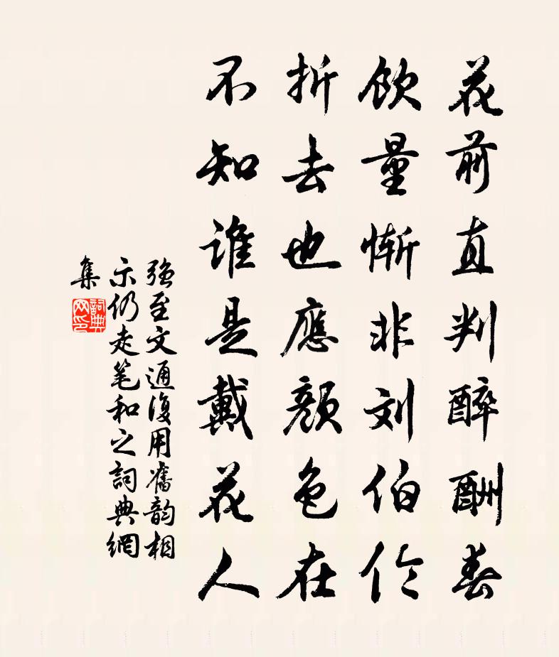 詩詞名句歷史字典書法欣賞書法字典國語詞典說文解字康熙字典古漢語字典標 題 作 者 詩 句 文通復用舊韻相示仍走筆和之作者:強至 朝代:宋代原文花前直判醉酬春,飲量慚非劉伯倫。折去也應顏色在,不知誰是戴花人。詩詞問答問:《文通復用舊韻相示仍走筆和之》的作者是誰?答:強至問:該詩寫於哪個朝代?答:宋代書法欣賞文通復用舊韻相示仍走筆和之書法作品詩詞推薦石橋紋蕈高似孫〔宋代〕絕冥萬丈深,積翠凌空危。清澗月自浴,孤芳人不知。石骨溜香髓,楹苓涌涼脂。忽然青雲陰,見紫白玉姿。冉冉竹馬兒葉夢得〔宋代〕與君記,平山堂前細柳,幾回同挽。又征帆夜落,危檻依舊,遙臨雲巘。自笑來往匆匆,朱顏漸改,故人俱遠。橫桂吳泳〔宋代〕南之山叢叢,桂樹生也直。朱華自成林,不雜眾芳植。上有青鸞棲,因之為羽翼。移根上林苑,零露滋曉色。豈不頌古一百則釋正覺〔宋代〕孤迥迥,圓陀陀,眼力盡處高峩峩。月落潭空夜色重,雲收山瘦秋容多。八封位正,五行氣和,身先在里見來麽。釵頭鳳 春情張可久〔元代〕金釵股。瑤琴譜。洞天相見神仙侶。東風惡。庭花落。舊歡雨散,余情雲薄。莫莫。送耿湋拾遺聯句顏真卿〔唐代〕堯舜逢明主,嚴徐得侍臣。分行接三事,高興柏梁新。 ——顏真卿楚國千山道,秦城萬里人。鏡中看齒髮,河上偈頌一百二十三首釋崇岳〔宋代〕冶父生來百拙,開口都無一說。今圾指空畫空,笑倒清風明月。採桑子謝逸〔宋代〕冰霜林里爭先發,獨壓群花。風送清笳。更引輕煙淡淡遮。抱牆溪水彎環碧,月色清華。疏影橫斜。恰似林逋處士遊春邢巨〔唐代〕海岳三峰古,春皇二月寒。綠潭漁子釣,紅樹美人攀。弱蔓環沙嶼,飛花點石關。溪山游未厭,琴酌弄晴灣。滕王閣春日晚眺潘興嗣〔宋代〕重疊西屏對面開,巍城穹閣信雄哉。眼中孤鶩雲邊沒,望里長江檻外來。蛺蝶圖成春未晚,柘枝筵動客多才。休論清心鏡 寄譚劉丘三師兄鹿衣馬鈺〔元代〕長真兄,劉丘弟。長生長春,法親同輩。顯懶衣、體掛鹿皮,本師教恁地。弟雲包,兄丫髻。早悟三覺,一通明義遠遊篇壽立齋金履祥〔宋代〕我歌遠遊篇,西望心悠然。孰能為此游,渺渺重山川。和鸞車班班,珩佩聲珊珊。塊視幾丘陵,帶視幾流泉。正氣次韻晁元忠西歸十首黃庭堅〔宋代〕聖莫如東家,長年困行路。公養為淹留,豈不以食故。林薄鳥遷巢,水寒魚不聚。孤士似無家,轉蓬何由住。挽蔡祭酒詩二首曹彥約〔宋代〕舊說乘驄老,新來衣繡人。眷方隆嗣聖,世已厭成均。景晚遲鵷序,邊秋憶虎臣。家聲傳慶曆,忠惠豈前身。賀聖朝(送天與)韓元吉〔宋代〕斜陽只向花梢駐。似愁君西去。清歌也便做陽關,更朝來風雨。佳人莫道,一杯須近,總眉峰偷聚。明年歸詔上鸞句蘇易簡〔宋代〕玉堂臣老非仙骨,猶在丹台望泰階。秋次霸亭寄申大儲光羲〔唐代〕橘柚植寒陵,芙蓉蒂修坂。無言不得意,得意何由展。況我行且徒,而君往猶蹇。既傷人事近,復言天道遠。薄暮月蝕梅堯臣〔宋代〕有婢上堂來,白我事可驚。天如青玻璃,月若黑水精。時當十分圓,只見一寸明。主婦煎餅去,小兒敲鏡聲。此雖和田國博喜雪蘇軾〔宋代〕疇昔月如晝,曉來雲暗天。玉花飛半夜,翠浪舞明年。螟螣無遺種,流亡稍占田。歲豐君不樂,鐘磬幾時編。(田沿檄舟行出五雲關喻良能〔宋代〕畫舫朱簾出曉關,便風飛過幾重灣。路經僧舍漁村畔,身在煙霏霧靄間。驚浪沸晴輸遠浦,亂雲拖粉露崇山。偶因名句推薦西風來勸涼雲去,天東放開金鏡。史達祖《齊天樂·中秋宿真定驛》 不為燥濕輕重,不為窮達易節。范曄《後漢書·列傳·周黃徐姜申屠列傳》 習俗移志,安久移質。荀子《荀子·儒效》 我來圯橋上,懷古欽英風。李白《經下邳圯橋懷張子房》 更可惜,雪中高樹,香篝熏素被。周邦彥《花犯·小石梅花》 野田春水碧於鏡,人影渡傍鷗不驚。汪藻《春日·一春略無十日晴》 田家占氣候,共說此年豐。孟浩然《田家元日》 夫孝,百行之冠,眾善之始也。范曄《後漢書·列傳·劉趙淳于江劉周趙列傳》 應酬都不暇,一嶺是梅花。張道洽《嶺梅》 千點寒梅曉角中,一番春信畫樓東。楊慎《鷓鴣天·元宵後獨酌》
