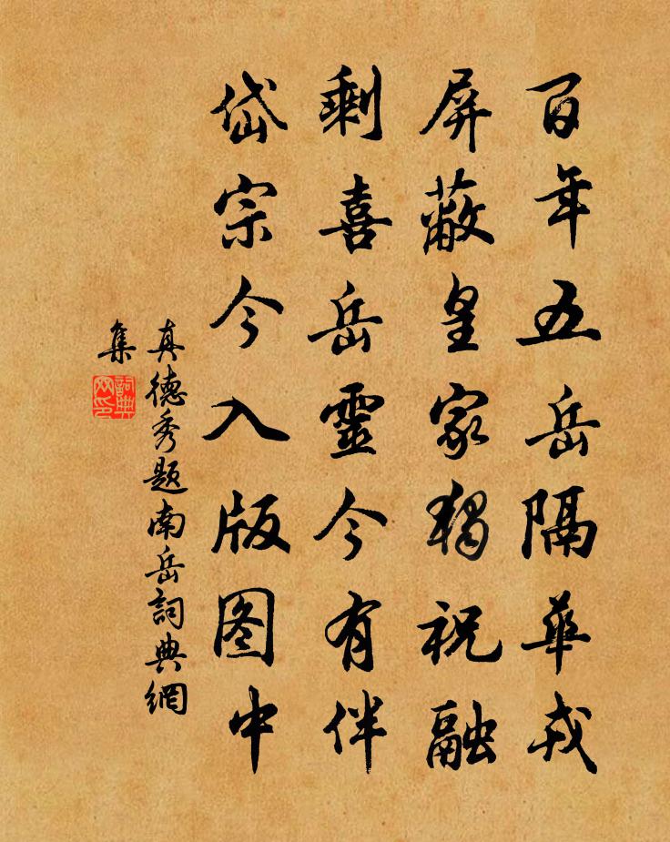 詩詞名句歷史字典書法欣賞書法字典國語詞典說文解字康熙字典古漢語字典標 題 作 者 詩 句 題南嶽作者:真德秀 朝代:宋代題南嶽原文百年五嶽隔華戎,禁止皇家獨祝融。剩喜岳靈今有伴,岱宗今入版圖中。詩詞問答問:題南嶽的作者是誰?答:真德秀問:題南嶽寫於哪個朝代?答:宋代真德秀題南嶽書法欣賞題南嶽書法作品詩詞推薦翠微堂李處權〔宋代〕我讀醉翁文,想當筆如椽。東坡獨知翁,謂今為飛仙。偉明後來秀,文亦星斗懸。一旦辭世紛,歸巢月輪邊。大雅安居瀕江小藍留三小詩李新〔宋代〕江乾平日重回首,樓閣參差自飽秋。世事從來錯經意,一生幾誤轉船頭。已酉年九月自滇歸閩,同人贈言惜別,途中林則徐〔清代〕黃金時節別且蘭,為感與情忍涕難。程緩不勞催馬足,裝輕未肯累豬肝。膏盲或起生猶幸,寵辱皆忘臥亦安。獨有雪中聞牆外鬻魚菜者求售之聲甚苦有感范成大〔宋代〕飯籮驅出敢偷閒,雪脛冰須慣忍寒;豈是不能扃戶坐?忍寒猶可忍飢難!擬古張九成〔宋代〕夜月冷如冰,朝霞燦成綺。借問孰為之,大化自然爾。斲月為酒壺,裁霞為寐被。酣眠九天上,此意誰能解。要與寄翰林陸學士貫休〔唐代〕顏冉商參甲,鸞凰密勿才。簾垂仙鳥下,吟次聖人來。寶輦千官捧,宮花九色開。何時重一見,為我話蓬萊。題鑒止軒陳棣〔宋代〕安身南北皆吾里,勿較使行兼尼止。心猶泥絮吹不起,豈有顏甲生微泚。方塘淨綠含真理,與我娛嬉聊爾爾。佳處武陵春佚名〔宋代〕七返還丹人怎曉,曉後有何難。夜靜存神向內觀。神水滿泥丸。搬運金精無夜晝,呼吸不會閒。功行成時出世寰。過勤政樓杜牧〔唐代〕千秋令節名空在,承露絲囊世已無。唯有紫苔偏得意,年年因雨上金鋪。惜別詩宋白〔宋代〕年來又惜別清塵,故國榮過喜風新。竹葉莫辭千日酒,梅花惟寄一枝春。苦心曾未拋黃卷,得路終期近紫宸。不待孫武汪韶〔宋代〕為憂玩色墮軍實,故假陳兵去二姬。卻恨此機深莫悟,後人不諫受西施。侍始安王石頭城詩江淹〔南北朝〕緒官承盛世。逢恩侍英王。結劍從深景。撫袖逐曾光。暮情郁無已。流望在川陽。平原忽超遠。參差見南湘。何如題慈谿張氏坐化頌樓鑰〔宋代〕苦是自苦,有誰縛汝。礙是自礙,非身為害。既知一物本來無,何待行時方自在。妾薄命呈文山道人汪元量〔宋代〕妾初未嫁時,晨夕深閨中。年當十五餘,顏色如花紅。千里遠結婚,出門山重重。與君盛容飾,一笑開芙蓉。君不偈頌七十八首釋正覺〔宋代〕借婆裙子拜婆年,買盡風光不著錢。劈面來時莫迴避,個人里許有生緣。臨江仙 壽張都運父王旭〔元代〕瑞氣充閭朝不散,歡聲浮動庭槐。九天邀下壽星來。歌翻白雲調,酒泛紫霞杯。八十康韁誰得似,仙風擺落塵埃。答趙景猷曹攄〔魏晉〕守真良難。知德者鮮。歸不悶時。樂在為善。陟彼彌高。流川日遠。無憂不至。敦爾攸踐。和何元清韻九絕王炎〔宋代〕覓官安用羨登仙,求富何須願執鞭。洙泗從游多達者,簞瓢顏子獨稱賢。跋衡山曾尉持示秀溪翰墨李曾伯〔宋代〕故人木已拱,妙墨尚春溫。三復家庭語,一如樽酒論。竹林毋負籍,蘭砌要追元。寶此猶圭璧,流芳在後昆。滿庭芳王以寧〔宋代〕山聳方壺,潮通碧海,江東自昔名家。玉真仙子,璫佩粲朝霞。一種天香勝味,笑楊梅、不數枇杷。難模寫,牟尼名句推薦林外鳴鳩春雨歇,屋頭初日杏花繁。歐陽修《田家》 人棄我取,人取我與。司馬遷《史記·貨殖列傳》 大道如青天,我獨不得出。李白《行路難三首》 焦首朝朝還暮暮,煎心日日復年年。曹雪芹《紅樓夢·第二十二回》 莎衫筠笠。正是村村農務急。盧炳《減字木蘭花·莎衫筠笠》 佳人獨立相思苦。薄袖欺寒脩竹暮。劉鎮《玉樓春·東山探梅》 臨水整烏紗。兩鬢蒼華。故鄉心事在天涯。吳琚《浪淘沙·岸柳可藏鴉》 喜遇重陽,更佳釀今朝新熟。宋江《滿江紅·喜遇重陽》 白雲回望合,青靄入看無。王維《終南山》 田田初出水,菡萏念嬌蕊。龔翔麟《菩薩蠻·題畫》