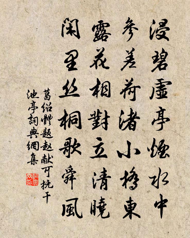 詩詞名句歷史字典書法欣賞書法字典國語詞典說文解字康熙字典古漢語字典標 題 作 者 詩 句 題趙獻可撫乾池亭作者:葛紹體 朝代:宋代題趙獻可撫乾池亭原文浸碧虛亭煙水中,參差荷渚小橋東。露花相對立清曉,閒里絲桐歌舜風。詩詞問答問:題趙獻可撫乾池亭的作者是誰?答:葛紹體問:題趙獻可撫乾池亭寫於哪個朝代?答:宋代葛紹體題趙獻可撫乾池亭書法欣賞題趙獻可撫乾池亭書法作品詩詞推薦水龍吟吳琚〔宋代〕紫皇高宴蕭台,雙成戲擊瓊包碎。何人為把,銀河水翦,甲兵都洗。玉樣乾坤,八荒同色,了無塵翳。喜冰銷太液題墨梅王柏〔宋代〕筆頭開造化,花外越精神。偃蹇蟉龍表,新梢最可人。史雲麓先生席上贈顧梅山顧逢友〔宋代〕五字詩名著少年,端嘉諸老喜相傳。幾回春雨堂中醉,笑拍闌乾月正圓。精衛行黎廷瑞〔宋代〕微禽負大恥,勁氣橫紫冥。口銜海山石,意欲無滄溟。滄溟茫茫雲正黑,濤山峨峨護龍國。假令借爾秦皇鞭,驅令句葉祖洽〔宋代〕已分桂葉爭雲路,不負榴花結露枝。青玉案向滈〔宋代〕多情賦得相思分。便攬斷、愁和悶。萬種千般說不盡。吃他圈櫃,被他拖逗,便佛也、須教恨。傳消寄息無憑信。水仙蘭洪咨夔〔宋代〕水仙瀟灑伴梅寒,鴻雁行中合數蘭。七里香花陪隸耳,涪翁醉眼被粗瞞。哭喻鳧先輩方乾〔唐代〕日夜役神多損壽,先生下世未中年。撰碑縱托登龍伴,營奠應支賣鶴錢。孤壟陰風吹細草,空窗濕氣漬殘篇。人間紹興淳熙分命館職定撰十七首佚名〔宋代〕[黃鐘為角]合宮盛禮,金商令時。務成熙事,蒐揚上余。駿奔在庭,精意肅祗。來享嘉成,神靈燕娭。西山三首(即岷山,捍阻羌夷,全蜀巨障)杜甫〔唐代〕彝界荒山頂,蕃州積雪邊。築城依白帝,轉粟上青天。蜀將分旗鼓,羌兵助井泉。西戎背和好,殺氣日相纏。辛苦清心鏡 因何先生往寧海,作詞以寄鄉人馬鈺〔元代〕勸鄉人,當省悟。浮利浮名,不堅不固。妻男是、走骨行屍,自身是臭腐。早因頭,投真趣。學取馬風,樂然歸去陵寢第二十二文天祥〔宋代〕五陵花滿眼,霜露在草根。冥冥子規叫,重是古帝魂。觀泉送演禪者釋重顯〔宋代〕雲根漱野泉,照空復照月。冷聲曾未消,飛瀾似相別。岩近生風雷,天遙新冰雪。演禪乘與知不知,源流依依共澄清心鏡馬鈺〔元代〕頭如蓬,面如垢。萬事俱忘,心無塵垢。恣情慵、放肆婪耽,乞殘餘展手。幸知無,寧著有。無無亦無,神丹無漏喬山人善琴徐珂〔清代〕國初,有喬山人者善彈琴。精於指法,嘗得異人傳授。每於斷林荒荊間,一再鼓之,淒禽寒鶻,相和悲鳴。後游郢挽沈虞卿侍郎陳傅良〔宋代〕嗜古真成癖,摩挲笑眼開。斷編遺汲冢,名篆出秦台。□□緣應盡,雲山喚不回。淒涼子云宅,問字有誰來。余方悼亡適山圃牡丹芍藥盛開賦長句姜特立〔宋代〕白巾對紅艷,哀樂自不同。緬彼古之人,拔去體法中,親喪至嘔血,悲涕固無從。不哭即飲酒,陶然醉為鄉。吾愛龍塘久別乘月再到奉呈同社一首王阮〔宋代〕龍塘疇昔擅雲煙,破月重來倍爽然。浮玉北堂三萬頃,扁舟西子二千年。青山識面爭迎櫂,白鷺知心不避船。華發送李用之察院赴潮州二首劉克莊〔宋代〕昔在番禺鬻筴時,瞽言不敢計從違。固知國有三空患,又欲民無再榷譏。篛裹為生尤瘠薄,牙籌所積恐纖微。公卿題閻求仁虛樂亭秦觀〔宋代〕長官平昔嗜林丘,僧與開亭待勝游。修竹迴環扶碧瓦,小池方折轉清流。春深鶗鴃催詩句,夜靜蟾蜍入酒舟。只恐名句推薦平生端有活國計,百不一試薶九京。黃庭堅《送范德孺知慶州》 劍河風急雪片闊,沙口石凍馬蹄脫。岑參《輪台歌奉送封大夫出師西征》 用仁義以治天下,行禮樂以變海內,公賞罰以定干戈。施耐庵《水滸傳·第八十二回》 一看腸一斷,好去莫回頭。白居易《南浦別》 酒盈杯,書滿架,名利不將心掛。李珣《漁歌子·荻花秋》 河水洋洋,北流活活詩經《碩人》 丈夫志四海,萬里猶比鄰。曹植《贈白馬王彪·並序》 小舟從此逝,江海寄餘生。蘇軾《臨江仙·夜飲東坡醒復醉》 日暮蒼山遠,天寒白屋貧。劉長卿《逢雪宿芙蓉山主人》 去年今日此門中,人面桃花相映紅。崔護《題都城南莊》