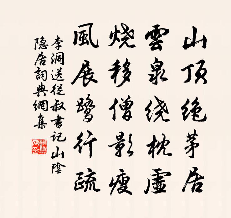 詩詞名句歷史字典書法欣賞書法字典國語詞典說文解字康熙字典古漢語字典標 題 作 者 詩 句 送從叔書記山陰隱居作者:李洞 朝代:唐代送從叔書記山陰隱居原文山頂絕茅居,雲泉繞枕虛。燒移僧影瘦,風展鷺行疏。詩詞問答問:送從叔書記山陰隱居的作者是誰?答:李洞問:送從叔書記山陰隱居寫於哪個朝代?答:唐代問:送從叔書記山陰隱居是什麼體裁?答:五律李洞送從叔書記山陰隱居書法欣賞送從叔書記山陰隱居書法作品注釋全唐詩:卷722-30詩詞推薦四時詞蘇軾〔宋代〕春雲陰陰雪欲落,東風和冷驚羅幕。漸看遠水綠生漪,未放小桃紅入萼。佳人瘦盡雪膚肌,眉斂春愁知為誰。深院乞鍾乳於曾公袞黃庭堅〔宋代〕寄語曾公子,金丹幾時熟。願持鍾乳粉,實此罄懸腹。遙憐蟹眼湯,已化鵝管玉。刀圭勿妄傳,此物非碌碌。醉中寄魯望一壺並一絕皮日休〔唐代〕門巷寥寥空紫苔,先生應渴解酲杯。醉中不得親相倚,故遣青州從事來。鷲峰丁東洞錢時〔宋代〕一滴寒泉萬古心,幽幽岩下弄清音。何如喚起蛟龍蟄,散作蒼生萬國霖。早梅羅鄴〔唐代〕綴雪枝條似有情,凌寒澹注笑妝成。凍香飄處宜春早,素艷開時混月明。遷客嶺頭悲裊裊,美人簾下妒盈盈。滿園寄題太和陳誠之秀才遠明樓陸游〔宋代〕宦遊再有江西役,南望廬陵每慨然。未見高樓出雲雨,但驚妙語雜風煙。諸公何止元和盛,獨我初非正始賢。筆力有所見史衛卿〔宋代〕不著畫羅金縷衣,尋常打扮最相宜。春風燕子樓前過,飄落梨花雪一枝。題天開圖畫白玉蟾〔宋代〕四時風物現安排,醉上高樓肯豁開。雲散遠山元不斷,池成明月自然來。夕陽妝點丹青樹,煙雨和勻水墨梅。此是樂語王義山〔宋代〕西山元是神仙境,瑞氣鬱森森。彩鸞飛下五雲深。急管遞繁音。碧鬢□斜花欲顫,輕盈蓮步移金。紫檀催拍莫沈吟晚泊河曲駱賓王〔唐代〕三秋倦行役,千里泛歸潮。通波竹箭水,輕舸木蘭橈。金堤連曲岸,貝闕影浮橋。水淨千年近,星飛五老遙。疊花釣台林景熙〔宋代〕曾來天上宿,夢不離寒磯。宇宙雙台迥,煙波一客歸。姓增江郡重,墓隔越山微。千古登臨意,淒涼帶夕暉。挽顧君任粹二首劉克莊〔宋代〕有酒常相覓,無金尚欲揮。竟騎黃鶴去,誰見素騾飛。華屋俄零露,蓉城果是非。自嫌聞道淺,懷舊忽沾衣。建炎丞相成國呂忠穆公退老堂徐公裕〔宋代〕注意惟聞簡帝心,聊成退老寓登監。放懷綠野岩瞻重,寄傲平泉國念深。海闊水雲和島嶼,時清鐘鼓樂園林。謝公勸農六首張嵲〔宋代〕出郭循溪路向東,隼旟悠颺滿春風。峰巒沐霧尚陰澹,桃李出牆能白紅。題驛舍二首陳造〔宋代〕客到淮鄉話楚鄉,長將天末指襄陽。如今漂泊君休問,又過襄陽十舍韁。新陽前口占衛宗武〔宋代〕初見草生池,俄驚草又衰。秋山縮鱗甲,寒渚燭鬚眉。花露先春信,林存傲歲枝。新陽已潛動,為報眾芳知。髮長安堰葉紹翁〔宋代〕夏老蟲聲切,晨興草氣香。買瓜依綠樹,出水{左氵右旱}青身。船聚知村近,牛閒覺晝長,雙鳧蓮葉盪,無雨故信州道士蕭了空坐逝或見其在湘潭總府貳蕭公方回〔宋代〕可能吸露更餐風,一悟懸知了萬空。何似老夫酒肉漢,死時合眼閉棺中。八聲甘州(送吳峽州)李曾伯〔宋代〕問西陵、治比漢河南,若為遽東歸。正峽江袞袞,中流我共,一楫杭之。倏聽攀轅告語,公去褲襦誰。賴有甘棠在贈陸伯微三首袁燮〔宋代〕自古真才多命薄,欣聞同志不長貧,堪嗟世道今如許,願為吾君致此身。名句推薦江南春盡離腸斷,苹滿汀洲人未歸。寇準《江南春·波渺渺》 精衛銜微木,將以填滄海。陶淵明《讀山海經·其十》 四十年來家國,三千里地山河李煜《破陣子·四十年來家國》 送子軍中飲,家書醉里題。岑參《磧西頭送李判官入京》 又似賈客蜀道間,千鐸萬磬鳴空山牛殳《琵琶行》 虛靜無事,以暗見疵。韓非及後人《韓非子·主道》 承恩不在貌,教妾若為容。杜荀鶴《 * 怨》 明日隔山嶽,世事兩茫茫。杜甫《贈衛八處士》 不將辛苦意,難近世間財。馮夢龍《醒世恆言·卷十四》 雪中何以贈君別,惟有青青松樹枝。岑參《天山雪歌送蕭治歸京》