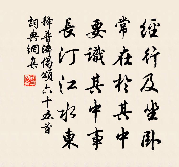 詩詞名句歷史字典書法欣賞書法字典國語詞典說文解字康熙字典古漢語字典標 題 作 者 詩 句 偈頌六十五首作者:釋普濟 朝代:宋代偈頌六十五首原文經行及坐臥,常在於其中。要識其中事,長汀江水東。詩詞問答問:偈頌六十五首的作者是誰?答:釋普濟問:偈頌六十五首寫於哪個朝代?答:宋代釋普濟偈頌六十五首書法欣賞偈頌六十五首書法作品詩詞推薦偈頌一百二十三首釋祖欽〔宋代〕插一莖草建梵剎,捏雙空手豎僧堂。古今相去知多少,七尺單前自較量。又詠張立〔唐代〕去年今日到城都,城上芙蓉錦繡舒。今日重來舊遊處,此花憔悴不如初。偈頌一百零一首釋慧性〔宋代〕聲前一句,十方顯露。佛祖不知,衲僧罔措。送玄岩上人歸西蜀賈島〔唐代〕玉壘山中寺,幽深勝概多。藥成彭祖搗,頂受七輪摩。去臘催今夏,流光等逝波。會當依糞掃,五嶽遍頭陀。句程師孟〔宋代〕亭為新成號獅子,人曾舊隱作龍頭。謝人見和前篇二首蘇軾〔宋代〕九陌淒風戰齒牙,銀杯逐馬帶隨車。也知不作堅牢玉,無奈能開頃刻花。得酒強歡愁底事,閉門高臥定誰家。台前山中方岳〔宋代〕茅茸山堂竹打籬,尚余老鶴共襟期。一生朝市幾何日,五畝園林都是詩。身後誰澆胸磊磊,命中不帶印累累。薄田聞雷陳藻〔宋代〕先春三日已聞雷,驅得長空一雨來。莫問陰陽今失序,磽園且喜趁犁開。山棲釋文珦〔宋代〕十載棲山楹,影不入州縣。地偏交易絕,心閒體逾健。脫粟無宿儲,壞衣多斷線。人皆為吾憂,吾樂未嘗變。上下雜興三首白居易〔唐代〕楚王多內寵,傾國選嬪妃。又愛從禽樂,馳騁每相隨。錦鞲臂花隼,羅袂控金羈。遂習宮中女,皆如馬上兒。色禽賀新郎(清浪軒送春)嚴仁〔宋代〕碧浪搖春渚。浸虛檐、蒲萄滉漾,翠綃掀舞。委曲經過台下路,載取落花東去。問花亦、漂流良苦。花不能言應有柳梢青楊無咎〔宋代〕天付風流。相時宜稱,著處清幽。雪月光中,煙溪影里,松竹梢頭。卻憎吹笛高樓。一夜裡、教人鬢秋。不道明朝次韻錢粹諸公睡香花四首陳造〔宋代〕鉤窗玩孤芳,殘月衣上明。紫囊拆蘭麝,小風弄初晴。寒山寺壞莊產盡為勢家所奪余游天台甚為賢惜薛師石〔宋代〕寒山寺廢佛燈寒,有客來游欲住難。夙世閭丘今攝郡,不妨饒舌似豐乾。延壽寺陳天麟〔宋代〕一溪寒玉佩環聲,兩徑徘徊管送迎。寺學鷲峰侵漢起,山如龍尾撇波行。執競佚名〔先秦〕執競武王,無競維烈。不顯成康,上帝是皇。自彼成康,奄有四方,斤斤其明。鐘鼓喤喤,磬莞將將,降福穰穰。江上晚眺董嗣杲〔宋代〕得酒終日醉,都忘醒後愁。往來狂走馬,直過皖山頭。望謝家青山太白墓二首楊萬里〔宋代〕阿眺青山自一村,州民歲歲與招魂。六朝陵墓今安在,只有詩仙月下墳。次韻景文山堂聽箏三首蘇軾〔宋代〕荻花楓葉憶秦姝,切切么弦細欲無。莫把胡琴挑醉客,回看霜戟褚公須。東林一枝庵鄧肅〔宋代〕世間傑棟俯飛翰,簾旌不動天風寒。但得一身自安逸,誰思寒士三萬間。東林天下推第一,淨幾明窗萬禪客。主人名句推薦如今但暮雨,蜂愁蝶恨,小窗閒對芭蕉展。呂渭老《薄倖·青樓春晚》 相思記取,愁絕西窗夜雨。韓元吉《薄倖·送安伯弟》 團扇,團扇,美人病來遮面。王建《宮中調笑·團扇》 雲白山青萬餘里,愁看直北是長安杜甫《小寒食舟中作》 白頭宮女在,閒坐說玄宗。元稹《行宮》 西風酒旗市,細雨菊花天。歐陽修《秋懷》 綠竹含新粉,紅蓮落故衣。王維《山居即事》 老吾老,以及人之老;幼吾幼,以及人之幼司馬光《資治通鑑·漢紀·漢紀四十二》 莫辭秉燭通霄坐,明日相思隔隴煙。王守仁《諸門人送至龍里道中二首》 雨色秋來寒,風嚴清江爽。李白《酬裴侍御對雨感時見贈》