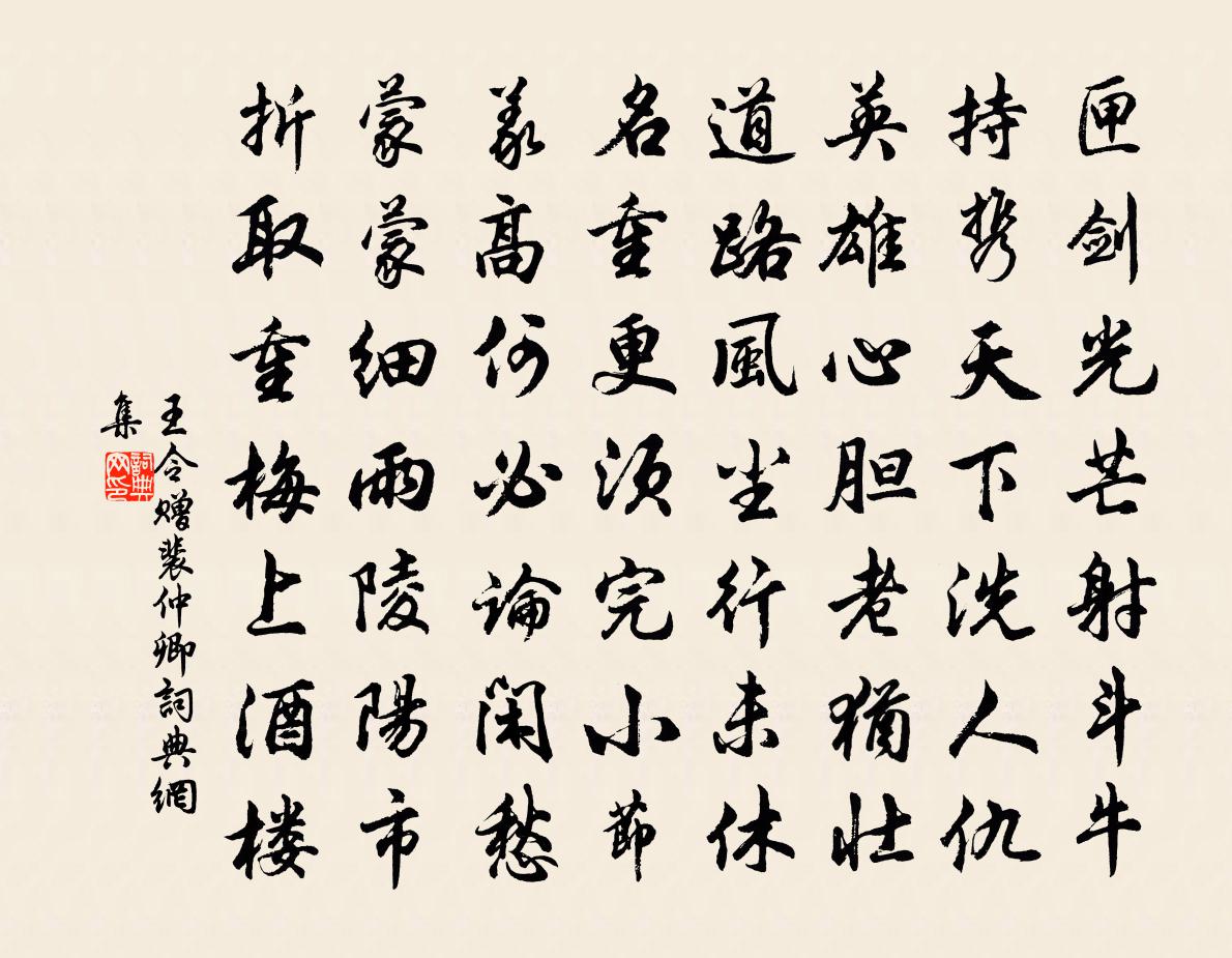 詩詞名句歷史字典書法欣賞書法字典國語詞典說文解字康熙字典古漢語字典標 題 作 者 詩 句 贈裴仲卿作者:王令 朝代:宋代贈裴仲卿原文匣劍光芒射鬥牛,持攜天下洗人仇。英雄心膽老猶壯,道路風塵行未休。名重更須完小節,義高何必論閒愁。濛濛細雨陵陽市,折取重梅上酒樓。詩詞問答問:贈裴仲卿的作者是誰?答:王令問:贈裴仲卿寫於哪個朝代?答:宋代王令贈裴仲卿書法欣賞贈裴仲卿書法作品詩詞推薦上元二首王洋〔宋代〕誰將膏粥飯蠶師,輕薄兒童覓彩衣。游騎但知夸艷麗,祠門直莫歡寒微。東城南陌春迷眼,逐馬隨車醉未歸。莫怪擬詠懷詩 十九庾信〔南北朝〕憒憒天公曉。精神殊乏少。一郡催曙雞。數處驚眠鳥。其覺乃于于。其憂惟悄悄。張儀稱行薄。管仲稱器小。天下七夕賦詠成篇沈叔安〔唐代〕皎皎宵月麗秋光,耿耿天津橫復長。停梭且復留殘緯,拂鏡及早更新妝。彩鳳齊駕初成輦,雕鵲填河已作梁。雖喜西靈鷲王之道〔宋代〕我聞西靈鷲,幽奇冠龍舒。山神知我來,夜雨自滌除。籃舁犯霏微,敢憚石徑紆。清風偃林柯,征衣盡沾濡。樵人紹興淳熙分命館職定撰十七首佚名〔宋代〕穆穆皇祖,丕昭聖功。聲律身度,樂備禮隆。祗芳旺幣,祀於合宮。玉帛萬國,驩心載同。小飲俯江樓分韻得俯字陳造〔宋代〕流光成人肯貸人,成人春事遽如許。眼不到蜚鴻,身每念縛虎。他日載成人約,坐受陰寒阻。非君韻超俗,疇肯顧次韻公辟州宅月夜偶成秦觀〔宋代〕繚繞千重雨後涼,月含秋色上東方。風催絡紓歸金井,月轉檀欒蔭畫堂。遊目騁懷佳興發,感時撫事壯心傷。歸來烏夜啼(題月海星天觀,即宋武所居故地)鄭熏初〔宋代〕春江一望微茫。辨桅檣。無限青青麥里、菜花黃。今古恨,登臨淚,幾斜陽。不是寄奴住處、也淒涼。宿石壁山館郭忠謨〔宋代〕斜陽在山客在船,片帆點破澄江天。攜筇上踏籠頭月,釣篷穩擊蘆花雪。夜深野鶴穿雲歸,正是山房酒醒時。羽衣旅懷林尚仁〔宋代〕欲暮四風引客愁,十年如夢住他州。故交零落誰知己,往事淒涼嘆白頭。一紙音書燈下淚,滿城砧杵月明秋。早知贈張亦趙師秀〔宋代〕一別無書信,相逢各老蒼。山川烽外遠,歲月夢中長。空橐盛詩草,單衣碗酒香。因言瀼溪宴,同憶舊時狂。偈頌一百四十一首釋師範〔宋代〕今朝八月二十五,記得洞山離杳渡。韶石山頭打不回,追至如今無相據。問佛便答麻三斤,何似庭前柏樹子。蒼鷹桂林吟梅方蒙仲〔宋代〕幾回桂州夢,欠一桂州詩。何日萬里外,吟梅真大奇。香閨十詠紫香囊張玉孃〔宋代〕珍重天孫剪紫霞,沉香羞認舊敏華。紉蘭獨抱靈均操,不帶春風兒女花。贈鳳林院海月師汪炎昶〔宋代〕早已逃俗類,從今朝始清絕。皎皎不可侵,如看海□月。沖谷過予晏齋趙蕃〔宋代〕夢裡春歸去,榴花晚欲然。窗晴書味熟,竹密鳥聲圓。多病妨搜句,逢人懶問禪。澹然無可語,危坐了爐煙。題劉心月白玉蟾〔宋代〕汨羅江山水嗚唈,魚鱉不知老龍泣。徒棹龍舟何處尋,何不辦取屈原生前一枝楫。大吳江頭伍侯廟,夕陽滿樹聞啼送黃祕丞李覯〔宋代〕天下為人子,何人似慶門。二親皆白首,同日拜皇恩。就養蘭生畹,娛賓酒滿樽。自嗟偏待早,相送只銷魂。雪夜二首劉應時〔宋代〕迎春寒色愈嚴凝,小閣爐殘冷欲冰。寂寞黃昏愁弔影,雪窗怕上短檠燈。周愚卿用荀卿氏之語以遇名齋從余求詩為賦古趙蕃〔宋代〕世俗爭知競冶容,紛紛牆穴交相從。誰知亦有秉正色,奉養辛勤供織舂。過期不嫁心不悔,偃蹇數夫終德配。君不名句推薦慎厥身,修思永。佚名《尚書·虞書·皋陶謨》 海燕歲微渺,乘春亦暫來。張九齡《歸燕詩》 欲多傷神,財多累心!佚名《增廣賢文·下集》 日中則移,月滿則虧。劉向《戰國策·秦三·蔡澤見逐於趙》 君自故鄉來,應知故鄉事。王維《雜詩三首·其二》 紛紛紅紫已成塵,布穀聲中夏令新。陸游《初夏絕句》 日落君山雲氣,春到沅湘草木,遠思渺難收。張孝祥《水調歌頭·過岳陽樓作》 殊方日落玄猿哭,舊國霜前白雁來。杜甫《九日五首·其一》 為之而欲人不知,言之而欲人不聞,此猶捕雀而掩目,盜鐘而掩耳者吳兢《貞觀政要·卷五· * 平》 賢路當廣而不當狹,言路當開而不當塞脫脫《宋史·列傳·卷一百七十六》