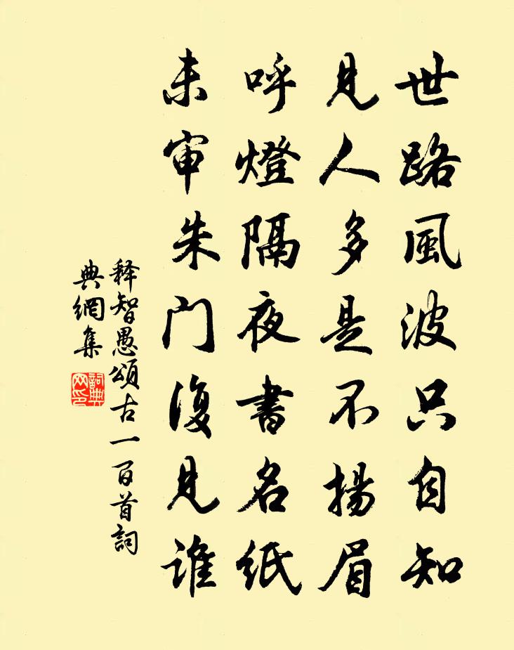 詩詞名句歷史字典書法欣賞書法字典國語詞典說文解字康熙字典古漢語字典標 題 作 者 詩 句 頌古一百首作者:釋智愚 朝代:宋代頌古一百首原文世路風波只自知,見人多是不揚眉。呼燈隔夜書名紙,未審朱門復見誰。詩詞問答問:頌古一百首的作者是誰?答:釋智愚問:頌古一百首寫於哪個朝代?答:宋代釋智愚頌古一百首書法欣賞頌古一百首書法作品詩詞推薦題馮行之雙溪書房曾豐〔宋代〕雁峰之水蒸若湘,虎城之水貢若章。雙水朝宗氣浩浩,諸生讀書聲琅琅。葛溪支派小雙水,馮君領會水之理。東西同從弟銷南齋玩月憶山陰崔少府王昌齡〔唐代〕高臥南齋時,開帷月初吐。清輝澹水木,演漾在窗戶。荏苒幾盈虛,澄澄變今古。美人清江畔,是夜越吟苦。千里缺調名(山居)龔大明〔宋代〕山居好。山居好。鶴唳猿啼餞昏曉。碧窗柏子炷爐香,跌坐 * 誦黃老。姚源憶故人 贈亭川眾道友馬鈺〔元代〕塵中個個貪名利。要賽石崇富貴。爭奈前程不諱。莫也難逃避。悟來詐做**地。便是脫家奇計。鍊氣全神圓備。歸字謠袁去華〔宋代〕歸。目斷吾廬小翠微。斜陽外,白鳥傍山飛。失題李廌〔宋代〕羨君走馬踏千山,卻笑吟詩不肯閒。寫得清風入嘉句,盡攜爽氣出雲間。梅花(二首)錢澄之〔清代〕何處花先放?向南三兩村。未春天似夢,徹夜月無言。且喜昏鴉散,毋嫌翠羽喧。眾芳久寂寞,賴汝照乾坤。離離和子瞻次韻陶淵明勸農詩蘇轍〔宋代〕我行四方,稻麥黍稷。果蔬蒲荷,百種鹹植。糞溉耘籽,乃後有穡。爾獨何為,開口而食。安扶待制侍郎徐公輓詞二首葉適〔宋代〕飲冰那得不醒然,北看成南醜又妍。建策須為萬世慮,孤忠亦有一身全。星文忍向生前墜,夢事方從死日傳。莫指董行成佚名〔宋代〕唐懷州河內縣董行成能策賊。有一人從河陽長店,盜行人驢一頭並皮袋。天欲曉,至懷州。行成至街中,見之,叱句錢某〔宋代〕倏忽經狼尾,迴旋過虎頭。相看逢白狗,猶自見黃牛。鷓鴣天 詠趙真真楊玉娥唱雙漸諸宮調 青樓集楊立齋〔元代〕煙柳風花錦作園。霜芽露葉玉裝船。誰知皓齒纖腰會,只在輕衫短帽邊。啼玉靨,咽冰弦。五牛身去更無傳。詞人送王昭祖國史吏部歸丹陽七絕史堯弼〔宋代〕萬牛回首重丘山,才大誰令挽不前。只好壘胸澆酒遣,未妨洞腹曬書眠。南潭李昌符〔唐代〕匝岸青蕪掩古苔,面山亭樹枕潭開。有時弦管收筵促,無數鳧鷖逆浪來。路入龍祠群木老,風驚漁艇一聲回。人傳長相思歐陽修〔宋代〕深花枝。淺花枝。深淺花枝相併時。花枝難似伊。玉如肌。柳如眉。愛著鵝黃金縷衣。啼妝更為誰。浪淘沙呂渭老〔宋代〕涼露洗秋空。菊徑鳴蛩。水晶簾外月玲瓏。燭蕊雙懸人似玉,簌簌啼紅。宋玉在牆東。醉袖搖風。心隨月影入簾櫳湖上吟許志仁〔宋代〕誰家短笛吹楊柳,何處扁舟唱采菱。湖水欲平風作惡,秋雲不薄雨無憑。近人白鷺麾方去,隔岸青山喚不應。好景送衛司法河中覲省(即故王吏部延昌外甥)盧綸〔唐代〕出身因強學,不以外家榮。年少無遺事,官閒有政聲。曉山臨野渡,落日照軍營。共賞高堂下,連行弟與兄。落花趙葵〔宋代〕他鄉桃李為誰栽,逗曉輕紅帶露開。一夜風姨妒顏色,落花無數點蒼苔。偈頌一百零二首釋紹曇〔宋代〕湖山蒼蒼,湖水茫茫。丹楓飄錦,金橘鋪黃。明眼衲僧,隨境轉聖凡,無處覓行藏。名句推薦西湖到日,重見梅鈿皺。吳文英《瑞龍吟·送梅津》 紅樹青山日欲斜,長郊草色綠無涯。歐陽修《豐樂亭遊春·其三》 先到為君,後到為臣。佚名《增廣賢文·上集》 徘徊將何見?憂思獨傷心。阮籍《詠懷八十二首·其一》 誰教歲歲紅蓮夜,兩處沉吟各自知。姜夔《鷓鴣天·元夕有所夢》 子用私道者家必亂,臣用私義者國必危。劉向《戰國策·趙二·趙燕後胡服》 賢達哀樂,不在窮通禍福之間。脫脫《遼史·列傳·卷三十四》 始憐幽竹山窗下,不改清陰待我歸。錢起《晚春歸山居題窗前竹 / 暮春歸故山草堂詩》 懸衡而知平,設規而知圓。韓非及後人《韓非子·飾邪》 將軍金甲夜不脫,半夜軍行戈相撥,風頭如刀面如割。岑參《走馬川行奉送出師西征 / 走馬川行奉送封大夫出師西征》
