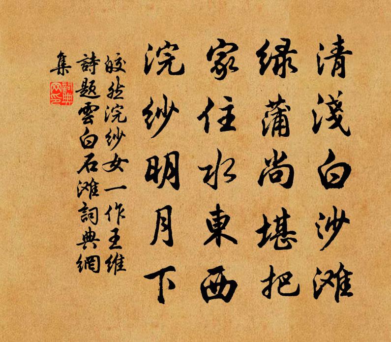 詩詞名句歷史字典書法欣賞書法字典國語詞典說文解字康熙字典古漢語字典標 題 作 者 詩 句 浣紗女(一作王維詩,題雲白石灘)作者:皎然 朝代:唐代原文清淺白沙灘,綠蒲尚堪把。家住水東西,浣紗明月下。詩詞問答問:《浣紗女(一作王維詩,題雲白石灘)》的作者是誰?答:皎然問:該詩寫於哪個朝代?答:唐代書法欣賞浣紗女(一作王維詩,題雲白石灘)書法作品注釋全唐詩:卷818-73詩詞推薦宿禪智寺上方演大師院崔峒〔唐代〕石林高几許,金剎在中峰。白日空山梵,清霜後夜鍾。竹窗回翠壁,苔逕入寒松。幸接無生法,疑心怯所從。菁江林人隱〔宋代〕浮跡東西浙,大江長短亭。潮來遠水白,雨過亂峰青。春夜夢無定,天寒酒易醒。回橈下江渚,杜若滿沙汀。惜花施肩吾〔唐代〕落盡萬株紅,無人解系風。今朝芳徑里,惆悵錦機空。夏日過摩訶池陸游〔宋代〕烏帽翩翩白紵輕,摩訶池上試閒行。淙潺野水鳴空苑,寂歷斜陽下廢城。縱轡迎涼看馬影,袖鞭尋句聽蟬聲。白頭聽歌回馬上贈崔法曹戴叔倫〔唐代〕秋風裡許杏花開,杏樹傍邊醉客來。共待夜深聽一曲,醒人騎馬斷腸回。嘲趙謙光賀遂涉〔唐代〕員外由來美,郎中望亦優。寧知粉署里,翻作土山頭。紫岩九章章八句上壽張丞相張元乾〔宋代〕土宇未復,繄公闢之。士風未變,繄公革之。軍律未振,繄公鼓之。國論未定,繄公斷之。奇見華岳〔宋代〕紅牙催拍燕飛忙,一片行雲繞畫堂。眉黛蹙成遊子恨,臉紅燒故人腸。榆錢不買千金笑,柳帶何須百寶妝。舞罷隔與可墨竹二十韻蘇籀〔宋代〕天工奇水墨,晴景照檀欒。影動嵇阮愛,筍穿淇渭乾。禪翁三昧力,老手一揮間。意匠先鶻落,心造忘筆端。芥胸王梅泉生日惠詩次韻答之牟巘五〔宋代〕堪笑衰翁作計狂,又隨笭箵到魚梁。未秋早覺凋蒲柳,已老安能種豫章。誰似讀騷仍飲酒,有時贊易 * 香。梅邊仇山圖戴表元〔宋代〕仇山山下仇人,白頭宦學走風塵。問渠家住山何處,雲氣漫漫不知路。詩人作事例多痴,逢山且畫且題詩。不如鄰又吟富春沙際〔唐代〕莫問我姓名,向君言亦空。潮生沙骨冷,魂魄悲秋風。頌證道歌證道歌釋印肅〔宋代〕是以禪門了知心,心心心外別無心。如今只是舊時底,不換源機放曠吟。挽衛山齋黃庚〔宋代〕武公後裔有仍孫,德望才名世所尊。擬向山中專注易,忽傳地下趣修文。月樓不復賡詩句,春閣猶思共酒樽。痛恨臨江仙牧常晁〔元代〕午夜金烏從海底,醜初漸出扶桑。大明東向屬三陽。韶華春滿院,無地不生光。直駕河車朝帝闕,泥丸宮飲瓊漿。喜雨李至〔宋代〕沈煙漠漠晦平臯,盡日空濛阻出遨。窗打紙聲聞細點,檻飄花影見凝膏。依稀恨曲添鳴溜,悵望啼妝在小桃。何假過石門方回〔宋代〕麥田下種稻田乾,秋盡江南亦未寒。水淨風微船牽慢,蓴花薀草盡堪看。依韻和吳正仲冬至梅堯臣〔宋代〕流光冉冉即衰遲,物趣迴環似轉規。長景已知今日至,孤懷不比少年時。阻陪上合鴛鸞後,且與南州父老期。況有飛螢鄧肅〔宋代〕穀雨已十日,不散陰雲頑。夜風翼腐草,借光蒲葦間。往來自相照,似欣天地寬。何時東方白,紅日開雲端。花發沁園春黃升〔宋代〕曉燕傳情,午鶯喧夢,起來檢校芳事。荼褪雪,楊柳吹綿,迤邐麥秋天氣。翻階傍砌。看芍藥、新妝嬌媚。正鳳紫名句推薦秦時明月漢時關,萬里長征人未還。王昌齡《出塞二首·其一》 裊裊兮秋風,洞庭波兮木葉下。屈原《九歌·湘夫人》 秋草六朝寒,花雨空壇。朱彝尊《賣花聲·雨花台》 柔條紛冉冉,葉落何翩翩。曹植《美女篇》 世事悠悠渾未了,年光冉冉今如許。吳潛《滿江紅·送李御帶珙》 水上遊人沙上女,回顧,笑指芭蕉林里住。歐陽炯《南鄉子·畫舸停橈》 綠淨春深好染衣。際柴扉。賀鑄《釣船歸·綠淨春深好染衣》 東風不管琵琶怨。落花吹遍。許棐《後庭花·一春不識西湖面》 望處雨收雲斷,憑闌悄悄,目送秋光。柳永《玉蝴蝶·望處雨收雲斷》 達士者,達乎死生之分,達乎死生之分。則利害存亡弗能惑矣。呂不韋《呂氏春秋·覽·恃君覽》