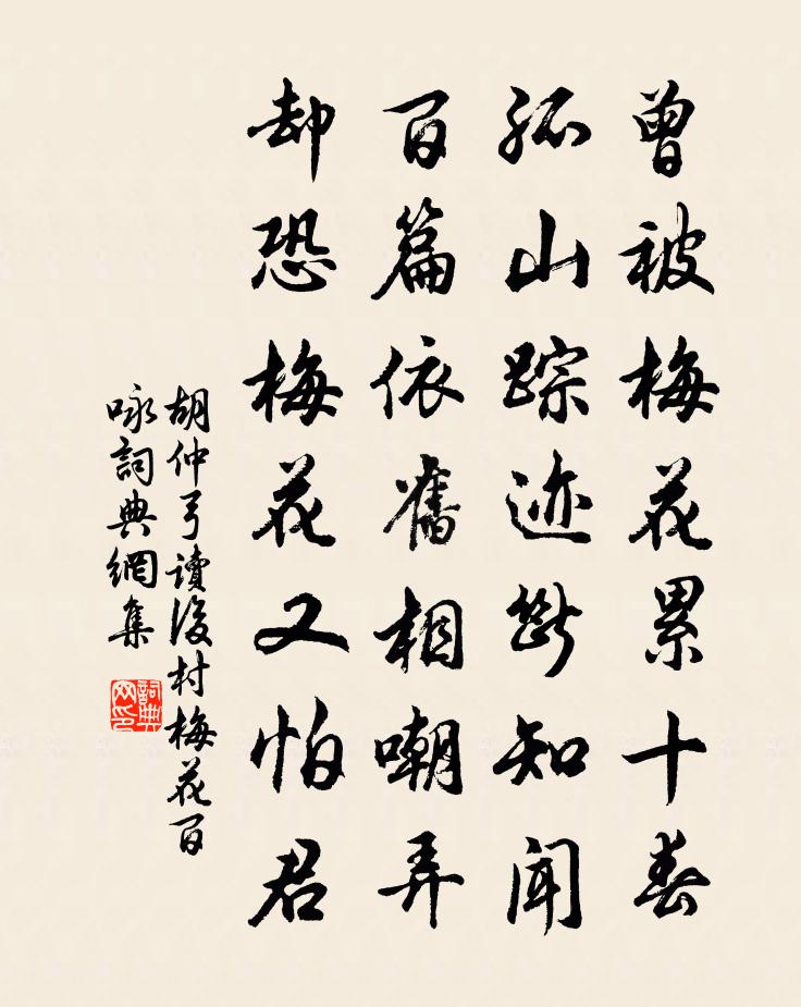 詩詞名句歷史字典書法欣賞書法字典國語詞典說文解字康熙字典古漢語字典標 題 作 者 詩 句 讀後村梅花百詠作者:胡仲弓 朝代:宋代讀後村梅花百詠原文曾被梅花累十春,孤山蹤跡斷知聞。百篇依舊相嘲弄,卻恐梅花又怕君。詩詞問答問:讀後村梅花百詠的作者是誰?答:胡仲弓問:讀後村梅花百詠寫於哪個朝代?答:宋代胡仲弓讀後村梅花百詠書法欣賞讀後村梅花百詠書法作品詩詞推薦蠟梅四首楊萬里〔宋代〕蜜蜂底物是生涯,花作餱糧蠟作家。歲晚略無花可采,卻將香蠟吐成花。辛酉大雪戲成二詩以千山鳥飛絕萬逕人蹤滅為周麟之〔宋代〕林梢宿鴉翻,未覺煙樹暝。瀟瀟打窗聲,慣向雲屋聽。冰結積已深,風收舞初定。凌晨出門喜,折屐印樵逕。送沈秘校李覯〔宋代〕君家龍虎弟兄賢,斗酒相逢楚水邊。雨露自今榮一命,塵埃未免困三年。高談欲出稠人右,敏政當居欲吏前。異日登池州九峰樓寄張祜杜牧〔唐代〕百感中來不自由,角聲孤起夕陽樓。碧山終日思無盡,芳草何年恨即休?睫在眼前長不見,道非身外更何求。誰人送佛印秦觀〔宋代〕抱包初舍蔚頭藍,江月松風處處參。他日惠林為上首,幾年彌勒作同龕。真珠撒帳開新座,飛鳥銜花繞舊庵。雲散瑞安道房觀陳友雲古柏命予作詩徐照〔宋代〕西陵西陵高插天,武侯廟前寒潑煙。誰知陳侯筆有力,遠遠移來向君壁。老翁眼見驚{左目右咢}眙,醉搖屈筆來喜晴曾協〔宋代〕詩翁高興動新晴,未踏湖山句已清。領略風光初入眼,指麾泉石欲旴衡。屢傳黼扆方圖舊,應有鋒車便趣行。莫向句藍奎〔宋代〕懶思身外無窮事,原讀人間未見書。鵲橋仙令(歇指)周邦彥〔宋代〕浮花浪蕊,人間無數,開遍朱朱白白。瑤池一朵玉芙蓉,秋露洗、丹砂真色。晚涼拜月,六銖衣動,應被姮娥認得種菊史鑄〔宋代〕幽懷遠慕陶彭澤,一畝荒園試為鑰。自種黃花添野景,幾多光彩照庭除。將發楚州經寶應縣訪李二忽於州館相遇月夜書事…李寶應韋應物〔唐代〕孤舟欲夜發,只為訪情人。此地忽相遇,留連意更新。停杯嗟別久,對月言家貧。一問臨邛令,如何待上賓。萬壽觀陳大方〔宋代〕玉佩丁東下界聞,天風吹動碧霞裙。劉郎跨鶴游三島,王子吹笙到五雲。洞府夜光傳玉印,石壇月色禮茅君。若逢先天易吟三十首方回〔宋代〕太極元無物,群生性命根。一奇仍一偶,萬象滿乾坤。伯氏到濟南寄詩頗言太守居有湖山之勝同韻和黃庭堅〔宋代〕西來黃犬傳佳句,知是陸機思陸雲。歷下樓台追把酒,舅家賓客厭論文。山椒欲雨好雲氣,湖面逆風生水紋。想得天馬二首·其二劉徹〔兩漢〕天馬徠,從西極,涉流沙,九夷服。天馬徠,出泉水,虎脊兩,化若鬼。天馬徠,歷無草,徑千里,循東道。天馬華亭百詠鬼書許尚〔宋代〕壯士為儒恥,捐軀志所甘。無名豫青史,幽憤亦何堪。夜讀莊子呈高紫微岳珂〔宋代〕蒙園傲吏御風仙,聊以卮言後世傳。小大升潛同此地,智愚工拙豈其天。眾途適正何勞問,一理觀心本自然。從此石瓮寺權德輿〔唐代〕石瓮靈泉勝寶井,汲人回掛青絲綆。廚煙半逐白雲飛,當晝老僧來灌頂。雜興十首劉克莊〔宋代〕不肯彈冠起,俄從折簡招。雖然舐丹藥,未免悔青苗。既作閔雨詩是夕遂澍雨夜中喜不能寐起作喜雨黃庭堅〔宋代〕南風吹雨下田塍,田父伸眉願力耕。麰麥明年應解好,簾櫳今夜不勝清。直須洗盡焦枯意,不厭屢聞飄灑聲。黃卷名句推薦當時明月在,曾照彩雲歸。晏幾道《臨江仙·夢後樓台高鎖》 不知近水花先發,疑是經冬雪未銷。張謂《早梅》 大江東去,浪淘盡,千古風流人物。蘇軾《念奴嬌·赤壁懷古》 捲地風來忽吹散,望湖樓下水如天。蘇軾《六月二十七日望湖樓醉書》 憶年十五心尚孩,健如黃犢走復來。杜甫《百憂集行》 民安土重遷,不可卒變,易以順行,難以逆動陳壽《三國志·魏書·袁張涼國田王邴管傳》 何事吟余忽惆悵,村橋原樹似吾鄉。王禹偁《村行·馬穿山徑菊初黃》 今宵樓上一尊同。雲濕紗窗。辛棄疾《一剪梅·中秋元月》 舊時茅店社林邊,路轉溪橋忽見。辛棄疾《西江月·夜行黃沙道中》 燕燕輕盈,鶯鶯嬌軟,分明又向華胥見。姜夔《踏莎行·自沔東來丁未元日至金陵江上感夢而作》