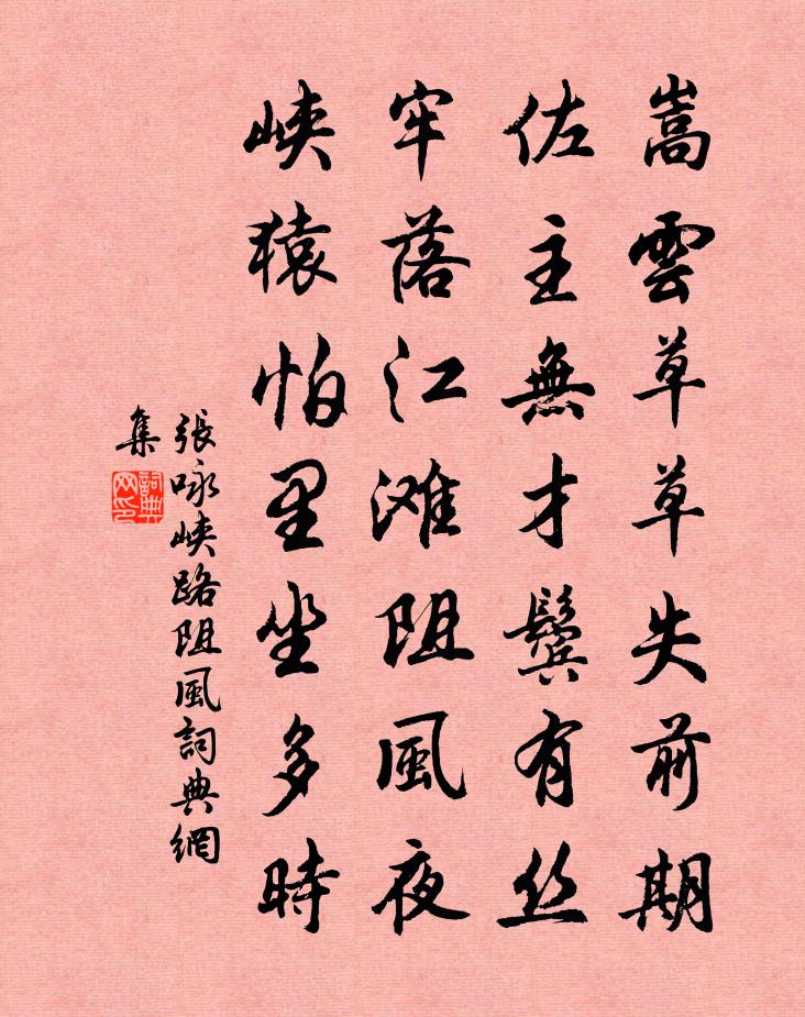詩詞名句歷史字典書法欣賞書法字典國語詞典說文解字康熙字典古漢語字典標 題 作 者 詩 句 峽路阻風作者:張詠 朝代:宋代峽路阻風原文嵩雲草草失前期,佐主無才鬢有絲。牢落江灘阻風夜,峽猿怕里坐多時。詩詞問答問:峽路阻風的作者是誰?答:張詠問:峽路阻風寫於哪個朝代?答:宋代張詠峽路阻風書法欣賞峽路阻風書法作品詩詞推薦梅花喜神譜大開一十四枝宋伯仁〔宋代〕麀鹿同呦呦,山林風雨秋。姑蘇台上月,子胥曾約游。七夕崔顥〔唐代〕長安城中月如練,家家此夜持針線。仙裙玉佩空自知,天上人間不相見。長信深陰夜轉幽,瑤階金閣數螢流。班姬次趙同叔春雨中韻胡仲弓〔宋代〕焚香清坐話襟期,絕勝孤篷共載時。曉雨旋添山蕨菜,春風又上海棠枝。蝶隨痴夢飛丹闕,鶯帶吟聲繞墨池。小待江神子(和陳仁和韻)辛棄疾〔宋代〕寶釵飛鳳鬢鸞。望重歡。水雲寬。腸斷新來,翠被□香殘。待得來時春盡也,梅著子,筍成竿。湘筠簾卷淚痕斑。離泗州有作張耒〔宋代〕舸艤大艑來何州,翩翩五兩在船頭。淮邊落帆汴口宿,橋下連檣南與北。南來北去何時停,春水春風相送迎。沙岸七十翁五言十首方回〔宋代〕愁與憂全異,歡于樂尚遙。百年元易度,一日卻難消。玉叵圭中必,桐猶爨下焦。襟懷殊鬱郁,縱目卻飄飄。績和李參政湖上雜詠魏了翁〔宋代〕嚴君閒有家,富之以其道。幾年困外御,囊空甑復倒。家人良自勉,歲晏原相保。口號贈徵君鴻 此公時被征李白〔唐代〕陶令辭彭澤,梁鴻入會稽。我尋高士傳,君與古人齊。雲臥留丹壑,天書降紫泥。不知楊伯起,早晚向關西。普化贊釋了惠〔宋代〕鐸掩洪鐘,機如掣電。明頭暗頭,四方八面。一著得人憎,走入大悲院。寄題吳伯豐所居二首讀書閣陳文蔚〔宋代〕書閣高几尋,其高不可知。但見讀書人,心與千古期。藉此間曠地,端坐窮軒羲。世塵飛不到,月霽光風吹。況復用韻再作衛宗武〔宋代〕一氣運行於虛空,有形孰不歸陶鎔。燠寒燥濕互為用,功被草木並昆蟲。胡然陽亢乃作沴,豐隆屏翳俱潛蹤。炎炎代郡齋神答樂天元稹〔唐代〕虛白堂神傳好語,二年長伴獨吟時。夜憐星月多離燭,日滉波濤一下帷。為報何人償酒債,引看牆上使君詩。景祐以後樂章六首真宗〔宋代〕翊佐先朝,章明台教。淑順謙勤,徽音在劭。樹風不止,劬勞匪報。黍稷令芳,嘏茲乃告。和樂天燒藥不成命酒獨醉劉禹錫〔唐代〕九轉欲成就,百神應主持。嬰啼鼎上去,老貌鏡前悲。卻顧空丹灶,回心向酒卮。醺然耳熱後,暫似少年時。送陳秀才赴舉皎然〔唐代〕諸侯懼削地,選士皆不羈。休隱脫荷芰,將鳴矜羽儀。甲科爭玉片,詩句擬花枝。君實三楚秀,承家有清規。紫微花岳珂〔宋代〕凡卉同資造化工,紫微元不待東風。明霞絢爛瓊為蕊,曉日離披綺作叢。塵境斷無青瑣隔,仙姿元與亦城通。最憐董叔宏黃伯厚載酒黃塘送別戴復古〔宋代〕愁酌開懷酒,涼生破暑風。論交談灑灑,告別恨匆匆。十里黃塘路,扁舟白髮翁。多情今夜月,為我照吟篷。定業寺胡鑒〔宋代〕拂雲開紫氣,窈窕入幽境。杉森若趨山,竹青無盡境。寒螿互響答,野鳥話深靜。暗水冽池光,疏風碎金影。騁懷贈郭給事王維〔唐代〕洞門高閣靄餘暉,桃李陰陰柳絮飛。禁里疏鍾官舍晚,省中啼鳥吏人稀。晨搖玉佩趨金殿,夕奉天書拜瑣闈。強欲有贈馮班〔清代〕隔岸吹唇日沸天,羽書惟道欲投鞭。八公山色還蒼翠,虛對圍棋憶謝玄。名句推薦登車宿遷北,萬頃鋪瓊田。陸文圭《宿遷道中遇雪》 三思而行,再思可矣。佚名《增廣賢文·上集》 春路雨添花,花動一山春色。秦觀《好事近·夢中作》 蛇無頭而不行,鳥無翅而不飛。施耐庵《水滸傳·第六十回》 芝蘭生於深林,不以無人而不芳,君子修道立德,不謂窮困而改節。佚名《孔子家語·在厄》 白鳥一雙臨水立,見人驚起入蘆花。戴復古《江村晚眺》 莫笑農家臘酒渾,豐年留客足雞豚。陸游《游山西村》 梳洗罷,獨倚望江樓。溫庭筠《望江南·梳洗罷》 醉後不知天在水,滿船清夢壓星河。唐珙《題龍陽縣青草湖》 清秋幕府井梧寒,獨宿江城蠟炬殘。杜甫《宿府》