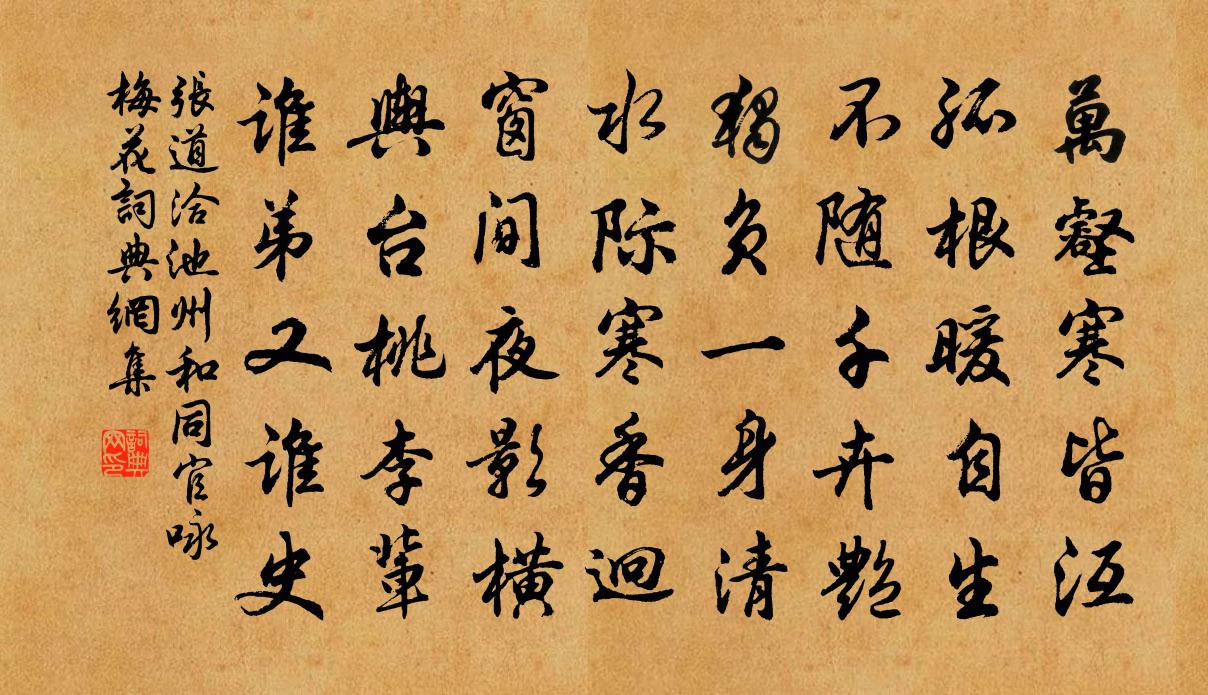 詩詞名句歷史字典書法欣賞書法字典國語詞典說文解字康熙字典古漢語字典標 題 作 者 詩 句 池州和同官詠梅花作者:張道洽 朝代:宋代池州和同官詠梅花原文萬壑寒皆沍,孤根暖自生。不隨千卉艷,獨負一身清。水際寒香迥,窗間夜影橫。輿台桃李輩,誰弟又誰史。詩詞問答問:池州和同官詠梅花的作者是誰?答:張道洽問:池州和同官詠梅花寫於哪個朝代?答:宋代張道洽池州和同官詠梅花書法欣賞池州和同官詠梅花書法作品詩詞推薦送王使君赴太原行營錢起〔唐代〕太白明無象,皇威未戢戈。諸侯持節鉞,千里控山河。漢驛雙旌度,胡沙七騎過。驚蓬連雁起,牧馬入雲多。不賣金剛隨機無盡頌無斷無滅分第二十七釋印肅〔宋代〕境上絕追尋,見境便生心。踢倒淨瓶了,溈山創佛林。寓言吳融〔唐代〕非明非暗朦朦月,不暖不寒慢慢風。獨臥空床好天氣,平生閒事到心中。題德清教場亭張祁〔宋代〕浩蕩秋光里,扁舟過德清。樓台占山影,鵝鴨亂溪聲。小飲經年別,清歌一邑驚。娟娟照人月,還憶謝宣城。偈頌一百二十三首釋祖欽〔宋代〕天不能蓋,地不能載。即之本無,棄權之則在。無本不無,在即不在。金剛與泥神揩背,一拶粉碎。和元遺山十首王奕〔宋代〕人惟君與師,得在天地間。蜂蟻失所主,生息決不蕃。逐日渴未死,顧影悲餘年。平生東魯心,卑首瞻聖賢。上下和永頻出省有日書事王珪〔唐代〕青蔥嘉樹鎖連甍,間憶東樓望遠情。禁壘曉煙浮舊色,御溝春水漱新聲。杯盤冷落留芳草,簾幕陰沈聽亂鶯。漢殿九月晦日作陸游〔宋代〕菊枝傾倒不成叢,桐葉凋零已半空。自是老來多感慨,不應蕭瑟為秋風。興慶池禊冥董士廉〔宋代〕歲和事簡正韶春,興慶池邊樂眾賓。尋勝此時追曲水,賞芳良會屬平津。映花語笑鞦韆女,隔岸絲簧祓禊人。深愧詠鹿蔥詩沈約〔南北朝〕野馬不任騎。兔絲不任織。既非中野花。無堪麕{鹿/加}食。物情李鹹用〔唐代〕誰分萬類二儀間,稟性高卑各自然。野鶴不棲蔥蒨樹,流鶯長喜艷陽天。李斯溷鼠心應動,莊叟泥龜意已堅。成是郊廟歌辭。善勝舞。禋順佚名〔唐代〕禮畢祀先,香散几筵。罷舞乾戚,收撤豆籩。與諸道者同游二室至九龍潭作白居易〔唐代〕喜逢二室遊仙子,厭作三川守土臣。舉手摩挲潭上石,開襟抖擻府中塵。他日終為獨往客,今朝未是自由身。若言題華亭尉廳梅館李洪〔宋代〕掃徑開窗事事新,主人解組似行人。浮香弄影無因得,試促花神作小春。秋日野步和王覺民十六首王之道〔宋代〕雨開繁菊金無價,風皺平池鑒有痕。日暮客帆何處落,柿林西畔荻花村。蘇仁仲計議挽章二首呂祖謙〔宋代〕登門疇昔奉從容,婺越之間一水通。今日江東無賀老,去年床下拜龐公。舊來論議多遺落,新出傳聞或異同。已矣暑雨鄭剛中〔宋代〕結廬在深寂,芳檐蔭松蘿。天晴風日溫,時有燕雀過。今茲夏暑雨,衡門可張羅。永嘆復 * ,幽興吾亦多。和東川李相公慈竹十二韻(次本韻)元稹〔唐代〕慈竹不外長,密比青瑤華。矛攢有森束,玉粒無蹉跎。纖粉妍膩質,細瓊交翠柯。亭亭霄漢近,靄靄雨露多。冰碧德遠叔坐上賦餚核八首藕楊萬里〔宋代〕荷衣芰制雪為容,家住雲煙太華峰。外面看來真璞玉,胸中琱出許玲瓏。偈頌一百二十三首釋祖欽〔宋代〕只此見聞非見聞,無餘聲色可呈君。嶺梅破雪偷開眼,一點清香欲斷魂。名句推薦強自取柱,柔自取束。荀子《荀子·勸學》 誰念西風獨自涼,蕭蕭黃葉閉疏窗,沉思往事立殘陽。納蘭性德《浣溪沙·誰念西風獨自涼》 春酒香熟鱸魚美,誰同醉?纜卻扁舟篷底睡。李珣《南鄉子·雲帶雨》 對秋深,離恨苦,數夜滿庭風雨。孫光憲《更漏子·對秋深》 誠者,非自成己而已也。所以成物也。成己仁也。成物知也。性之德也,合外內之道也。故時措之宜也。子思《中庸·第二十五章》 愁絕行人天易暮,行向鷓鴣聲里住納蘭性德《菊花新·用韻送張見陽令江華》 飛雪過江來,船在赤欄橋側。呂渭老《好事近·飛雪過江來》 一日不讀書,胸臆無佳想。蕭掄謂《讀書有所見作》 不種閒花,池亭畔、幾竿修竹。陸容《滿江紅·詠竹》 潮平兩岸闊,風正一帆懸。王灣《次北固山下》