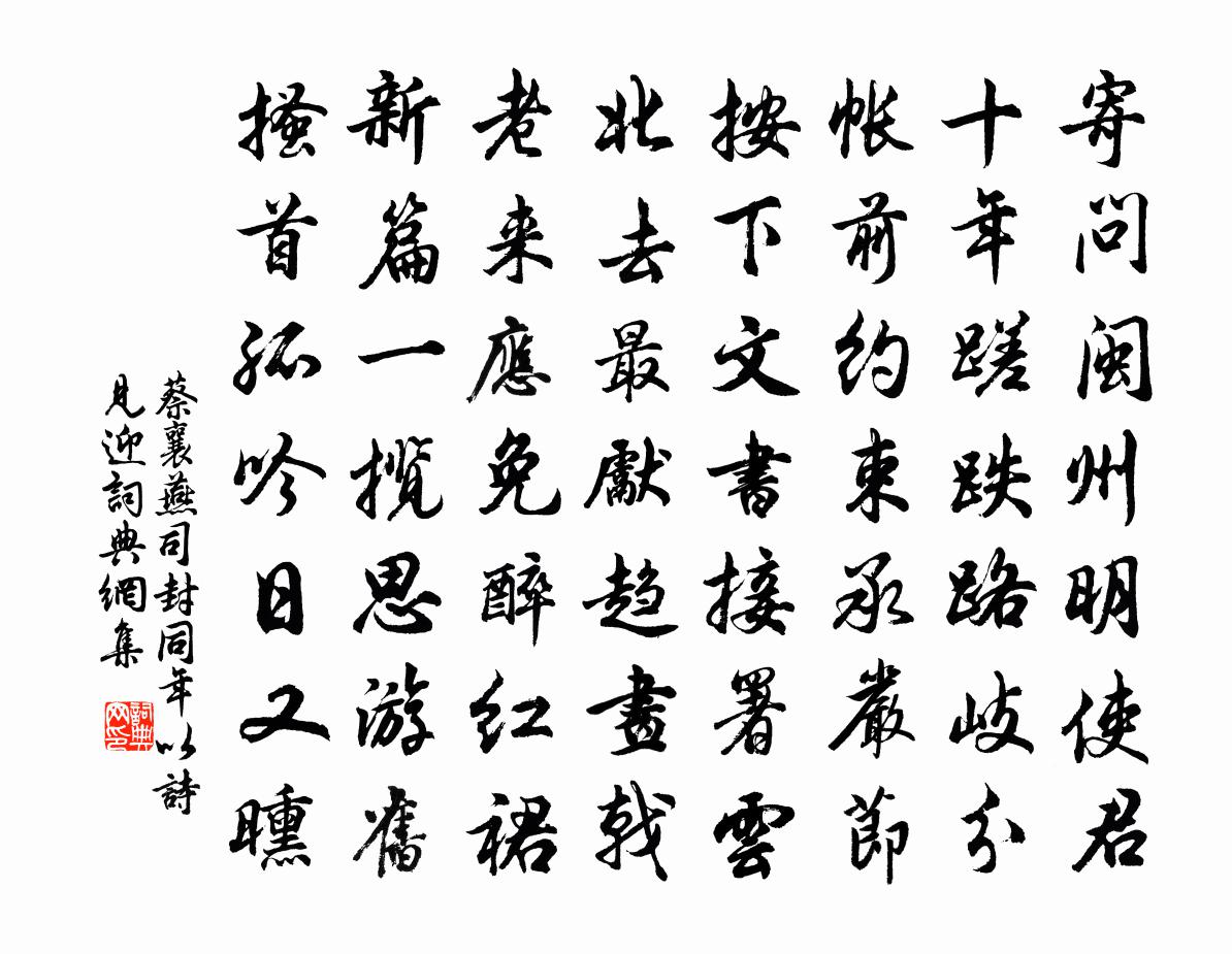 詩詞名句歷史字典書法欣賞書法字典國語詞典說文解字康熙字典古漢語字典標 題 作 者 詩 句 燕司封同年以詩見迎作者:蔡襄 朝代:宋代燕司封同年以詩見迎原文寄問閩州明使君,十年蹉跌路岐分。帳前約束承嚴節,按下文書接署雲。北去最先趨畫戟,老來應免醉紅裙。新篇一攬思游舊,搔首孤吟日又曛。詩詞問答問:燕司封同年以詩見迎的作者是誰?答:蔡襄問:燕司封同年以詩見迎寫於哪個朝代?答:宋代蔡襄燕司封同年以詩見迎書法欣賞燕司封同年以詩見迎書法作品詩詞推薦點絳唇(夜飲青雲樓,聞更漏近,如在腳底,因思向事,追念故作)趙長卿〔宋代〕瓦濕鴛鴦,夜深霜重江風冷。月華明映。清浸梅梢粉。漏斷寒濃,惹起當年恨。君休問。雁飛欲盡。沒個南來信。題司馬提舉畫鷹蘇泂〔宋代〕舊讀少陵句,今觀司馬鷹。風雲千變化,天地一飛騰。側目看枝鳥,回身掣臂繩。何由飲西顥,真逐羽毛升。題夏訓武珪畫牛張煒〔宋代〕枯木立數莖,斷岸走千尺。旁有牧牛兒,放牛倚拳石。牛閒芳草間,兒倦眠跼蹐。畫手筆入神,淡墨奪真跡。憑誰虞萬州生日魏了翁〔宋代〕春風吹我游錦官,客眸飽作滄江觀。鶴飛自由白日靜,山來不斷平野寬。主人聞客倒屣迎,案頭點易朱未乾。速呼和答還卷張舜民〔宋代〕屈宋功成道不傳,後來雞犬各登仙。留連光景隨時俗,盜竊聲名至暮年。陷沒李陵因北伐,漂流杜甫為南遷。耒陽禪人並化主寫真求贊釋正覺〔宋代〕木石形骸,冰雪肝膽。一點妙難名,十方機未感。寒林搖落兮誰捋老虎之須,滄海潮乾兮誰探老驪之頷。乙丑十一月十一日決獄次日迎帥舟中賦二詩首曾豐〔宋代〕滯舟推若泥,逆水去如還。已歷三辰次,才行十裡間。千斯吾命薄,獨爾破天慳。所賴聖賢事,其初不厭艱。人月圓 為細君壽魏初〔元代〕冷雲凍雪褒斜路,泥滑似登天。年來又到,吳頭楚尾,風雨江船。但教康健,心頭過得,莫論無錢。從今只望,兒貧客吟施肩吾〔唐代〕l6毯敝衣無處結,寸心耿耿如刀切。今朝欲泣泉客珠,及到盤中卻成血。答楊公朝劉克莊〔宋代〕昔抱遺編事悅堂,蟆陵宰樹想荒涼。問君鄉土生悲感,家住秦溪又姓楊。邀趙行之陳敬叟未至四韻速之劉學箕〔宋代〕一別親朋歲月催,衿連袂屬肯俱來。交情聊敘殷勤意,野蔌隨宜三兩杯。新月窺檐頻起顧,清風動竹几驚猜。碧雲早春閣下寓直蕭九舍人亦直內署因寄書懷四韻杜牧〔唐代〕御水初消凍,宮花尚怯寒。千峰橫紫翠,雙闕憑欄乾。玉漏輕風順,金莖淡日殘。王喬在何處,清漢正驂鸞。偈頌七十八首釋正覺〔宋代〕習習春風,絲絲春雨。一等沾濡,十方周普。甘草得之甜,黃連得之苦。天意發叢林,檐聲鬧窗戶。古德嘗雲已不與夢得沽酒閒飲且約後期白居易〔唐代〕少時猶不憂生計,老後誰能惜酒錢。共把十千沽一斗,相看七十欠三年。閒征雅令窮經史,醉聽清吟勝管弦。更待送韋秀才韓翃〔唐代〕東人相見罷,秋草獨歸時。幾日孫弘閣,當年謝朓詩。寒山葉落早,多雨路行遲。好憶金門步,功名自有期。和田家趙希逢〔宋代〕布衫裁就短平腰,兩兩三三步小橋。粗態撩人在何處,山花鬢畔露村嬌。孤鴻篇戴叔倫〔唐代〕江上雙飛鴻,飲啄行相隨。翔風一何厲,中道傷其雌。顧影明月下,哀鳴聲正悲。已無矰繳患,豈乏稻粱資。嗈嗈寄韜光禪師白居易〔唐代〕一山門作兩山門,兩寺原從一寺分。東澗水流西澗水,南山雲起北山雲。前台花發後台見,上界鐘聲下界聞。遙想夜聞鄰舟崔家兒歌黃庭堅〔宋代〕半夜聞歌客寢驚,空餘縹緲渡江聲。湘妃舞罷波紋冷,月欲銜山天未明。夏日偶題周文璞〔宋代〕溪友相呼上釣舟,藕花菱葉思悠悠。好詩已在前山寺,寫放參寥石井頭。名句推薦白雁亂飛秋似雪,清露生涼夜。吳西逸《清江引·秋居》 右手畫圓,左手畫方,不能兩成。韓非及後人《韓非子·功名》 已知泉路近,欲別故鄉難。夏完淳《別雲間》 知其不可奈何而安之若命,德之至也。莊子《莊子·內篇·人間世》 燒痕慘澹帶昏鴉,數盡寒梅未見花。陳孚《詠永州》 山城過雨百花盡,榕葉滿庭鶯亂啼。柳宗元《柳州二月榕葉落盡偶題》 卓眾來東下,金甲耀日光。蔡琰《悲憤詩》 花開堪折直須折,莫待無花空折枝。杜秋娘《金縷衣》 池花春映日,窗竹夜鳴秋。李白《謝公亭·蓋謝朓范雲之所游》 夜寒茅店不成眠,殘月照吟鞭。吳激《訴衷情·夜寒茅店不成眠》
