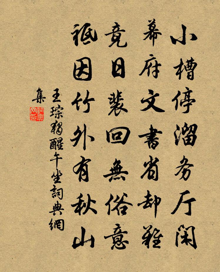 詩詞名句歷史字典書法欣賞書法字典國語詞典說文解字康熙字典古漢語字典標 題 作 者 詩 句 獨醒午坐作者:王琮 朝代:宋代獨醒午坐原文小槽停溜務廳閒,幕府文書省卻難。竟日裴回無俗意,祗因竹外有秋山。詩詞問答問:獨醒午坐的作者是誰?答:王琮問:獨醒午坐寫於哪個朝代?答:宋代王琮獨醒午坐書法欣賞獨醒午坐書法作品詩詞推薦句韓維〔宋代〕剡溪柔弱難爭強,紫岩緊實為最長。和仁仲春日十絕胡寅〔宋代〕燕舞方酣鶯又啼,草堂春睡日平西。枝頭有酒尋花去,小雨冥冥漸作泥。新秋即事金朋說〔宋代〕池塘高柳噪新蟬,庭館秋風初入弦。撫罷瑤琴金井畔,不堪梧吉落翩翩。雜題陸游〔宋代〕傳家只要存書種,學道當知養聖胎。寧使終身遷比景,莫令一物污靈台。寓居張嵲〔宋代〕是處為家得,斯居亦漫成。西齋便靜密,小閣更深明。送老一床足,遺形百慮輕。傍人訝幽僻,端可寄餘生。過桃花洞田家留飲鄭樵〔宋代〕偶促沼渚過山家。灼灼桃花噪暮鴉。是處竹籬環草屋,人間雞黍話桑麻。抱琴靜聽濤聲急,對酒閒觀月色奢。可笑贈醫僧善正蘇轍〔宋代〕老怯江邊瘴癘鄉,城東時喜到公房。歷言五藏如經眼,欲去三彭自有方。身厭遠遊安靜默,術因多病更深長。時時城南即事張栻〔宋代〕東風吹得綠成陰,積雨初收柳絮輕。記取湘中最佳處,橘花開時香滿城。宿山驛吳商浩〔唐代〕文戰何堪功未圖,又驅羸馬指天衢。露華凝夜渚蓮盡,月彩滿輪山驛孤。岐路辛勤終日有,鄉關音信隔年無。好同寄題鏡岩周尊師所居皮日休〔唐代〕八十餘年住鏡岩,鹿皮巾下雪髟髟。床寒不奈雲縈枕,經潤何妨雨滴函。飲澗猿回窺絕洞,緣梯人歇倚危杉。如何河亭晴望 九月八日。白居易〔唐代〕風轉雲頭斂,煙銷水面開。晴虹橋影出,秋雁櫓聲來。郡靜官初罷,鄉遙信未回。明朝是重九,誰勸菊花杯?思隱二首董嗣杲〔宋代〕岌頁愁城不可攻,三年心事入秋空。虛名已出諸公右,往事都歸一笑中。植杖耘田思北墅,補爐煮藥老西風。臨歸張信州禱晴輒應以詩賀之趙蕃〔宋代〕舍東舍西繰車鳴,陂南陂北秧壠平。共期今年好春事,自茲無苦惟須晴。如何忽作十日雨,農夫輟耕病紅女。爾曹三塔寺寒光亭張於湖書詞寺柱吳毅夫命名後軒岳珂〔宋代〕竹里逢僧院,殘碑不記年。雁題三崒堵,龍化兩魁躔。寶正號應紀,元豐墨尚鮮。寒光定何似,誰放五湖船。八聲甘州(懷歸)李石〔宋代〕向吳天萬里、一葉歸舟。歲月盡悠悠。有清歌一曲,醉中自笑,酒醒還愁。幾度春鶯囀午,塞雁橫秋。漁笛蓑衣底頌古一百二十一首釋宗杲〔宋代〕直出直入,當面不識。更擬如何,著甚死急。寄李季章參政葉適〔宋代〕袞袞入蜀者,借公兄弟名。每求歸載滿,預屏去橐傾。鷃飛雖地控,龍臥常天升。借哉坐時運,久郁時士情。文章真宗皇帝御製朱表御書贊岳珂〔宋代〕宋德茂三世,祥符闓九清。兢業帝道登,陟降王心寧。龍鸞夜染翰,虎豹晨抽扃。宸心勤惕憂,清思入杳冥。慶陰勸農二絕張榘〔宋代〕善端天賦本無殊,力穡之餘好讀書。莫訝勸農因勸學,須知公相起犂鋤。巫山廟崔塗〔唐代〕雙黛儼如嚬,應傷故國春。江山非舊主,雲雨是前身。夢覺傳詞客,靈猶福楚人。不知千載後,何處又為神?名句推薦雪嶺金河獨向東,吳山楚澤意無窮清江《送婆羅門》 蘭陵美酒鬱金香,玉碗盛來琥珀光。李白《客中行 / 客中作》 看似尋常最奇崛,成如容易卻艱辛。王安石《題張司業詩》 天下無難事,只怕有心人。曹雪芹《紅樓夢·第四十九回》 柳葉開銀鏑,桃花照玉鞍。駱賓王《送鄭少府入遼共賦俠客遠從戎》 春思亂,芳心碎。惠洪《千秋歲·半身屏外》 試問春歸誰得見?飛燕,來時相遇夕陽中。辛棄疾《定風波·暮春漫興》 蕙風如薰,甘露如醴。左思《三都賦》 荊山長號泣血人,忠臣死為刖足鬼李白《鞠歌行》 四顧山光接水光,憑欄十里芰荷香。黃庭堅《鄂州南樓書事》