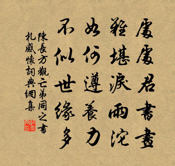 詩詞名句歷史字典書法欣賞書法字典國語詞典說文解字康熙字典古漢語字典標 題 作 者 詩 句 觀亡弟同之書札感懷作者:陳長方 朝代:宋代觀亡弟同之書札感懷原文處處君書畫,難堪淚雨沱。如何遵養力,不似世緣多。詩詞問答問:觀亡弟同之書札感懷的作者是誰?答:陳長方問:觀亡弟同之書札感懷寫於哪個朝代?答:宋代陳長方觀亡弟同之書札感懷書法欣賞觀亡弟同之書札感懷書法作品詩詞推薦元正書懷程公許〔宋代〕甲子循環六十年,手披新曆意茫然。了知自性覺玄妙,寧與世間寒乾遷。寡過得如蘧瑗花,諾惺要了瑞岩禪。故園次韻王鞏見寄蘇轍〔宋代〕日永官閒自在慵,門前客到未曾通。憐君避世都門裡,勸我忘憂酒盞中。城下柳陰新過雨,湖邊荷葉自翻風。早須劉小漕李新〔宋代〕亂紅纈眼柳花飛,煙抹霅溪秀一圍。北背美人占夢去,夕陽行客舞雩歸。三吳父老傳冰節,兩蜀江山識繡衣。預草倚樓陸游〔宋代〕減盡朱顏白髮新,高樓徙倚默傷神。未酬馬上功名願,已是人間老大身,太史周南方臥疾,拾遺劍外又逢春。一杯應舉早行繆蟾〔宋代〕半戀家山半戀床,起來顛倒著衣裳。鐘聲遠和雞聲雜,燈影斜侵劍影光。路崎嶇兮憑竹仗,月朦朧處認梅香。功名次韻曾仲躬侍郎同登伏龜二絕范成大〔宋代〕古來遊客謾西東,領會誰如我與公露坐繩床天不盡,絕勝簾雨棟雲中。清遠舟中寄耘老蘇軾〔宋代〕小寒初度梅花嶺,萬壑千岩背人境。清遠聊為泛宅行,一夢分明墮鄉井。覺來滿眼是湖山,鴨綠波搖鳳凰影。海陵水調歌頭(叔母生日)魏了翁〔宋代〕人道三十九,歲暮日斜時。兒今如許,才覺三十九年非。昨被玉山樓取,今仗牛山挽住,役役不知疲。自己未能信漁父辭毛直方〔宋代〕溪橋竹邊有酒沽,攜魚換酒滿葫蘆。篷頭月上不覺醉,自卷蘆葉吹嗚嗚。以皮鞋底贈石推官三首黃庭堅〔宋代〕鼻孔隨人走,日中忽見斗。踏定太沖脈,壁上掛著口。憶江南舊居雍陶〔唐代〕閒思往事在湖亭,亭上秋燈照月明。宿客盡眠眠不得,半窗殘月帶潮聲。將至筠先寄遲適遠三猶子蘇軾〔宋代〕露宿風餐六百里,明朝飲馬南江水。未見豐盈犀角兒,先逢玉雪王郎子。(時道逢王郎於建昌,方北行也。)對床戲贈王晦之黃庭堅〔宋代〕故人邇在登封居,折腲從事意何如。月明曾聽吹笙否,我亦未見緱山鳧。棲苴世上風波惡,情知不似田園樂。未知轉聲虞美人(霅上送唐彥猷·高平調)張先〔宋代〕使君欲醉離亭酒。酒醒離愁轉有。紫禁多時虛右。苕霄留難久。一聲歌掩雙羅袖。日落亂山春後。猶有東城煙柳。送程公辟守洪州王安石〔宋代〕畫船插幟搖秋光,鳴鐃傳鼓水洋洋。豫章太守吳郡郎,行指鬥牛先過鄉。鄉人出孰航酒漿,炰龜鱠魚炊稻粱。芡頭晚泊盱眙喻坦之〔唐代〕廣葦夾深流,蕭蕭到海秋。宿船橫月浦,驚鳥繞霜洲。雲濕淮南樹,笳清泗水樓。徒懸鄉國思,羈跡尚東遊。梨蘇軾〔宋代〕霜降紅梨熟,柔柯已不勝。未嘗蠲夏渴,長見助春冰。又兩絕蘇頌〔宋代〕看雪宜臨廣路津,年年光景見長新。不知滋液功多少,且慰東皋首種人。送劉學錄之建陽陳宓〔宋代〕馬蹄千里踏春風,為愛河陽制錦工。首重儒宗新像設,不妨特地拜文公。偶於龍井辨才處得歙硯甚奇作小詩蘇軾〔宋代〕羅細無紋角浪平,半丸犀璧浦雲泓。午窗睡起人初靜,時聽西風拉瑟聲。名句推薦在天願作比翼鳥,在地願為連理枝。白居易《長恨歌》 合意客來心不厭,知音人聽話偏長。馮夢龍《警世通言·卷一》 儻寄相思字,愁人定解顏。錢起《送夏侯審校書東歸》 清愁滿眼共誰論。卻應台下草,不解憶王孫。李之儀《臨江仙·登凌歊台感懷》 胡沙沒馬足,朔風裂人膚。韋元甫《木蘭歌》 春風得意馬蹄疾,一日看盡長安花。孟郊《登科後》 二月春花厭落梅。仙源歸路碧桃催。晏幾道《浣溪沙·二月春花厭落梅》 可憐赤壁爭雄渡,唯有蓑翁坐釣魚。杜牧《齊安郡晚秋》 不怨天,不尤人。孔子弟子《論語·憲問篇》 嗜欲不能勞其目,淫邪不能惑其心佚名《黃帝內經·上古天真論》