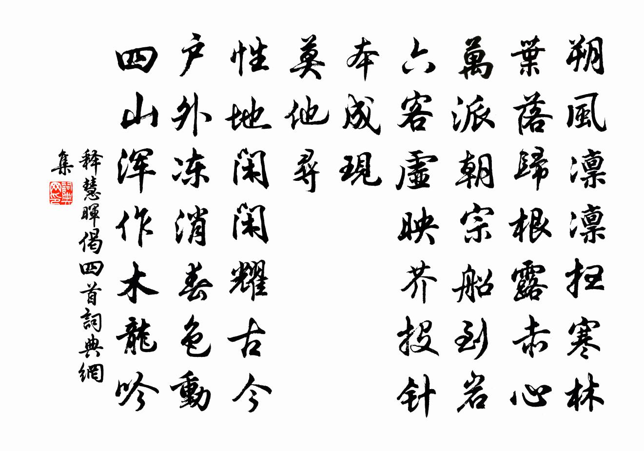 詩詞名句歷史字典書法欣賞書法字典國語詞典說文解字康熙字典古漢語字典標 題 作 者 詩 句 偈四首作者:釋慧暉 朝代:宋代偈四首原文朔風凜凜掃寒林,葉落歸根露赤心。萬派朝宗船到岩,六客虛映芥投針。本成現,莫他尋,性地閒閒耀古今。戶外凍消春色動,四山渾作木龍吟。詩詞問答問:偈四首的作者是誰?答:釋慧暉問:偈四首寫於哪個朝代?答:宋代釋慧暉偈四首書法欣賞偈四首書法作品詩詞推薦闕題周南〔宋代〕天憐羈跡寄諸侯,差近危欄付與秋。風物捲簾都在眼,湖山如畫恰當頭。征鴻已作隨陽計,社燕能為幾日留。賴有晨征鞏豐〔宋代〕靜觀群動亦勞哉,豈獨吾為旅食催。雞唱未圓天已曉,蛙鳴初散雨還來。清和入序殊無暑,小滿先時政有雷。酒賤山行葉茵〔宋代〕未了行春債,因喔遣興詩。寒多啼鳥噤,路滑蹇驢遲。久雨紅辭樹,深林綠授枝。驚心衰朽日,容易過花時。王君猷花圃八絕鑒池姚勉〔宋代〕春風鑒池水,長年弄清暉。仙翁晚歸來,子孫笑牽衣。禪人並化主寫真求贊釋正覺〔宋代〕祖祖家傳,心心印全。混沌未受鑿,威音不得專。蕉雷文象齒之所以,桂月暈犀角之能然。水自竹來兮綠非假借,和裴侍中南園靜興見示白居易〔唐代〕池館清且幽,高懷亦如此。有時簾動風,盡日橋照水。靜將鶴為伴,閒與雲相似。何必學留侯,崎嶇覓松子?和謝舍人雪夜寓直皇甫曾〔唐代〕禁省夜沉沉,春風雪滿林。滄洲歸客夢,青瑣近臣心。揮翰宣鳴玉,承恩在賜金。建章寒漏起,更助掖垣深。再次韻四首陳造〔宋代〕翰墨場中對抗旌,黃陳一筆萬鈞輕。武安屋瓦秋鼙震,湘水波光夜月晴。沮洳求魚真自笑,渚涯向若倍馳情。吾生春日宴魏萬成湘水亭劉長卿〔唐代〕何年家住此江濱,幾度門前北渚春。白髮亂生相顧老,黃鶯自語豈知人。黃嗣深尚書自臨川省其兄嗣文戶部於宜春用元曾幾〔宋代〕紛紛畫手調紅綠,好以桃花配叢竹。豈無短紙作江梅,雪裡溪邊太幽獨。李侯胸中有佳處,研滴松煤聊寓目。與梅題枕碧閣鄧肅〔宋代〕清流繩斷炎洲境,松響挾將寒意來。坐上逸情留不住,欲隨風月過蓬萊。寄郁上人姚合〔唐代〕此生修道淺,愁見未來身。誰為傳真諦,唯應是上人。自悲年已長,漸覺事難親。不向禪門去,他門無了因。木蘭花(次韻贈歌妓)舒亶〔宋代〕十二闌乾褰畫箔。取次穿花成小酌。彩鸞舞罷鳳孤飛,回首東風空院落。杳杳桃源仙路邈。晴日曉窗紅薄薄。傷春大中祥符五嶽加帝號祭告八首佚名〔宋代〕嚴嚴神岳,作鎮中央。肅奉徽冊,尊名孔章。聿降飈駕,載獻蘭觴。熙事允洽,實祚彌昌。朝中措(黃守座上用六一先生韻)胡銓〔宋代〕崖州何有水連空。人在浪花中。月嶼一聲橫竹,雲帆萬里雄風。多情太守,三千珠履,二肆歌鍾。日下即歸黃霸,次韻周希稷詠芭蕉喻良能〔宋代〕經年不接故人書,開戶逢渠了不殊。誰運七輪風裡扇,時跳千斛雨中珠。退之有意吟山石,摩詰無心作畫圖。為愛江城子(擬蒲江)周密〔宋代〕羅窗曉色透花明。靘瑤笙。按瑤箏。試訊東風,能有幾分春。二十四闌憑玉暖,楊柳月,海棠陰。依依愁翠沁雙顰題白沙驛張至龍〔宋代〕霧裹峰頭薄似巾,路逢水後誤行人。山泉釀酒力偏重,石銚煎茶味最真。燕不傳家猶教子,梅才有肉便生仁。枕邊金峨本老領優婆塞眾求寫選僧堂三大字示以數樓鑰〔宋代〕行者堂中選僧,眾僧堂中選佛。人道是,我卻不。不如莫待僧伽梨,便與豎起脊梁骨。大丈夫,休汩沒。一粒爆起菩薩蠻趙長卿〔宋代〕客帆卸盡風初定。夜空霜落無江冷。幸自不思歸。無端烏夜啼。雞鳴殘月落。到枕秋聲惡。有酒不須斟。酒深愁轉名句推薦自古聖賢盡貧賤,何況我輩孤且直!鮑照《擬行路難·其六》 玉樹猶難伸,壓倒千竿竹。環山樵《薛寶釵·雪竹》 正不容邪,邪復妒正。曹雪芹《紅樓夢·第二回》 嶺外音書斷,經冬復歷春。宋之問《渡漢江》 喜遇重陽,更佳釀今朝新熟。宋江《滿江紅·喜遇重陽》 石壕村里夫妻別,淚比長生殿上多。袁枚《馬嵬》 春思遠,誰嘆賞、國香風味。周密《繡鸞鳳花犯·賦水仙》 國君好仁,天下無敵焉。孟子《孟子·盡心章句下·第四節》 受人之託,忠人之事馮夢龍《警世通言·卷三十四》 雪嶺金河獨向東,吳山楚澤意無窮清江《送婆羅門》