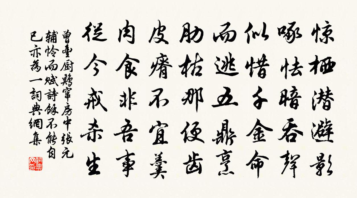 詩詞名句歷史字典書法欣賞書法字典國語詞典說文解字康熙字典古漢語字典標 題 作 者 詩 句 廚雞竄房中張元輔憐而賦詩餘不能自已亦為一作者:曾豐 朝代:宋代原文驚棲潛避影,啄怯暗吞聲。似惜千金命,而逃五鼎烹。肋枯那便齒,皮瘠不宜羹。肉食非吾事,從今戒殺生。詩詞問答問:《廚雞竄房中張元輔憐而賦詩餘不能自已亦為一》的作者是誰?答:曾豐問:該詩寫於哪個朝代?答:宋代書法欣賞廚雞竄房中張元輔憐而賦詩餘不能自已亦為一書法作品詩文賞析【原題】:廚雞竄房中張元輔憐而賦詩餘不能自已亦為一篇詩詞推薦飲馬長城窟鄭起〔宋代〕飲馬長城窟,下見征人骨。長城窟雖深,見骨不見心。誰知征人心,怨殺秦至今。北邊風打山,草地荒漫漫。五月送羽林長孫將軍赴歙州岑參〔唐代〕剖竹向江濆,能名計日聞。隼旗新刺史,虎劍舊將軍。驛舫宿湖月,州城浸海雲。青門酒樓上,欲別醉醺醺。開元寺東池早春白居易〔唐代〕池水暖溫暾,水清波瀲灩。簇簇青泥中,新蒲葉如劍。梅房小白裹,柳彩輕黃染。順氣草薰薰,適情鷗泛泛。舊遊念奴嬌楊炎正〔宋代〕漢天雲靜,望一星飛過,湘南湘北。當是郴山猿鶴夢,喚起日邊訊息。羽扇綸巾,浩然乘興,此意無人識。扁舟千陪辛大夫西亭宴觀妓劉長卿〔唐代〕歌舞憐遲日,旄麾映早春。鶯窺隴西將,花對洛陽人。醉罷知何事,恩深忘此身。任他行雨去,歸路裛香塵。聞時事戴復古〔宋代〕昨報西師奏凱還,近聞北顧一時寬。淮西勳業歸裴度,江右聲名屬謝安。夜雨忽晴看月好,春風漸老惜花殘。事關戲呈趙舜臣覓酒二首姜特立〔宋代〕畢君瓮下心成縛,屈子江邊又獨醒。賴有東陽賢府主,不嫌馳騎送寒廳。己已秋七月不雨人心焦然乃戊午齋宿致城隍清牟巘五〔宋代〕幾度看雲眼欲穿,不應氣數總關天。去年兵又今年旱,守也於民自豪緣。送陳樵校書歸泉州曹松〔唐代〕巨塔列名題,詩心亦罕齊。除官京下闕,乞假海門西。別席侵殘漏,歸程避戰鼙。關遙秦雁斷,家近瘴雲低。候馬演雅二十韻劉克莊〔宋代〕學道無所得,惟於鄙事能。九帙後篇什,來世有公評。豈未登社壇,直欲破劉城。六言與七字,如九轉煉成。宇宙君子行陸機〔魏晉〕天道夷且簡。人道險而難。休咎相乘躡。翻覆若波瀾。去疾苦不遠。疑似實生患。近火固宜熱。履冰豈惡寒。掇蜂憶王孫 有懷善住〔元代〕天涯芳草碧萋萋。何事王孫去不歸。城郭雖是人民非。信音稀。幾度和商洛章子厚長官早梅邵雍〔宋代〕霜扶清格高高起,風駕寒香遠遠留。太守多情客多感,金樽倒儘是良籌。楊花樓鑰〔宋代〕雨壓輕寒春較遲,春深不見柳綿飛。忽然飛入閒庭院,疑是故人何處歸。雨中花·夜行船蘇軾〔宋代〕雨中花慢 初至密州。以累年旱蝗。齋素累月。方春牡丹盛開。遂不獲一賞。至九月。忽開千葉一顓。雨 * 為置寄獻潤州趙舍人王禹偁〔宋代〕南徐城古樹蒼蒼,衙府樓台盡枕江。甘露鐘聲清醉榻,海門山色滴吟窗。直廬久負題紅藥,出鎮何妨擁碧幢。聞說效古詩范雲〔南北朝〕寒沙四面平,飛雪千里驚。風斷陰山樹,霧失交河城。朝驅左賢陣,夜薄休屠營。昔事前軍幕,今逐嫖姚兵。失道呂郡君輓詞張耒〔宋代〕表海東侯長,分吳異姓王。世家端作合,華裔遠相望。龍去孤神劍,雛成九鳳凰。多情潘散騎,悼逝足文章。東窗遣興陸游〔宋代〕夏淺清陰滿,村深白日長。言多思寂默,酒醒悔猖狂。老馬漫知路,鈍錐寧出囊?此翁真耄矣,嬾於亦何傷?文宣王及其弟子贊宋高宗〔宋代〕彼美邽子,先聖是承。牆仞已及,堂陛將升。良玉斯琢,寒水必水。錫壤平陸,茂實騫騰。名句推薦時無英雄,使豎子成名!房玄齡《晉書·列傳·第十九章》 誰信多情道,相思漸覺詩狂少。吳綺《惜分飛·寒夜》 今日聽君歌一曲,暫憑杯酒長精神。劉禹錫《酬樂天揚州初逢席上見贈》 回眸一笑百媚生,六宮粉黛無顏色。白居易《長恨歌》 孔子亦矙其亡也,而往拜之。孟子《孟子·滕文公章句下·第七節》 檐流未滴梅花凍,一種清孤不等閒。鄭燮《山中雪後》 少年心事當拿雲,誰念幽寒坐嗚呃。李賀《致酒行》 布被秋宵夢覺,眼前萬里江山。辛棄疾《清平樂·獨宿博山王氏庵》 世間最難得者兄弟。程登吉《幼學瓊林·卷二·兄弟》 君子耳不聽淫聲,目不視邪色,口不出惡言荀子《荀子·樂論》