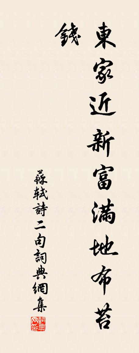 詩詞名句歷史字典書法欣賞書法字典國語詞典說文解字康熙字典古漢語字典標 題 作 者 詩 句 詩二句作者:蘇軾 朝代:宋代詩二句原文東家近新富,滿地布苔錢。詩詞問答問:詩二句的作者是誰?答:蘇軾問:詩二句寫於哪個朝代?答:宋代問:蘇軾的名句有哪些?答:蘇軾名句大全蘇軾詩二句書法欣賞詩二句書法作品詩詞推薦水村即事二首釋文珦〔宋代〕草徑別通村墅,柴門只對河塍。老婦自安雞柵,小兒解守魚罾。武夷精舍十詠釣磯袁樞〔宋代〕投轄出東溟,持竿歸九曲。溪翁來問訊,笑失雙鬢綠。潭邊舊釣石,瑩滑磨青玉。竟日謾垂綸,忘機看鷗浴。送元勛不伐侍親之官泉南八首李廌〔宋代〕粵藤玉板澤於脂,歙婺隃糜理勝犀。歸日錦囊詩幾許,七閩當有數千題。依韻和馮亞見贈魏野〔宋代〕君向城中住,淳風想獨還。相逢多解夢,不見少開顏。期約多尋藥,商量共買山。羨予庭際石,重疊蘚痕斑。溫湯客舍劉長卿〔唐代〕冬狩溫泉歲欲闌,宮城佳氣晚宜看。湯熏仗里千旗暖,雪照山邊萬井寒。君門獻賦誰相達,客舍無錢輒自安。且喜秋熱李覯〔宋代〕江湖限南鄙,秋令到還稀。節換空看歷,人閒未趁衣。齊紈方得意,廈燕莫言歸。祗有松筠徑,風高暑氣微。次韻張守秋懷四首劉子翬〔宋代〕徙倚山堂晚,悲秋萬古情。雨蔬猶擢秀,風沼自揚清。野迥歸牛小,沙寒白鳥明。淒淒楓柳樹,汝意亦難平。入省陸游〔宋代〕點點輕花墮綠槐,翩翩羸馬犯黃埃。眼邊好句等閒過,夢裡故人時一來。玉塞請行狂故在,霜髭自照老相催。今朝歲假內命酒贈周判官蕭協律白居易〔唐代〕共知欲老流年急,且喜新正假日頻。聞健此時相勸醉,偷閒何處共尋春?腳隨周叟行猶疾,頭比蕭翁白未勻。歲酒書黃山館壁寇準〔宋代〕殘日住孤館,遲遲行古台。大河連野去,白鳥背城來。離恨渾如結,鄉心漸欲灰。山花半寥落,猶在社前開。夢東坡先生方回〔宋代〕夜夢帶東坡公,帶分我龍腦帶香。玉指撮冰雪,佩之鞶帶囊。江湖衰老蹤,十度游尋陽。始入紫極帶。勉和瓊田章和柯古窮居苦日喜雨韋蟾〔唐代〕貞機澹少思,雅尚防多僻。攬葛猶不畏,勞形同處瘠。頭焦詎是焚,背汗寧關炙。方欣見潤礎,那虞悲鑠石。道與慈谿龍虎軒偶成呂祖儉〔宋代〕年來世路轉蹉跎,正大中庸論愈多。出本無心歸亦好,何須胸次自干戈。挽葉子儀二首杜范〔宋代〕性質孰無偏,工夫豈易鐫。人誰知此學,我獨謂公賢。耿耿存憂世,悠悠付逝川。一經端有屬,拭目看家傳。登上封三絕胡寅〔宋代〕仰止高高几夢思,躋攀乘興遂忘疲。直須駐足青冥上,方信前山次第卑。山居連文鳳〔宋代〕無名亦無利,非隱又非仙。逐獸機心息,聞禽野性便。俗淳猶近古,人老不知年。此是山居樂,山中別一天。和曹憲金華山韻上李雁湖吳泳〔宋代〕楚台快談風,梁園騁歌雪。濫觴起九章,流波到七發。雕空竟何事,如以紙帖月。巽岩錦褧衣,雁湖木霏屑。桃源憶故人 重陽師父相引登蓬萊閣馬鈺〔元代〕風仙同我蓬萊宴。□玩蓬萊清淺。海市蓬萊出現。虎嘯蓬萊苑。龍吟蟠繞蓬萊殿。鶴馭蓬萊鳳輦。丹顯蓬萊九轉。又上監察御史王珪〔唐代〕一札興賢聖化新,觀光上國已彬彬。右文幸際休明世,奉昭猶須牧守臣。鵜鴃不為芳草計,鷦鷯似畏罻羅人。軺車偈頌一百零九首釋可湘〔宋代〕觸目未嘗無,臨機道什麼。錢是足陌,物是定價。坐破七個 * ,捲簾方見天下。千里追風非駿馬。名句推薦料有牽情處,忍思量、耳邊曾道。時彥《青門飲·寄寵人》 寒梅最堪恨,常作去年花。李商隱《憶梅》 九日龍山飲,黃花笑逐臣。李白《九日龍山飲》 千古江山,英雄無覓孫仲謀處。辛棄疾《永遇樂·京口北固亭懷古》 青女素娥俱耐冷,月中霜里斗嬋娟。李商隱《霜月》 抽刀斷水水更流,舉杯銷愁愁更愁。李白《宣州謝朓樓餞別校書叔雲 / 陪侍御叔華登樓歌》 羅袂從風輕舉,愁殺採蓮女!毛文錫《應天長·平江波暖鴛鴦語》 是非成敗轉頭空。楊慎《臨江仙·滾滾長江東逝水》 天網恢恢,疏而不失。老子《老子·德經·第七十三章》 城小賊不屠,人貧傷可憐元結《賊退示官吏》