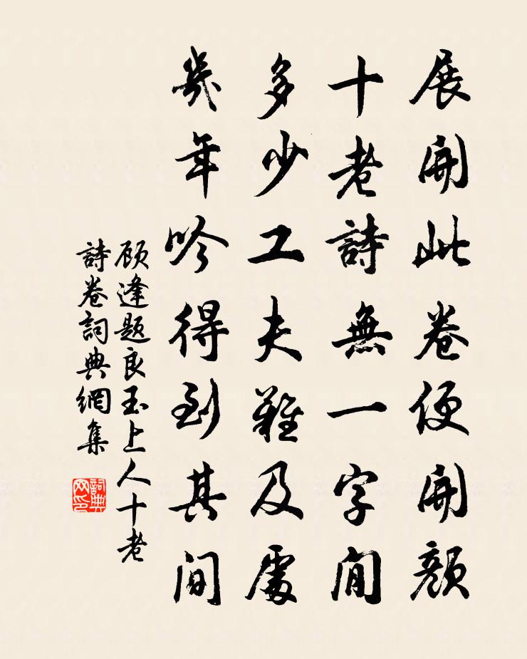 詩詞名句歷史字典書法欣賞書法字典國語詞典說文解字康熙字典古漢語字典標 題 作 者 詩 句 題良玉上人十老詩卷作者:顧逢 朝代:宋代題良玉上人十老詩卷原文展開此卷便開顏,十老詩無一字閒。多少工夫難及處,幾年吟得到其間。詩詞問答問:題良玉上人十老詩卷的作者是誰?答:顧逢問:題良玉上人十老詩卷寫於哪個朝代?答:宋代顧逢題良玉上人十老詩卷書法欣賞題良玉上人十老詩卷書法作品詩詞推薦前有一尊酒行張鎡〔宋代〕霖雨半月今夕晴,風堂人稀燈燭明。涼蟲咽咽傍牆竹,聽久但促孤愁生。愁生欲伏誰驅遣,渾汗翠液玻瓈軟。五斗金陵酬李翰林謫仙子魏萬〔唐代〕君抱碧海珠,我懷藍田玉。各稱希代寶,萬里遙相燭。長卿慕藺久,子猷意已深。平生風雲人,暗合江海心。去秋鬱林州李運使〔宋代〕肩與初入鬱林州,井邑都如舊日游。雖有山川供遠目,不堪雨露濕征裘。土風慣習瘴誰慮,客況寂寥心自愁。春去次韻志歸十首方回〔宋代〕譙國資深入,彭門納晚成。至今為癖習,自幼有常程。朽老寧孤瘦,飛揚勿剽輕。懸知千載士,肯競一時名。玉燭新楊無咎〔宋代〕荒山藏古寺。見傍水梅開,一枝三四。蘭枯蕙死。登臨處、慰我魂消惟此。可堪紅紫。曾不解、和羹結子。高壓盡深居雜興六首林逋〔宋代〕松竹封侯尚未尊,石為公輔亦云雲。清華自合論閒客,玄默何妨事靜君。鶴料免慚屍厚祿,茶功兼擬策元勛。幽人中橋二首岳珂〔宋代〕過了平湖又小溪,卻從蕪徑訪多歧。如何江上乘風鷁,化作泥中曳蚝龜。誰遣旌旟行沮洳,定知鼓吹宅漣漪。中橋句劉筠〔宋代〕空呈厚貌臨官道,更有人從捷徑過。梅花落徐陵〔南北朝〕對戶一株梅。新花落故栽。燕拾還蓮井。風吹上鏡台。娼家怨思妾。樓上獨徘徊。啼看竹葉錦。簪罷未能裁。玉蝴蝶孫光憲〔唐代〕春欲盡,景仍長,滿園花正黃。粉翅兩悠颺,翩翩過短牆。鮮飆暖,牽遊伴,飛去立殘芳。無語對蕭娘,舞衫沉麝次韻蒲左丞游虎丘十首朱長文〔唐代〕掃石個蘿向上行,門前坐見白雲生。應思夢得多佳趣,獨宿樓中待月明。新樓詩二十首禹廟李紳〔唐代〕削平水土窮滄海,畚鍤東南盡會稽。山擁翠屏朝玉帛,穴通金闕架雲霓。秘文鏤石藏青壁,寶檢封雲化紫泥。清廟薄台張舜民〔宋代〕屈曲清溪十里長,淨涵天影與秋光。此行卻在樊川尾,稻熟魚肥柿子黃。柳李億〔宋代〕倚岸依依一兩株,溪風吹影暮煙疏。青條拂水長如線,釣叟折來穿白魚。憑宣教寫真請贊釋正覺〔宋代〕山林之姿,水月之像。雷潛九地之中,春在百華之上。隨緣半合半開,分付全收全放。淵默家風,縱橫伎倆。道超逍遙詠宋太宗〔宋代〕靈元物象向天涯,古往今來聖事夸。無礙智通精進心,研窮理路互交加。新春陸游〔宋代〕老境三年病,新元十日陰。疏籬枯蔓綴,壞壁綠苔侵。憂國孤臣淚,平胡壯士心。吾非兒女輩,肯賦白頭吟?與金陵傅漕余預鄉薦時傅兄持文衡楊冠卿〔宋代〕鄉書憶昔獻賢能,姓字曾叨天府登。闕里摳衣欣附鳳,雲程斂翼愧飛鵬。流年自信一彈指,末路誰惟三折肱。若見又次韻宋茂叔送行五絕兼謝修叔趙蕃〔宋代〕山到窮時一徑開,數松幾竹與縈迴。我歸釀黍仍鋤菜,準擬籃輿窈窕來。聞兒輩舉漁者言喜成古調錢時〔宋代〕魚固人所欲,痰飲常忌此。茲晨一杯羹,食之乃大美。漁者包裹來,樂與我為市。兒輩問何故,秤平不虧爾。吾家名句推薦燕子不知人去也,飛認闌乾。韓疁《浪淘沙·莫上玉樓看》 世上無難事,只要肯登攀。 * 《水調歌頭·重上井岡山》 唯見鴻雁飛,令人傷懷抱。高適《登百丈峰二首》 林表明霽色,城中增暮寒。祖詠《終南望余雪》 人無善志,雖勇必傷。劉安及其門客《淮南子·主術訓》 故知之始己,自知而後知人也。王詡《鬼谷子·反應》 典盡客衣三尺雪,煉精詩句一頭霜。王建《維揚冬末寄幕中二從事》 月落沙平江似練。望盡蘆花無雁。張炎《清平樂·候蛩淒斷》 古人不見今時月,今月曾經照古人。佚名《增廣賢文·上集》 雲中亂拍祿山舞,風過重巒下笑聲。杜牧《過華清宮絕句三首》