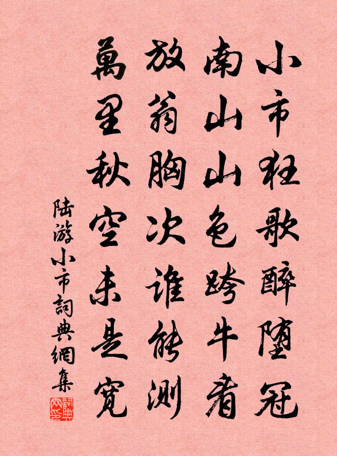 詩詞名句歷史字典書法欣賞書法字典國語詞典說文解字康熙字典古漢語字典標 題 作 者 詩 句 小市作者:陸游 朝代:宋代小市原文小市狂歌醉墮冠,南山山色跨牛看。放翁胸次誰能測,萬里秋空未是寬。詩詞問答問:小市的作者是誰?答:陸游問:小市寫於哪個朝代?答:宋代問:陸游的名句有哪些?答:陸游名句大全陸游小市書法欣賞小市書法作品詩詞推薦寄李播評事杜牧〔唐代〕子列光殊價,明時忍自高。寧無好舟楫,不泛惡風濤。大翼終難戢,奇鋒且自韜。春來煙渚上,幾淨雪霜毫?黃鶴洞中仙 繼重陽韻馬鈺〔元代〕火院須當遠。塵事難為染。因遇風仙棄冤親,做個投真馬,得得超彼岸。即達逍遙岸。鍊氣如素練。專下工夫分假送王龜處士姚合〔唐代〕送客客為誰,朱門處士稀。唯修曾子行,不著老萊衣。古寺隨僧飯,空林共鳥歸。壺中駐年藥,燒得獻庭闈。已亥雜詩 305龔自珍〔清代〕欲從太史窺春秋,勿向有字句虛求。抱微言者太史氏,大義顯顯則予休。立春郊行次唐玉潛林景熙〔宋代〕道人清事飯溪蔬,無酒閒愁已破除。五夜雪聲梅角底,一春煙景竹筇初。園林芳信醒愁蝶,田野豐年入夢魚。冰下暨陽居四首王令〔宋代〕斯道久泯泯,斯人固悠悠。歸豚非吾心,在禮惡不酬。從人效屈伸,俯仰不自由。於命有當然,信矣何足羞。別眉山源上人員興宗〔宋代〕我生喜際招提客,欲宜漚幻子塵色。偶然揮斥仍六極,無相光中豈南北。上人得我慰寂寞,相與含笑了一默。生死登禹廟回降雪五言二十韻李紳〔唐代〕金奏雲壇畢,同雲拂雪來。玉田千畝合,瓊室萬家開。湖暗冰封鏡,山明樹變梅。裂繒分井陌,連璧混樓台。麻引木蘭花·清琴再鼓求凰弄賀鑄〔宋代〕清琴再鼓求凰弄,紫陌屢盤驕馬鞚。遠山眉樣認心期,流水車音牽目送。歸來翠被和衣擁,醉解寒生鐘鼓動。此歡夏州道中黃滔〔唐代〕隴雁南飛河水流,秦城千里忍回頭。征行渾與求名背,九月中旬往夏州。卻渡西陵別越中父老李紳〔唐代〕海潮晚上江風急,津吏篙師語默齊。傾手奉觴看故老,擁流爭拜見孩提。慚非杜母臨襄峴,自鄙朱翁別會稽。漸舉送醴與子才司馬光〔宋代〕昔賢尊道誼,置醴待嘉賓。今我樂閒放,提壺餉故人。蟣浮杯麵白,味撇瓮頭醇。何以助高興,籬邊菊蕊新。水龍吟(酴醿·春景)趙長卿〔宋代〕韶華迤邐三春暮。飛盡繁紅無數。多情為與,牡丹長約,年年為主。曉露凝香,柔條千里,輕盈清素。最堪憐,玉次韻鄭逢辰直閣遷新居趙彥端〔宋代〕生當帶索守林廬,不合輕拋種樹書。賀燕得公真是樂,弊貂將我竟何如。殊鄉更覺鄰為貴,晚歲深期燭有餘。上下夙興陳與義〔宋代〕美哉木枕與菅席,無耐當興戴朝幘。巷南巷北聞鍛聲,舍後舍前唯月色。事國無功端未去,竹輿伊鴉猶昨日。不見答鄒象先蕭穎士〔唐代〕桂枝常共擢,茅茨冀同薦。一命何阻修,載馳各川縣。壯圖悲歲月,明代恥貧賤。回首無津梁,只令二毛變。九日岳陽待黃遂、張渙劉長卿〔唐代〕別君頗已久,離念與時積。楚水空浮煙,江樓望歸客。徘徊正佇想,仿佛如暫覿。心目徒自親,風波尚相隔。青林橫吹曲辭。入塞劉希夷〔唐代〕將軍陷虜圍,邊務息戎機。霜雪交河盡,旌旗入塞飛。曉光隨馬度,春色伴人歸。課績朝明主,臨軒拜武威。送林使君赴邵州姚合〔唐代〕詔書飛下五雲間,才子分符不等閒。驛路算程多是水,州圖管地少于山。江頭斑竹尋應遍,洞裡丹砂自采還。清淨太常引劉雲震〔元代〕東湖亭下簇金鞍。四座浹青歡。人物畫中看。只枉了、劉郎鬢斑。花枝裊娜,酒杯瀲灩,全不放春閒。絲竹舊東山名句推薦桃花塢裏桃花庵,桃花庵裏桃花仙。唐寅《桃花庵歌》 青苔滿階砌,白鳥故遲留。杜牧《題揚州禪智寺》 砌下落花風起,羅衣特地春寒。馮延巳《清平樂·雨晴煙晚》 山黛遠,月波長,暮雲秋影蘸瀟湘。蔡松年《鷓鴣天·賞荷》 同來何事不同歸。賀鑄《半死桐·重過閶門萬事非》 白鳥一雙臨水立,見人驚起入蘆花。戴復古《江村晚眺》 蜂兒不解知人苦,燕兒不解說人愁。程垓《最高樓·舊時心事》 綺席象床寒玉枕,美人何處醉黃花。汪元量《望江南·幽州九日》 人無剛骨,安身不牢。施耐庵《水滸傳·第二十四回》 天覆吾,地載吾,天地生吾有意無。李泌《長歌行》