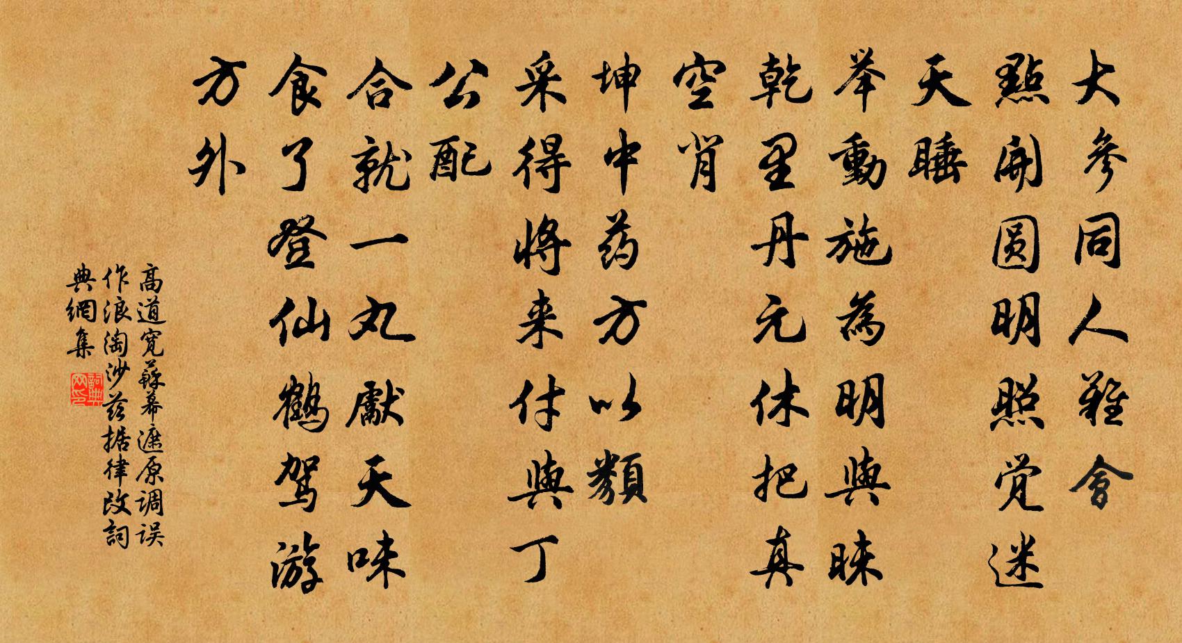 詩詞名句歷史字典書法欣賞書法字典國語詞典說文解字康熙字典古漢語字典標 題 作 者 詩 句 蘇幕遮 原調誤作浪淘沙,茲據律改作者:高道寬 朝代:元代原文大參同,人難會。點開圓明,照覺迷天睡。舉動施為明與昧。乾里丹元,休把真空背。坤中藥,方以類。採得將來,付與丁公配。合就一丸先天味。食了登仙,鶴駕遊方外。詩詞問答問:《蘇幕遮 原調誤作浪淘沙,茲據律改》的作者是誰?答:高道寬問:該詩寫於哪個朝代?答:元代問:該詩是什麼體裁?答:詞書法欣賞蘇幕遮 原調誤作浪淘沙,茲據律改書法作品詩詞推薦題延慶觀六時泉王之望〔宋代〕千尺高崖屏翠琰,六時甘露雨真珠,梯岩穿壑身親到,始信仙靈境界殊。桃源憶故人朱敦儒〔宋代〕誰能留得朱顏住。枉了百般辛苦。爭似蕭然無慮。任運隨緣去。人人放著逍遙路。只怕君心不悟。彈指百年今古。山中方乾〔唐代〕散拙亦自遂,粗將猿鳥同。飛泉高瀉月,獨樹迥含風。果落盤盂上,雲生篋笥中。未甘明聖日,終作釣漁翁。獻中書潘舍人李中〔唐代〕運葉半千數,天鍾許國臣。鵬霄開羽翼,鳳闕演絲綸。顧問當清夜,從容向紫宸。立言成雅誥,正意敘彝倫。樸素題三桂亭陳堯咨〔宋代〕不夸六印滿腰懸,二頃仍尋負郭田。當日弟兄皆刷羽,如今鴻雁盡摩天。扶疏已問新栽柳,清淺猶尋舊漱泉。大尹句張環〔宋代〕人間獨有當時月,山際獨無後世樵。曲江解舟釋紹嵩〔宋代〕動靜非常態,此行風正秋。巉巉孤棹起,渺渺大江流。蟬噪日將落,煙生山欲浮。無心與時競,吟憑釣魚舟。贈劉琨詩二十首 十二盧諶〔魏晉〕塗炭既濟。寇挫民阜。謬其疲隸。授之朝右。上懼任大。下欣施厚。實祗高明。敢忘所守。季允用韻各賦兩章予亦再賦四首李壁〔宋代〕新阡淚葉記霜余,早見春風萬壑俱。姱節當時誰鶚立,故人今日半鵬圖。清談我不如平子,下策君元笑阿奴。此地索莫張耒〔宋代〕索莫歸未得,閒雲還滿空。愁吟對寒月,不睡到晨鐘。衣喜初冬寄,書憐手自封。何當聽夜雪,暖酒夜爐紅。採桑子馮延巳〔唐代〕櫻桃謝了梨花發,紅白相催。燕子歸來,幾度香風綠戶開。人間樂事知多少,且酹金杯。管咽弦哀,慢引蕭娘舞袖木蘭花(月下)莫將〔宋代〕暗香浮動黃昏後。更是月明如白晝。看來都坐玉壺冰,折贈徐妃丹桂手。賞酬風景無過酒。對影成三誰左右。勸君次韻史少莊竹醉日移竹魏了翁〔宋代〕猩屐常為醉魂役,驪珠適與睡時丁。外物移人每如此,人心可使不長醒。六州佚名〔宋代〕炎圖盛,六葉正,協重光。膺寶瑞,更法度,智勇超軼成湯。昭回雲漢爛文章。震揚威武懾多方。生民帖泰擁殊祥驀山溪朱敦儒〔宋代〕瓊蔬玉蕊。久寄清虛里。春到碧溪東,下白雲、尋桃問李。彈簧吹葉,懶傍少年場,遺楚佩,覓秦簫,踏破青鞋底大飢行揭傒斯〔元代〕去年旱毀才五六,今年家家食無粟。高囷大廩閉不開,朝為骨肉暮成哭。官雖差官遍里閭,貪廉異政致澤殊。公家復賡前韻且以陋居幽勝詫而誘之林逋〔宋代〕畫共藥材懸屋壁,琴兼茶具入船扉。秋花挹露如紅粉,水鳥沖煙濕翠衣。石磴背穿林寺近,竹煙橫點海山微。百千別鄒秀才釋正覺〔宋代〕聲利明來若夢遊,肯迂征家宿雲棲。情高素抱山樊志,性淡幽尋松石儔。愛我家風清入眼,問伊時事默搖頭。今朝送高景仁之廣德連文鳳〔宋代〕不愁離別難,江浙片雲間,黃葉晚秋徑,白茅深處山。有詩連夢遠,無累得身間。若遇西風便,安書寄雁還。琴枕釋師範〔宋代〕巧出焦桐樣,淳含太古音。多因和夢聽,只作夜蟲吟。名句推薦余凡事喜獨出己見,不屑隨人是非。沈復《浮生六記·浪遊記快》 因人成事,其功不難。魏徵《隋書·列傳·卷七》 望君煙水闊,揮手淚沾巾。劉長卿《餞別王十一南遊》 荷葉出地尋丈,因列坐其下,上不見日。姜夔《念奴嬌·鬧紅一舸》 待把酒送君,恰又清明後。何夢桂《摸魚兒·記年時人人何處》 池上憑闌愁無侶。奈此個、單棲情緒。柳永《甘草子·秋暮》 庫無備兵,雖有義,不能征無義。墨子《墨子·05章 七患》 修己而不責人左丘明《左傳·閔公·閔公二年》 重唱梅邊新度曲,催發寒梢凍蕊。吳文英《金縷歌·陪履齋先生滄浪看梅》 惟有兩行低雁,知人倚、畫樓月。范成大《霜天曉角·梅》