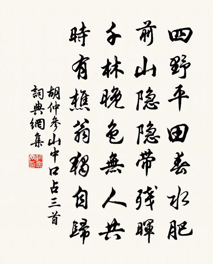 詩詞名句歷史字典書法欣賞書法字典國語詞典說文解字康熙字典古漢語字典標 題 作 者 詩 句 山中口占三首作者:胡仲參 朝代:宋代山中口占三首原文四野平田春水肥,前山隱隱帶殘暉。千林晚色無人共,時有樵翁獨自歸。詩詞問答問:山中口占三首的作者是誰?答:胡仲參問:山中口占三首寫於哪個朝代?答:宋代胡仲參山中口占三首書法欣賞山中口占三首書法作品詩詞推薦過洞庭來廷紹〔宋代〕日落君山暮,秋風過洞庭。一官身外物,千里客中情。北望鄉關遠,南來旅雁鳴。孤帆無限恨,斜指岳陽城。朱清之薛師石〔宋代〕漈水日夜白,之人信所宜。隱於陶令酒,甘謝郗詵枝。江渡月偏滿,家庭歲有規。不知君沒後,誰主菊花期。六月七日泊金陵,阻風,得鐘山泉公書,寄詩蘇軾〔宋代〕今日江頭天色惡,炮車雲起風欲作。獨望鐘山喚寶公,林間白塔如孤鶴。寶公骨冷喚不聞,卻有老泉來喚人。電眸春晴白玉蟾〔宋代〕宿靄縈余凍,鬆陰挾嫩晴。朝來花萬福,鶯奏起居聲。頌古一百首釋智愚〔宋代〕玉簫吹徹鳳凰台,古殿深覺曉未開。滿地落花春已過,綠陰空鎖舊莓苔。臨水薔薇李群玉〔唐代〕堪愛復堪傷,無情不久長。浪搖千臉笑,風舞一叢芳。似濯文君錦,如窺漢女妝。所思雲雨外,何處寄馨香。句諶祜〔宋代〕六鰲傾側動乾坤,國母巡荒護帝孫。北極星辰臨草地,西風觀闕臥花門。十三晨起雪晴前言果驗用定王台韻賦詩林用中〔宋代〕今朝風日好,抱病起登台。山色愁無盡,江波去不回。客懷無老草,節物又疏梅。且莫催歸騎,憑欄理一杯。偈頌十八首釋如淨〔宋代〕者個是百尺竿頭,進一步則有象,退一步則無蹤。進退全機變,從衡振祖風。都在南山掌握中。無題陸游〔宋代〕畫閣無人晝漏稀,離悰病思兩依依。釵梁雙燕春先到,箏柱羈鴻暖不歸。迎得紫姑占近信,裁成白紵寄征衣。晚來送王汶宰江陰張循之〔唐代〕郡北乘流去,花間竟日行。海魚朝滿市,江鳥夜喧城。讓酒非關病,援琴不在聲。應緣五斗米,數日滯淵明。題朱郎中白都莊王安石〔宋代〕蕭灑桐廬守,滄洲寄一廛。山光隔釣岸,江氣雜炊煙。藜杖聽鳴櫓,籃輿看種田。明時須共理,此興在他年。和慎思重九考罷試卷書呈同院諸公蔡肇〔宋代〕清秋官舍酒瓶空,滿袖黃花情所鍾。忽得數篇吟可老,絕知開口笑難逢。浮舟有底不歸去,戲馬猶能限莫從。江上壬戌清明作屈大均〔清代〕朝作輕寒暮作陰,愁中不覺已春深。落花有淚因風雨,啼鳥無情自古今。故國江山徒夢寐,中華人物又銷沉。龍蛇暮春與諸同僚登鐘山望牛首蘇頌〔宋代〕清明天氣和,江南春色濃。風物正繁富,邦人競游從。官曹幸多暇,交朋偶相逢。並驅出東郊,乘興游北鍾。陟險答孔平仲惠蕉布二絕蘇轍〔宋代〕裘葛終年累已輕,薄蕉如霧氣尤清。應知浣濯衣棱敗,少助晨趨萃蔡聲。燈籠白葛扇裁紈,身似山僧不似官。更得寓廣教僧寺曾幾〔宋代〕似病元非病,求閒方得閒。殘僧六七輩,敗屋兩三間。野外無供給,城中斷往還。同參木上座,與汝住茶山。晏子不死君難左丘明〔先秦〕崔武子見棠姜而美之,遂取之。莊公通焉。崔子弒之。 晏子立於崔氏之門外。其人曰:“死乎?”曰:“獨吾早朝十絕趙子潚〔宋代〕北面高呼拜冕旒,星垂華渚彩虹浮。春風滿泛蒲萄酒,喜溢謳聲遍九州。寄外太學生妻〔宋代〕數目相望極,須知意思迷。夢魂不怕險,飛過大江西。名句推薦石溪久住思端午,館驛樓前看發機。盧肇《競渡詩 / 及第後江寧觀競渡寄袁州剌史成應元》 君子能勤小物,故無大患。司馬光《資治通鑑·周紀·周紀一》 重五山村好,榴花忽已繁。陸游《乙卯重五詩》 龍魚失水難為用,龜玉蒙塵未見珍牟融《春日山亭》 泉聲咽危石,日色冷青松。王維《過香積寺》 秋木萋萋,其葉萎黃,有鳥處山,集於苞桑。王昭君《怨詞》 復值接輿醉,狂歌五柳前。王維《輞川閒居贈裴秀才迪》 斬草除根,萌芽不發馮夢龍《警世通言·卷三十七》 新妝宜面下朱樓,深鎖春光一院愁。劉禹錫《和樂天春詞 / 春詞》 惜別浮橋駐馬時,舉頭試望南山嶺。李頎《少室雪晴送王寧》