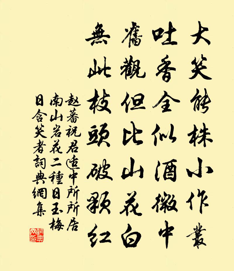詩詞名句歷史字典書法欣賞書法字典國語詞典說文解字康熙字典古漢語字典標 題 作 者 詩 句 祝君適中所所居南山岩花二種日玉梅日含笑者作者:趙蕃 朝代:宋代原文大笑能株小作叢,吐香全似酒微中。舊觀但比山花白,無此枝頭破顆紅。詩詞問答問:《祝君適中所所居南山岩花二種日玉梅日含笑者》的作者是誰?答:趙蕃問:該詩寫於哪個朝代?答:宋代書法欣賞祝君適中所所居南山岩花二種日玉梅日含笑者書法作品詩文賞析【原題】:祝君適中所所居南山岩花二種日玉梅日含笑者為況名乃適中自製人鮮知之題五絕以廣焉詩詞推薦奉送王信州崟北歸杜甫〔唐代〕朝廷防盜賊,供給愍誅求。下詔選郎署,傳聲能典州。蒼生今日困,天子向時憂。井屋有煙起,瘡痍無血流。壤歌頌證道歌證道歌釋印肅〔宋代〕明明佛敕曹溪是,曹溪一滴周天備。法身澄濟潤古今,飛空著地誰知貴。登峴亭司空曙〔唐代〕峴山回首望秦關,南向荊州幾日還。今日登臨唯有淚,不知風景在何山。蝶戀花·海燕雙來歸畫棟歐陽修〔宋代〕海燕雙來歸畫棟。簾影無風,花影頻移動。半醉騰騰春睡重。綠鬟堆枕香雲擁。翠被雙盤金縷鳳。憶得前春,有個寄靈隱惠明禪師釋重顯〔宋代〕海嶠生片雲,有時忽如蓋。不掛飛來峰,悠悠擬何待。出謁晚歸陸游〔宋代〕萬卷縱橫眼欲盲,偶隨尺一起柴荊。淵魚脫水知難悔,野鶴乘車只自驚。苑路落梅輕有態,御溝流水細無聲。紅麈炬長老請贊釋法薰〔宋代〕刀不自截,水不自洗。我真我贊,成何道理。請之既堅,卻之不已。有一句子,玄沙道底。憶江南詞三首白居易〔唐代〕江南好,風景舊曾諳;日出江花紅勝火,春來江水綠如藍。能不憶江南?江南憶,最憶是杭州;山寺月中尋桂子,宿銅陵寺題壁張耒〔宋代〕僧房秋夜月明天,下馬擁裘人悄然。老僧何事亦晨起,清磬一聲驚客眠。用韻贈小張兄新娶金履祥〔宋代〕洞房佳氣比椒蘭,刑至工夫自古難。莫使家人夸羯末,楊花飛處北風寒。代譚與可謝石大夫鄉飲酒劉宰〔宋代〕大夫舉酒屬青衿,八十衰翁亦許臨。要向席間明厚意,敢辭酒半效狂吟。持身勿使虧名義,學古還須探聖心。元日題何朝申所藏趙邈卓饞虎圖王灼〔宋代〕何日老於菟,失腳來空山。山中無所食,瘦骨見孱顏。舐掌鼓餓舌,始信擇肉艱。姑求一飽計,未肯藏榛菅。車師發楊港渡入交石夾四首楊萬里〔宋代〕入夾寬中窄,臨流慢處深。朝陽明眾岫,西崦自多陰。脫褲嗔人儉,提壺侑我斟。老來除飲外,半點沒春心。蝶戀花歐陽修〔宋代〕百種相思千種恨。早是傷春,那更春醪困。薄倖辜人終不憤。何時枕畔分明問。懊惱風流心一寸。強醉偷眠,也即蔡河漲二首張耒〔宋代〕渾渾雖未已,浩浩竟東歸。闊處長天近,澄邊一鳥飛。西風疏葦亂,斜日遠村微。淹泊從吾道,扁舟伴釣磯。和松坡劉迂詩二首廖行之〔宋代〕秋來吾亦愛吾廬,松菊交情未省疎。底逐風埃輕去魯,尚余客氣欠清除。香爐陸游〔宋代〕四座且莫喧,願聽歌一言。請說銅香爐,崔巍象南山。上枝似松柏,下根據銅盤。雕文各異類,離婁自相連。誰能玩丹砂 贈華亭李濟川馬鈺〔元代〕十一吾儕一個來。十人緣絆未心灰。莫教失腳落輪迴。早早投玄離苦海,閒閒鍊氣養靈胎。功成同去赴蓬萊。探梅楊公遠〔宋代〕竹杖芒鞋作興來,來時準擬有花開。誰知老樹荒煙里,地冷孤根暖未回。破山光明庵釋仲殊〔宋代〕身是光明幢,語是光明經。光明聚不散,妙是成真形。示現三界前,何勞問丹青。坐斷龍斗山,寶月孤亭亭。名句推薦而今燈漫掛。不是暗塵明月,那時元夜。蔣捷《女冠子·元夕》 龍噓氣成雲,雲固弗靈於龍也。韓愈《雜說一·龍說》 順天者存,逆天者亡。孟子《孟子·離婁章句上·第七節》 雨晴煙晚。綠水新池滿。馮延巳《清平樂·雨晴煙晚》 木謂之華,草謂之榮。佚名《爾雅·釋草》 吟懷未許老重陽,霜雪無端入鬢長。序燈《九日吳山宴集值雨次韻》 一番荷芰生池沼,檻前風送馨香。尹鶚《臨江仙·一番荷芰生池沼》 日光下澈,影布石上,佁然不動;柳宗元《小石潭記》 勿營華屋,勿謀良田。朱柏廬《朱子家訓·全文》 貂不足,狗尾續。房玄齡《晉書·列傳·第二十九章》
