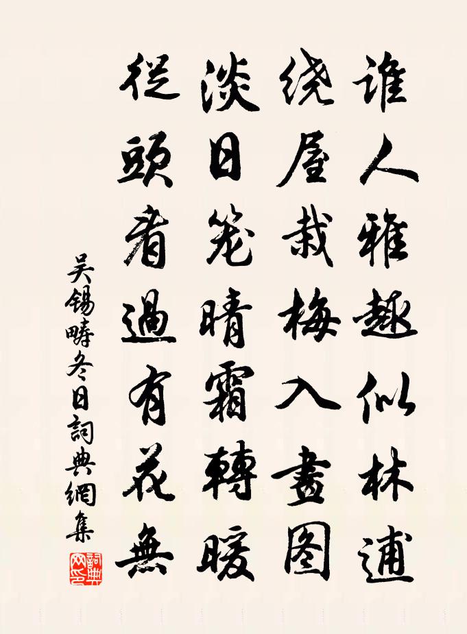 詩詞名句歷史字典書法欣賞書法字典國語詞典說文解字康熙字典古漢語字典標 題 作 者 詩 句 冬日作者:吳錫疇 朝代:宋代冬日原文誰人雅趣似林逋,繞屋栽梅入畫圖。淡日籠晴霜轉暖,從頭看過有花無。詩詞問答問:冬日的作者是誰?答:吳錫疇問:冬日寫於哪個朝代?答:宋代吳錫疇冬日書法欣賞冬日書法作品詩詞推薦虎邱遍觀題壁錢時〔宋代〕莫嗔魚目混摩尼,著目從頭亦自奇。但向壁間時得句,老夫不用更題詩。五郊樂章。雍和佚名〔唐代〕大樂稀音,至誠簡禮。文物棣棣,聲明濟濟。六變有成,三登無體。乃眷豐潔,恩覃愷悌。晚皈再度西橋四首楊萬里〔宋代〕皈近溪橋東復東,蓼花迎路舞西風。草深一鳥忽飛起,儂不覺他他覺儂。挽十尊長居士姚勉〔宋代〕聘君今已矣,月入少微星。又失宗盟長,空悲族譜亭。生芻嗟莫致,歌薤若為聽。只喜陰功在,三槐已綠庭。西湖王南一〔宋代〕翠巘嵯峨插鬥牛,仙家風景自清幽。從來此縣傳佳讖,就筑西湖占上流。層塔可梯升後進,五峰有路達前修。邦人感事詩寄韓侍郎晁說之〔宋代〕去年過卻京塵里,今日無煩嘆白頭。且喜歸來收客夢,何妨無酒破春愁。細教科樹鳥聲樂,遠使疏泉山影浮。晚得次韻何文縝墨梅二絕張子文〔宋代〕仙衣雲樣拂輕緇,林下神情特地宜。妒婦津頭風恐急,壞妝聊為變冰姿。老翁陸游〔宋代〕老翁垂七十,不復嘆頭顱。浩蕩新漁艇,凋零舊酒徒。嚴徐元袞袞,管葛亦區區。獨有欣然處,登山未用扶。西平樂(小石調)柳永〔宋代〕盡日憑高目,脈脈春情緒。嘉景清明漸近,時節輕寒乍暖,天氣才晴又雨。煙光淡盪,妝點平蕪遠樹。黯凝佇。台酹江月·夜涼黃升〔宋代〕西風解事,為人間、洗盡三庚煩暑。一枕新涼宜客夢,飛入藕花深處。冰雪襟懷,琉璃世界,夜氣清如許。劃然長聞歐陽永叔謫夷陵梅堯臣〔宋代〕昔在西都日,居常慷慨言。今嬰明主怒,直雪諫臣冤。謫向荊蠻地,行當霧雨繁。黃牛三峽近,切莫聽愁猿。次韻陳祭酒直舍犀方岳〔宋代〕西雝夜直秋風底,斷是龍涎不敢香。月府肯分金粟粟,書床相對玉琅琅。人間富貴夢不到,世外高寒味盡長。亦笑懷王彥博徐審知趙蕃〔宋代〕遮眼文書倦,可人親友賒。寸疏無更有,鴉斷直還斜。兩鬢寧禁白,餘生孰可涯。關餘三作徑,愧爾五其車。春陰陸游〔宋代〕數間茅屋傍楓林,常負平生萬里心。老去逐年增老病,春來無日不春陰。麴麈蘸岸波初漲,猩血團枝色已深。欲到舟行西湖詩贈諸友白玉蟾〔宋代〕二十年來雲水身,今凡七度踏京塵。絲長歲月能多少,粟大功名徒苦辛。白日戲陪人世事,綠煙鎖斷洞門春。雲岩藥洲方信孺〔宋代〕沙邱遺臭茂陵空,何物能成九轉功。地下劉郎猶有愧,駕言聊作葛仙翁。錦石岩某子發〔宋代〕倚空峻壁列松杉,水色嵐光總不凡。一段畫圖奇絕處,夕陽天際認歸帆。金盞兒劉志淵〔元代〕放心閒。樂林泉。山檀瓦鼎龍涎曖。寒*興,冷茶煙。情湛湛,腹便便。陪游鹿,伴啼猿。淨靈源。火生蓮。清涼勸忠樓崔鶠〔宋代〕聞說驪龍睡九淵,覺來頭角去升天。官封越國三千戶,血食新安五百年。錦軸尚標唐歲月,彩樓重見宋山川。收藏和晚醉金樓趙希逢〔宋代〕少年曾客帝王州,醉倒不知何處樓。厭飲清嘆成逐夜,時邀明月入簾鉤。名句推薦雙燕飛來,陌上相逢否?撩亂春愁如柳絮。馮延巳《鵲踏枝·幾日行云何處去》 酒盞旋將荷葉當。蓮舟盪。時時盞里生紅浪。歐陽修《漁家傲·花底忽聞敲兩槳》 紅臉青腰,舊識凌波女。晏幾道《蝶戀花·笑艷秋蓮生綠浦》 學而時習之,不亦說乎?佚名《論語十則》 賭勝馬蹄下,由來輕七尺。李頎《古意》 妙年出補父兄處,公自才力應時須黃庭堅《送范德孺知慶州》 若有知音見采,不辭遍唱陽春。晏殊《山亭柳·贈歌者》 春愁凝思結眉心,綠綺懶調紅錦薦。顧敻《玉樓春·拂水雙飛來去燕》 深秋簾幕千家雨,落日樓台一笛風。杜牧《題宣州開元寺水閣閣下宛溪夾溪居人》 道不同,不相為謀。孔子弟子《論語·衛靈公篇》