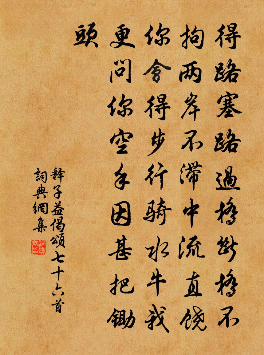 詩詞名句歷史字典書法欣賞書法字典國語詞典說文解字康熙字典古漢語字典標 題 作 者 詩 句 偈頌七十六首作者:釋子益 朝代:宋代偈頌七十六首原文得路塞路,過橋斷橋。不拘兩岸,不滯中流。直饒你會得步行騎水牛。我更問你,空手因甚把鋤頭。詩詞問答問:偈頌七十六首的作者是誰?答:釋子益問:偈頌七十六首寫於哪個朝代?答:宋代釋子益偈頌七十六首書法欣賞偈頌七十六首書法作品詩詞推薦走筆次李仁甫夜直觀月韻二首周必大〔宋代〕殿中延拜二卿真,腰下初橫寶帶新。便有堂封佳讖兆,移庖恰趁謝恩人。雜感顧禧〔宋代〕不與漁樵狎,甯知世事非。功成枯戰骨,發端誤儒衣。風雨槐陰夢,倉黃斗柄微。東鄰瓜正熟,把酒裛清輝。秋月李石〔宋代〕望崖相送欲凌虛,未擬邊州作陋居。法令牛毛紛可笑,使君馬尾自能書。白雲度嶺愁方寸,黃瘴埋沙費掃除。列戟戊戌冬護軍援廬濡自柵江入今日過之恍然如昨李曾伯〔宋代〕隔江屯塢自孫吳,猶記孤軍出此塗。閱十九年如夢覺,歷千萬里幾馳驅。月沉荒壘馬橫塞,風卷寒沙雁宿蘆。憶著送人紙筆王邁〔宋代〕阿連詩語已通神,玉版霜毫不厭珍,老我簿書安用此,自應回施與青春。示二子胡宏〔宋代〕此心妙無方,比道大無配。妙處果在我,不用襲前輩。得之眉睫間,直與天地對。混然員且成,萬古不破碎。郭園梅花梅堯臣〔宋代〕未逢柳條青,獨見梅蕊好。猶怯春風寒,不比江南早。清香拂酒杯,素色欺蓬葆。佳人金縷衣,唱徹嗟身老。新春感懷五首薛嵎〔宋代〕新種黃精助晚糧,生涯小小拙何妨。春風吹鬢不重綠,白日笑人長自忙。同觀陳十六史興碑高適〔唐代〕荊衡氣偏秀,江漢流不歇。此地多精靈,有時生才傑。伊人今獨步,逸思能間發。永懷掩風騷,千載常矻矻。新碑勸子瞻修無生法蘇轍〔宋代〕除卻靈明一一空,年來丹灶漫施功。掌中定有庵摩在,雲際懸知霧雨蒙。已賴信心留掣電,要須淨戒拂昏銅。誰言雲間洞天陳允平〔宋代〕門掩青松間綠槐,一奩圖畫自天開。朝霞煉藥黃金井,夜月吹笙白玉台。樹老有枝皆薜荔,地閒無處不莓苔。數聲承親戚見過生朝賦此為謝晁公溯〔宋代〕冠者五六人,駕言款吾門。是日射蓬矢,請壽此山樽。吾方念初生,非止祭特豚。保母親食我,卜士負且言。劬勞挽林紹伊二首吳芾〔宋代〕三朝褒舊德,一代仰名儒。晚歲持荷橐,頻年剖竹符。共期調鼎鼐,豈謂老江湖。身後知無憾,傳家有鳳雛。風劉克莊〔宋代〕風於天地間,惟桂尤其雄。將由岩竅多,或是地形穹。不知起何處,但覺來無窮。浮埃晦白晝,奇響激半空。一怒瑞鶴仙·秋感吳文英〔宋代〕淚荷拋碎璧。正漏雲篩雨,斜捎窗隙。林聲怨秋色。對小山不迭,寸眉愁碧。涼欺岸幘。暮砧催、銀屏剪尺。最無丁氏厚德堂戴表元〔宋代〕賤士懷永憂,一物常恐枯。貴者止營私,智或遺妻孥。肉食從古鄙,黃金使人愚。我游四十年,錢塘車馬區。但見演雅方岳〔宋代〕蠨蛸網羅遺逸,離留勸課農桑。鳴蜩吸風飲露,反舌吹笙鼓簧。飲酒 其五陶淵明〔魏晉〕結廬在人境,而無車馬喧。問君何能爾?心遠地自偏。採菊東籬下,悠然見南山。山氣日夕佳,飛鳥相與還。此中鄞中桃花渡即事釋文珦〔宋代〕城北桃花渡,樓居半海商。官河通遠浦,津樹雜高檣。旭日江煙暖,東風水草香。為看風土異,客子又懷鄉。壯別梁啓超〔清代〕極目鑒八荒,淋漓幾戰場。虎皮蒙鬼蜮,龍血混玄黃。世紀開新幕,風潮集遠洋。欲閒閒未 , 橫槊數興亡。名句推薦久廢山行疲犖确,尚能村醉舞淋浪。蘇軾《捕蝗至浮雲嶺山行疲苶有懷子由弟二首·其二》 君實欲民之眾而惡其寡,當蓄私不可不節。墨子《墨子·06章 辭過》 寂寞柴門村落里,也教插柳記年華。趙元鎮《寒食書事》 齊唱憲王春樂府,金梁橋外月如霜。李夢陽《汴京元夕》 猿啼客散暮江頭,人自傷心水自流。劉長卿《重送裴郎中貶吉州》 惟有今宵,皓彩皆同普。郭應祥《醉落魄·丙寅中秋》 曲港跳魚,圓荷瀉露,寂寞無人見。蘇軾《永遇樂·彭城夜宿燕子樓》 江山故宅空文藻,雲雨荒台豈夢思。杜甫《詠懷古蹟五首·其二》 下床著新衣,初學小姑拜。毛鉉《 * 詞·下床著新衣》 朝騁騖兮江皋,夕弭節兮北渚;屈原《九歌》