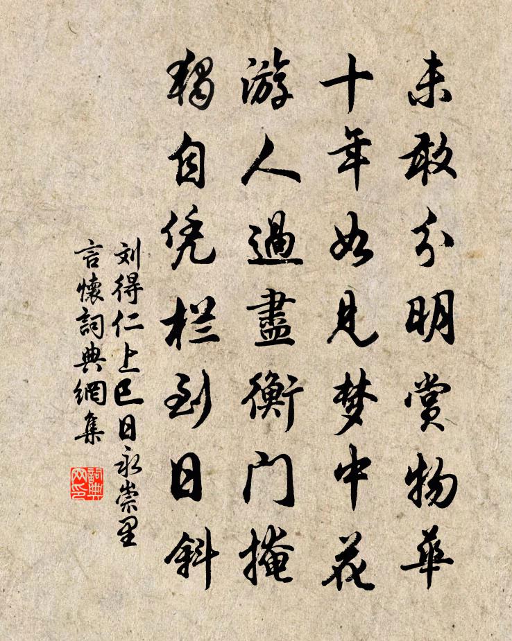詩詞名句歷史字典書法欣賞書法字典國語詞典說文解字康熙字典古漢語字典標 題 作 者 詩 句 上巳日永崇里言懷作者:劉得仁 朝代:唐代上巳日永崇里言懷原文未敢分明賞物華,十年如見夢中花。遊人過盡衡門掩,獨自憑欄到日斜。詩詞問答問:上巳日永崇里言懷的作者是誰?答:劉得仁問:上巳日永崇里言懷寫於哪個朝代?答:唐代問:上巳日永崇里言懷是什麼體裁?答:七絕劉得仁上巳日永崇里言懷書法欣賞上巳日永崇里言懷書法作品注釋全唐詩:卷545-25詩詞推薦泰和文天祥〔宋代〕書生曾擁碧油幢,恥與群兒共豎降。漢節幾回登快閣,楚囚今度過澄江。丹心不改君臣誼,清淚難忘父母邦。惟有海翻高駢〔唐代〕幾經人事變,又見海濤翻。徒起如山浪,何曾洗至冤?晚秋集晏太尉西園宋祁〔宋代〕造適銜杯醑,情來念物華。喬柯寒自籟,荒菊晚猶花。滾滾飄談麈,焞焞下日車。歸騶侵暝鼓,無復避堤沙。西江月 勸眾減睡尹志平〔元代〕夏日勤修寶殿,冬天好煉頑心。三更不縱睡魔侵。便是先生戒禁。學道休迷妄想,修真莫失叢林。無為功滿恣歌吟聲聲慢佚名〔宋代〕梅黃簾金重,雨簾細絲輕,簾園林霧煙如織。殿閣風微,簾外燕喧鶯寂。池塘彩鴛戲水,霧荷翻、千點珠滴。閒晝少年走馬行釋文珦〔宋代〕少年走馬去如飛,大笑吾衰行走遲。吾同君健應無日,君似吾衰定有時。烏兔交馳猶急傳,能令海水桑田變。物之感懷 其四王冕〔元代〕傍溪種篁竹,十年望成林。不圖列貨殖,願布九夏陰。變化期為至,枝葉漸蕭森。忽值桑田移,根苗竟沈沈。炙筠龍笛曲曹勛〔宋代〕美人滿酌金屈卮,勸我行樂當及時。艷歌流舞揚光暉。揚光輝,照春日。壽萬春,歡未畢。檢校金蓋別業周弼〔宋代〕獨棹一溪雲,山回景自分。露花藏岸勢,風葉亂泉紋。短箭催年急,微陽近草曛。斷猿將落木,清夜不堪聞。吳蠶何應龍〔宋代〕正是吳蠶出火時,交交窗外一禽啼。溪西有葉高難采,遙見青裙上竹梯。和徐叔子勸農韻呈留宰陳傅良〔宋代〕親從蓑笠問饑寒,赴愬人人得犯顏。更向棠陰聊憩茇,要令粒食共鮮艱。身歸雨露司存後,詩在山川刻畫間。飽飯為運使蔡國博壽二首衛涇〔宋代〕橘顆圍仙飽紫芝,菊潭釀酒拍金卮。九秋沆碭成功日,六轡光華初度時。試問江湖勞漕輓,何如朝夕密論思。預知雪中六解姜夔〔宋代〕萬馬行空轉屋檐,高寒屢索酒杯添。故人家住吳山上,借得西湖自捲簾。趙通判恭人周氏輓辭楊萬里〔宋代〕早與梁鴻隱,中隨士會歸。一門忠義氣,千古日星暉。紫告金花詔,青燈錦字機。西峰今夜月,墳是昔人非。越二年正旦又會宿猿洞程師孟〔宋代〕夜半春歸曉始驚,郁然佳氣入山亭。千門喜慶逢元日,一座光華見使星。難得同時傳壽斝,合將新句勒詩屏。漁郎逍遙詠宋太宗〔宋代〕一法從何有,三皇五帝前。周知多異境,猛利要精專。我命須依道,陰功及物緣。善心通感應,動靜理深玄。出都來陳,所乘船上有題小詩八首,不知何人蘇軾〔宋代〕煙火動村落,晨光尚熹微。田園處處好,淵明胡不歸。迎仙道中二首李彌遜〔宋代〕楓林慘澹遠山微,全是江南欲雪詩。極目諸天雲一色,只無六出上寒枝。觀獵行王邁〔宋代〕落日飛山上,山下人呼獵。出門縱步觀,無遑需屐屧。至則聞獵人,喧然肆牙頰。或言岐徑多,御者因追躡。或言即事二首陳杰〔宋代〕扁舟小系畫闌西,萬里晴光一拄頤。湖面俗包天外去,嶠鬟疑割海中來。高空自瀉軒皇樂,元氣長涵杜老詩。慶曆名句推薦不剪春衫愁意態。過收燈、有些寒在。史達祖《夜行船·正月十八日聞賣杏花有感》 家童掃蘿徑,昨與故人期。錢起《谷口書齋寄楊補闕》 玉輪碾平芳草,半面惱紅妝。陳子龍《訴衷情·春遊》 擬把傷離情緒,待曉寒重說。納蘭性德《好事近·簾外五更風》 風急桃花也似愁,點點飛紅雨。如晦《楚天遙過清江引·有意送春歸》 客心已百念,孤游重千里。何遜《相送》 三春已暮花從風,空留可憐與誰同。蕭衍《東飛伯勞歌》 謀泄者事無功,計不決者名不成。劉向《戰國策·齊三·楚王死》 崑山玉碎鳳凰叫,芙蓉泣露香蘭笑。李賀《李憑箜篌引》 兼相愛,交相利。墨子《墨子·15章 兼愛(中)》