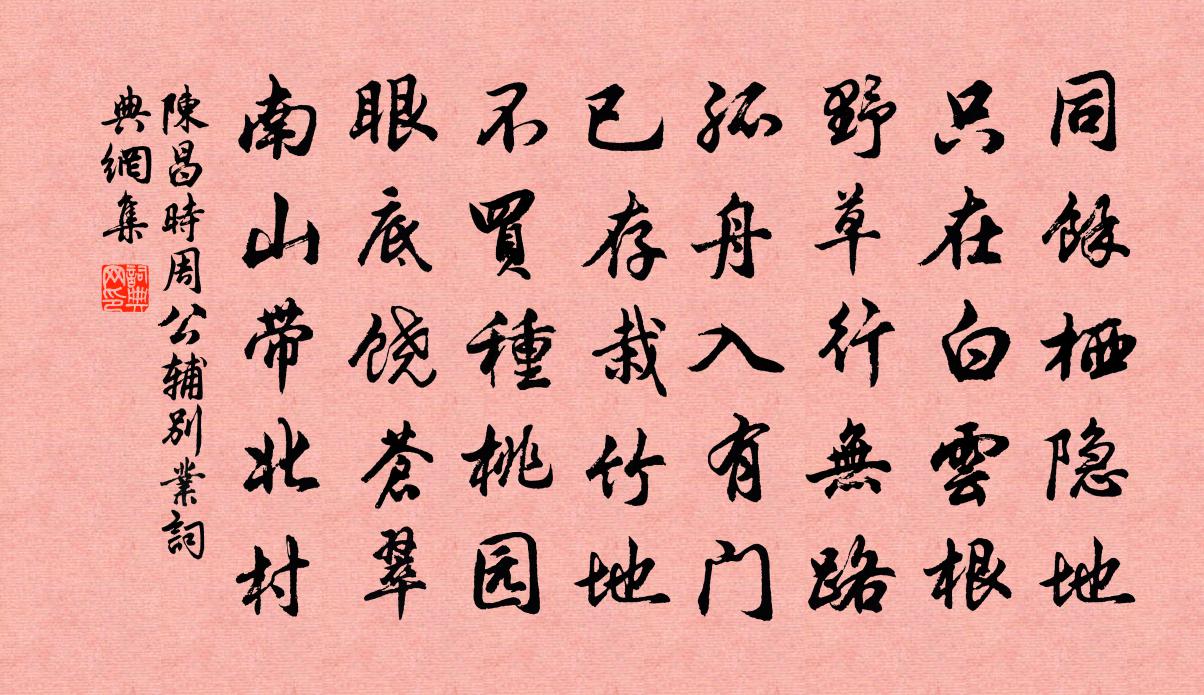 詩詞名句歷史字典書法欣賞書法字典國語詞典說文解字康熙字典古漢語字典標 題 作 者 詩 句 周公輔別業作者:陳昌時 朝代:宋代周公輔別業原文同餘棲隱地,只在白雲根。野草行無路,孤舟入有門。已存栽竹地,不買種桃園。眼底饒蒼翠,南山帶北村。詩詞問答問:周公輔別業的作者是誰?答:陳昌時問:周公輔別業寫於哪個朝代?答:宋代陳昌時周公輔別業書法欣賞周公輔別業書法作品詩詞推薦謝龍山惠柱杖並求石銚四首馬廷鸞〔宋代〕捷徑新來競朵頤,登山有道只逶遲。瘦藤獨立西風上,看盡坡頭萬馬馳。南柯子侯善淵〔元代〕坐看華胥景,神遊玩寶方。一雙童子抱龍光。煥煥煌煌,撮聚入中央。產出靈仙子,功成入帝鄉。玉霄榜上應科場浣溪沙(野色軒看玉色木犀)韓淲〔宋代〕月角珠庭映伏犀。扶搖當上鳳凰池。廣寒曾折最高枝。壯志還同諸葛膝,清名還似紫芝眉。梅花春壽酒行遲。送丁正臣知蔡州司馬光〔宋代〕{趨芻換參}{潭氵換走}汝水濱,千騎擁朱輪。懸瓠遺基古,鞶囊吉夢新。丹心留紫闥,清耳遠紅塵。須識明君伯夷詩強至〔宋代〕昔紂為不道,毒心無生靈。四海如在鼎,誰能救將烹。周武從天人,戎衣舉仁兵。伯夷獨何為,乃諫不聽行。紂徒螢王鎡〔宋代〕竹風吹動草根塵,熠熠高底自照身。每夜囊盛光到曉,書齋送輿少燈人。獻僕射相公王禹偁〔宋代〕五年黃閣掌陶甄,憂國翻成兩鬢斑。初到廟堂溫樹冷,暫收霖雨岳雲閒。春園領鶴尋芳草,小閣留僧畫遠山。惟有禪人並化主寫真求贊釋正覺〔宋代〕發雪衰白而春晝長,目光寒碧而秋波揚。采華之滋而蜜蜂忙,齊物之夢而蝴蝶狂。體空影響,機動陰陽。應天長(蘇堤春曉)佚名〔宋代〕曙林帶暝,睛靄弄霏,鶯花未認遊客。草色舊迎雕輦,蒙茸暗香陌。鞦韆架,閒曉索。正露洗、繡鴛痕窄。費人省送靳十五侍御使蜀孫逖〔唐代〕天使出霜台,行人擇吏才。傳車春色送,離興夕陽催。驛繞巴江轉,關迎劍道開。西南一何幸,前後二龍來。仙鄉子侯善淵〔元代〕咄這醜形骸。臭穢蛆蟲塞滿懷。地水火風虛積聚,沉埋。類我平生惹禍災。欲免死生催。莫執凡軀作聖胎。保煉琅堦基李覯〔宋代〕堂前一級似堦墀,無石無甎只舊基。泥飾頃因年節近,蹋崩唯是客行時。誰曾羅襪雙來上,多謝蒼苔久不離。從此渡浙江陳陶〔唐代〕適越一輕艘,凌兢截鷺濤。曙光金海近,晴雪玉峰高。靜寇思投筆,傷時欲釣鰲。壯心殊未展,登涉漫勞勞。受恩深王哲〔元代〕性亂因醪誤。精枯緣色妒。眼神傷敗,被財役住。鼻濁如何,只為氣使馨清去。浮世人難悟。*四事相牽,淪落苦隆佑太后輓歌辭三首劉子翬〔宋代〕三朝欽母訓,四海被仁風。倉卒垂簾政,艱難取日功。仙遊睽懿範,孝慕慘皇衷。寢隧休華飾,靈輀必返嵩。醉後題李馬二妓白居易〔唐代〕行搖雲髻花鈿節,應似霓裳趁管弦。艷動舞裙渾是火,愁凝歌黛欲生煙。有風縱道能回雪,無水何由忽吐蓮?疑是偈頌一百零二首釋紹曇〔宋代〕活鱍鱍,硬糾糾,明眼人覷不透。剛被春山杜宇知,點血啼清晝。臨風{左足右孛}跳撼坤維,驢前馬後。海雲回,按驍騎於城北原,時有吐番出沒大渡范成大〔宋代〕古道風沙卷夕霏,小江煙浪皺春漪。天於麥壟猶慳雪,人向梅梢大欠詩。頓轡青驪飛脫兔,離弦白羽嘯寒鴟。牙門治圃曹勛〔宋代〕腰斧治小圃,樸樕久不省。妒芽盡芟除,條達出秀整。臨津獲梅株,蓓玉作寒炯。三繞無所裁,留看橫斜影。自責朱淑真〔宋代〕悶無消遣只看詩,不見詩中話別離。添得情懷轉蕭索,始知伶俐不如痴。名句推薦此情可待成追憶?只是當時已惘然。李商隱《錦瑟》 物雖小,勿私藏。苟私藏,親心傷。李毓秀《弟子規·入則孝》 草色全經細雨濕,花枝欲動春風寒。王維《酌酒與裴迪》 草木也知愁,韶華竟白頭。曹雪芹《唐多令·柳絮》 不聞爺娘喚女聲,但聞黃河流水鳴濺濺。佚名《木蘭詩 / 木蘭辭》 蛺蝶飛來過牆去,卻疑春色在鄰家。王駕《雨晴》 紅豆生南國,春來發幾枝。王維《相思》 漢帝重阿嬌,貯之黃金屋。李白《妾薄命》 其服不同,其行猶一也。墨子《墨子·48章 公孟》 妙極生知,睿哲惟宰。精理為文,秀氣成采。劉勰《文心雕龍·徵聖》