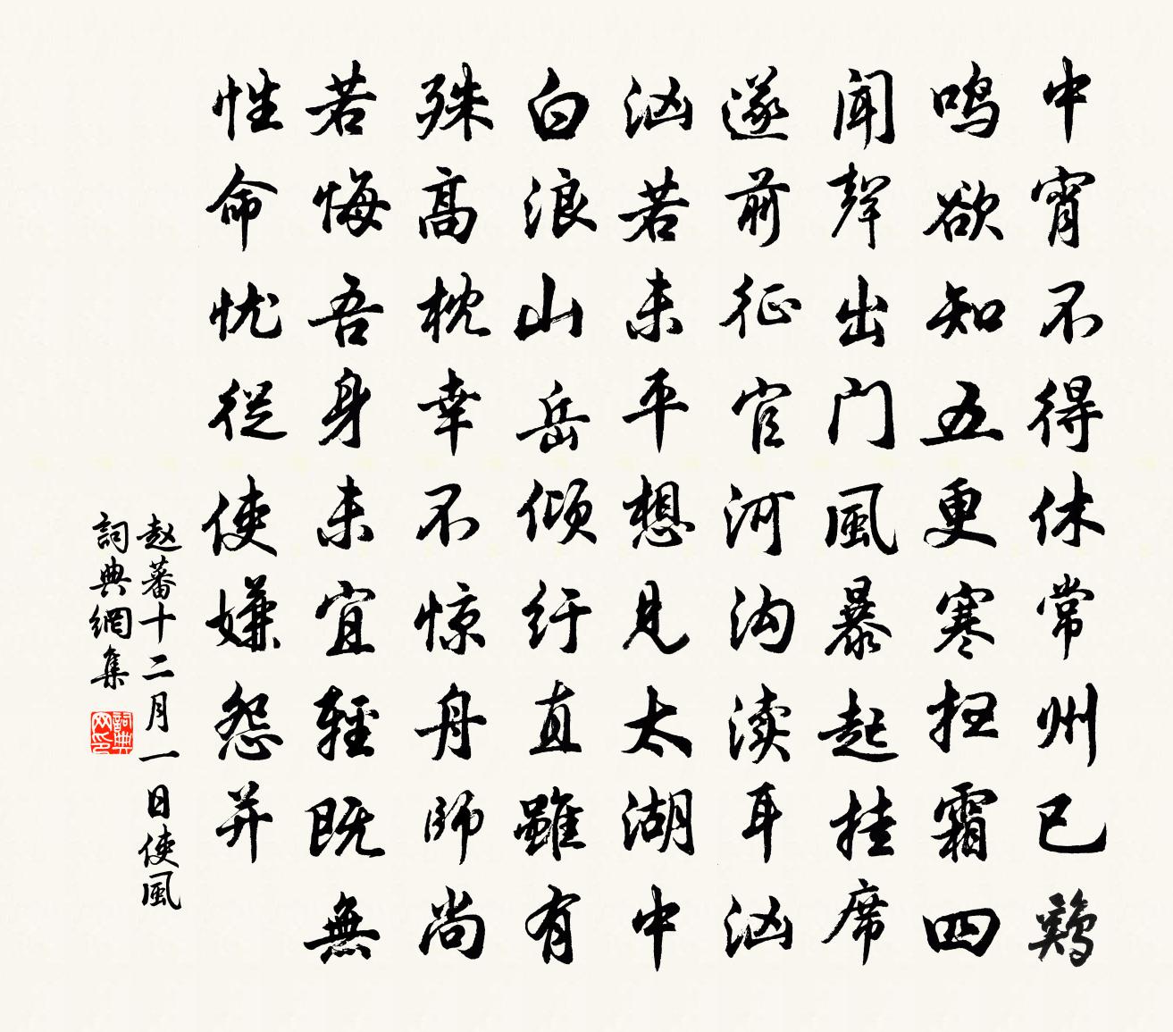 詩詞名句歷史字典書法欣賞書法字典國語詞典說文解字康熙字典古漢語字典標 題 作 者 詩 句 十二月一日使風作者:趙蕃 朝代:宋代十二月一日使風原文中宵不得休,常州已雞鳴。欲知五更寒,掃霜四聞聲。出門風暴起,掛席遂前征。官河溝瀆耳,洶洶若未平。想見太湖中,白浪山嶽傾。紆直雖有殊,高枕幸不驚。舟師尚若悔,吾身未宜輕。既無性命憂,從使嫌怨並。詩詞問答問:十二月一日使風的作者是誰?答:趙蕃問:十二月一日使風寫於哪個朝代?答:宋代趙蕃十二月一日使風書法欣賞十二月一日使風書法作品詩詞推薦夏初湖村雜題陸游〔宋代〕幽禽兩兩已成巢,新竹森森漸放梢。稻壟作陂先蓄水,野堂防漏卻添茅。別王十後遣京使累路附書杜牧〔唐代〕重關曉度宿雲寒,羸馬緣知步步難。此信的應中路見,亂山何處拆書看?殘句有客打碑來薦福蘇軾〔宋代〕有客打碑來薦福,無人騎鶴上揚州。留題延生觀後山上小堂蘇軾〔宋代〕溪山愈好意無厭,上到巉第幾尖。深谷野禽毛羽怪,上方仙子鬢眉纖。不慚弄玉騎丹鳳,應逐嫦娥駕老蟾。澗草岩題花山寺壁蘇舜欽〔宋代〕寺里山因花得名,繁英不見草縱橫。栽培剪伐須勤力,花易凋零草易生。中秋月蝕邦人鳴鉦救月不約而齊中原舊俗猶有家鉉翁〔宋代〕大化周流不暫停,從來息處見其生。冰輪萬古長如此,本體何曾有晦明。送沈左司從汪參政分省高啟〔明代〕重臣分陝去台端,賓從威儀盡漢官。四塞河山歸版籍,百年父老見衣冠。函關月落聽雞度,華岳雲開立馬看。知爾祗答公序相國二兄見寄二首宋祁〔宋代〕前時同出守,星鬢各蕭蕭。蹊李伐不食,原禽行自搖。棹前饒沸浪,蓬處但驚飈。素願山林隱,公乎不在招。送陳太祝歸河陽梅堯臣〔宋代〕羸馬度關去,夜向河橋歸。水風來何急,吹裂遊子衣。到家莫久留,速書赴禮闈。大對必有蘊,時哉無闊稀。過介庵舊宅趙蕃〔宋代〕悠悠西州路,慘慘日暮雲。天不慦此老,世孰張吾軍。成都揚雄宅,青山太白墳。可憐車馬跡,不如鷗鷺群。蠶盧梅坡〔宋代〕春蠶運巧起經綸,底事周防反殺身。鼎鑊如歸緣報主,羞他肥祿避危人。贈嗣直弟頌十首黃庭堅〔宋代〕饑渴隨時用,悲歡觸事真。十方無壁落,中有昔怨人。句卞震〔宋代〕老筇支瘦影,寒木憑吟身。家釀頗勁戲作陸游〔宋代〕千古英雄骨作塵,不如一醉卻關身。鼎來雖恨王陵戇,熟味方知孟子醇。試問浩歌遺世事,何如酣枕養天真?竹林宿村舍陸游〔宋代〕驢瘦童僵小作程,村翁也復解逢迎。霜林已熟燈相饋,雪窖初開芋可羹。土榻圍爐豆楷暖,荻簾當戶布機鳴。解囊石門新營所住四面高山回溪石瀨茂林修竹詩謝靈運〔南北朝〕躋險築幽居。披雲臥石門。苔滑誰能步。葛弱豈可捫。裊裊秋風過。萋萋春草繁。美人游不還。佳期何由敦。芳塵田父吟五首葉茵〔宋代〕老天應是念農夫,萬頃黃雲著地鋪。有谷未為兒女計,半償私債半官租。舊將任隨〔宋代〕幾年塵虜復征蠻,分閫功成兩鬢斑。新畫儀形當漢閣,舊銘勳業在燕山。龍泉照步文犀澀,馬埒堆金駿足閒。時泰明發金陵晨炊義井楊萬里〔宋代〕薄薄雲收日,霏霏雨散池。平波光去遠,疏點暈來遲。所部余千里,初程第一詩。先驅問行李,雙堠且晨炊。次韻答陳殿丞見寄李覯〔宋代〕顛倒江湖二十春,乾時的是妄庸人。先容不肯收蟠木,高足無從得要津。眾與善名酬苦志,莫將吟味養閒身。食田名句推薦香非在蕊,香非在萼,骨中香徹。晁補之《鹽角兒·亳社觀梅》 江寒水不流,魚嚼梅花影。釋敬安《題寒江釣雪圖》 露葉翻風驚鵲墜。暗落青林紅子。陳師道《清平樂·秋光燭地》 從此擾擾攘攘,又不知夢醒何時耳。沈復《浮生六記·坎坷記愁》 無言暗將紅淚彈闌珊,香銷輕夢還納蘭性德《河傳·春淺》 雪裡溫柔,水邊明秀,不借春工力。辛棄疾《念奴嬌·梅》 一疑一信相參勘,勘極而成知者,其知始真。洪應明《菜根譚·概論》 十二峰頭秋草荒,冷煙寒月過瞿塘。何景明《竹枝詞·十二峰頭秋草荒》 赤闌橋盡香街直,籠街細柳嬌無力。陳克《菩薩蠻·赤闌橋盡香街直》 籬落疏疏一徑深,樹頭花落未成陰。楊萬里《宿新市徐公店》